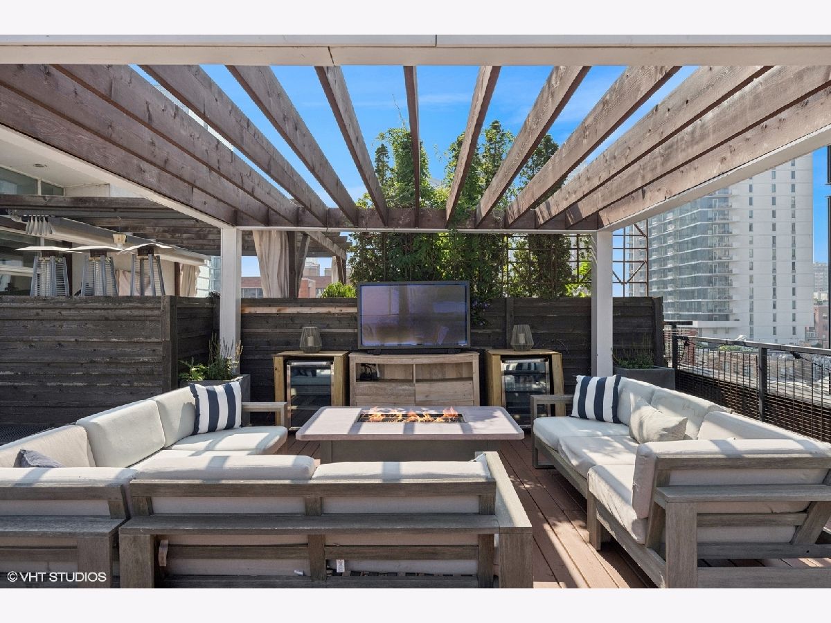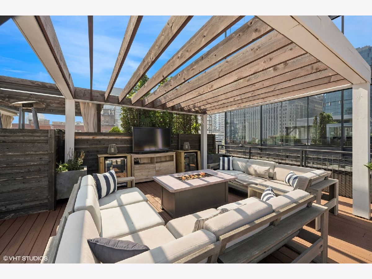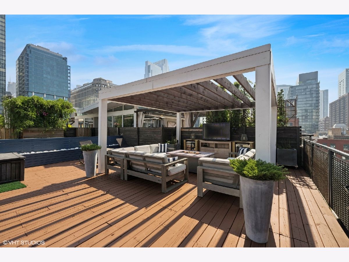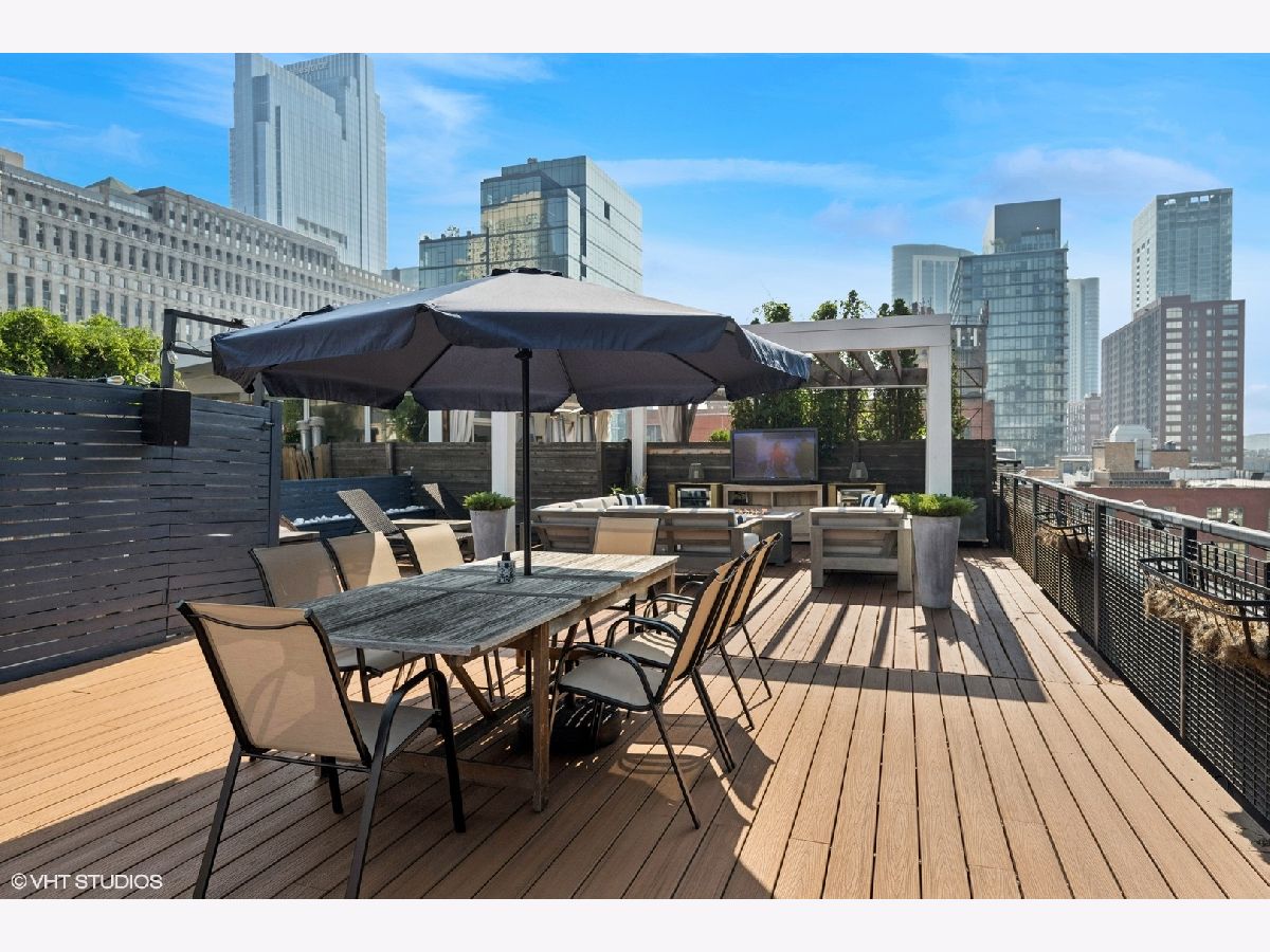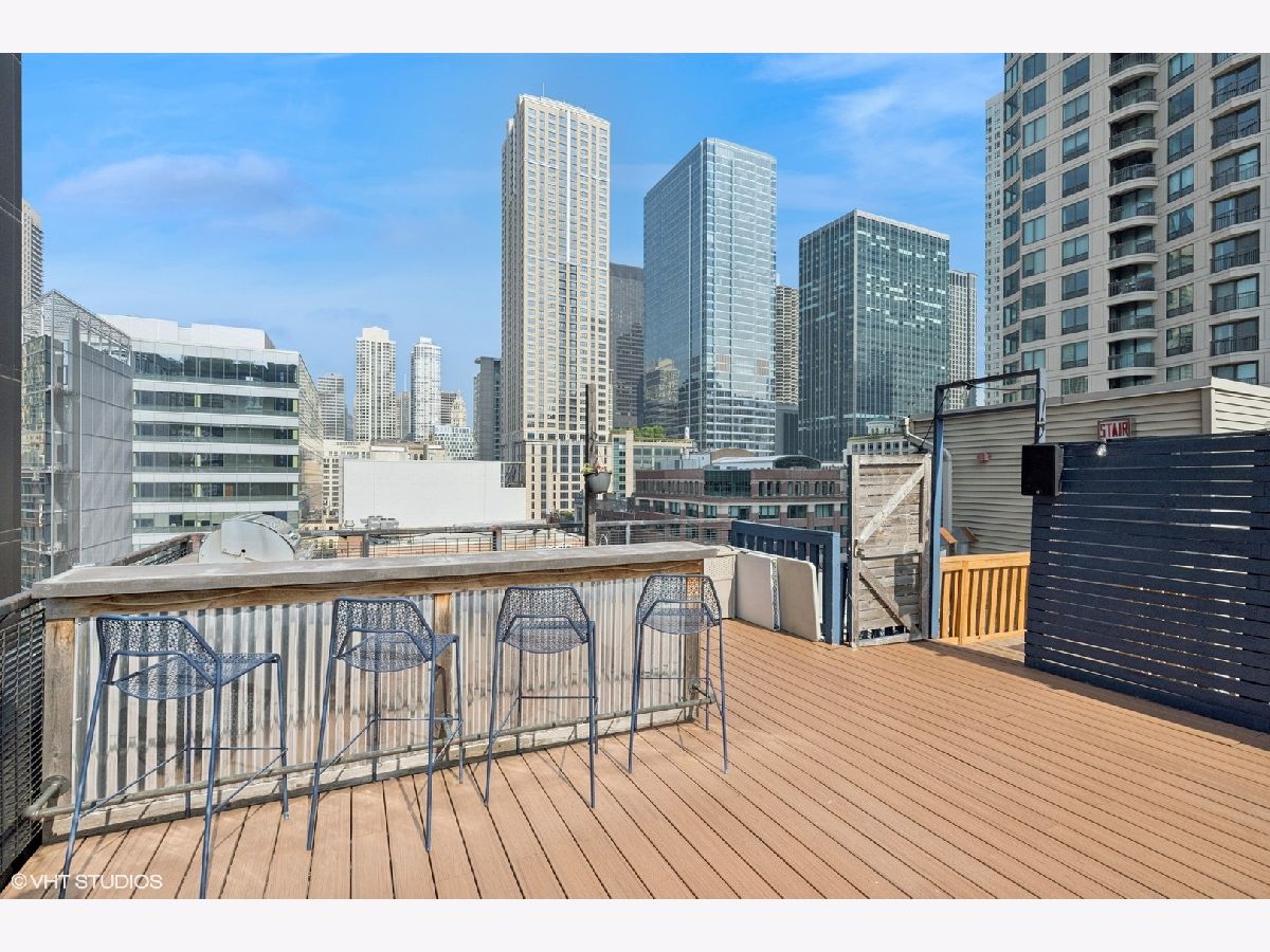 Welcome to 154 W Hubbard - a chic and stylish loft with an impressive 1500 SF private roof deck showcasing stunning 360-degree city views. Flooded with north and east-facing light, this residence wows with its soaring 14 ft ceilings, exposed brick, hardwood flooring throughout, and sleek finishes. The entryway makes an impression with a built-in custom leather-upholstered bench with storage. The expansive floor plan flows seamlessly throughout the living space, creating the perfect space to entertain. A sun-filled living/dining area has ample room for substantial seating areas, a large dining table, a piano, or perhaps a pool table. A balcony off the living room provides the perfect place to grill. The living space opens to an exquisite kitchen, which was fully upgraded with upscale finishes in 2020 and features an oversized island with matching countertops and backsplash, custom cabinet system, and Sub-Zero, Bosch, and Viking appliances including a wine fridge. The third bedroom space is currently configured as an open den just off the kitchen with a dry bar. The primary suite has a graciously sized bedroom with a custom walk-in closet. Completely renovated in 2024, the ensuite primary bath was transformed into a spa-style retreat offering a steam shower, heated floors, new stone flooring and walls, a double sink, and private commode. The second bedroom is located across the hall from an elegantly appointed full bath with shower. A large in-unit laundry room with new LG washer and dryer offers additional storage space. The 1500 SQFT private rooftop deck has a pergola-covered seating area with firepit, an outdoor kitchen with bar seating, and newly stained flooring as of June 2025. This incredible space is perfect for entertaining guests or simply relaxing. Heated, attached garage parking for one car is included in the price. This boutique elevator building has a friendly tight-knit community with proactive homeowners. Located in the heart of Chicago's vibrant River North neighborhood, this home is just steps from eclectic restaurants, bars, shopping, grocery stores, coffee shops, and public transportation.