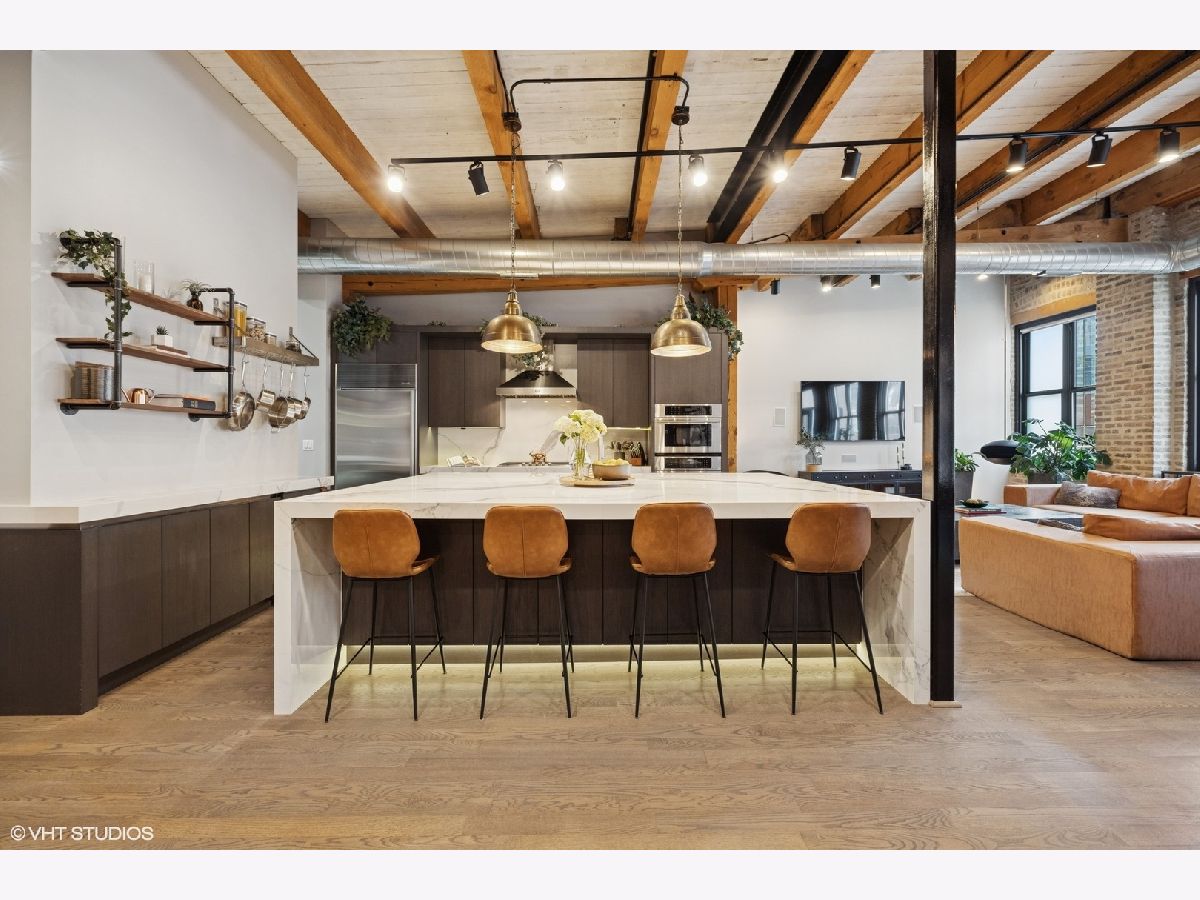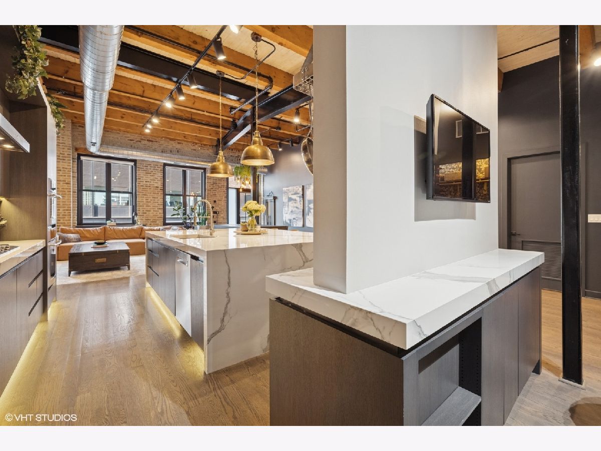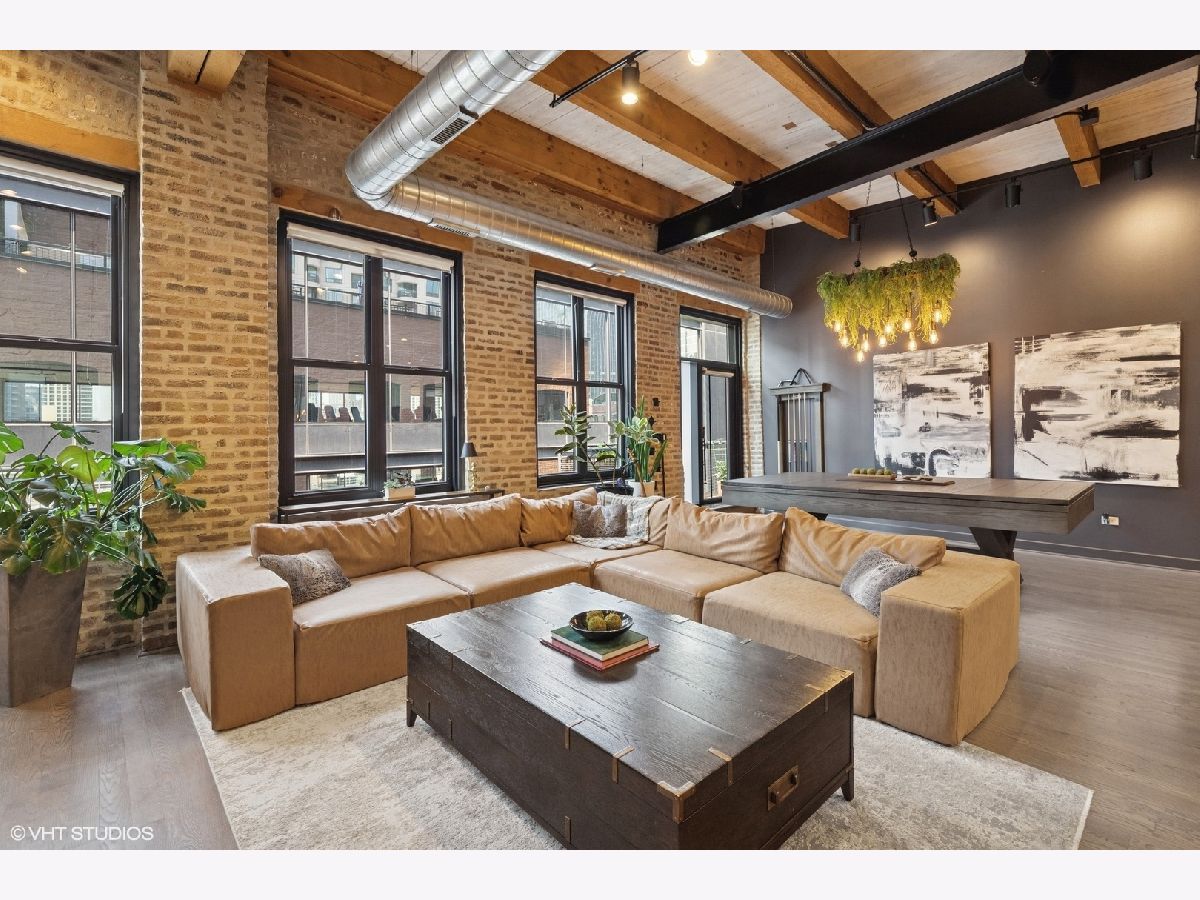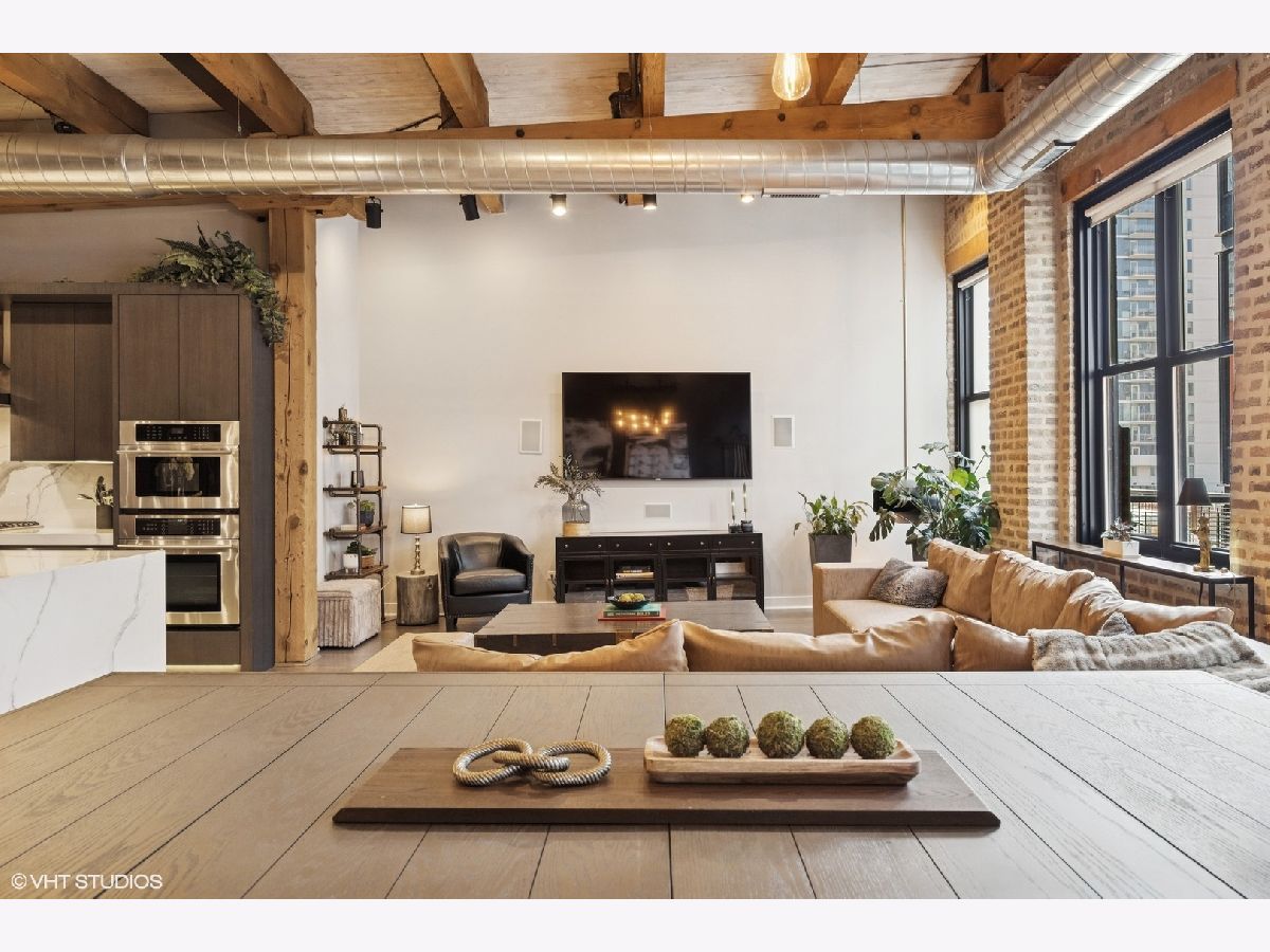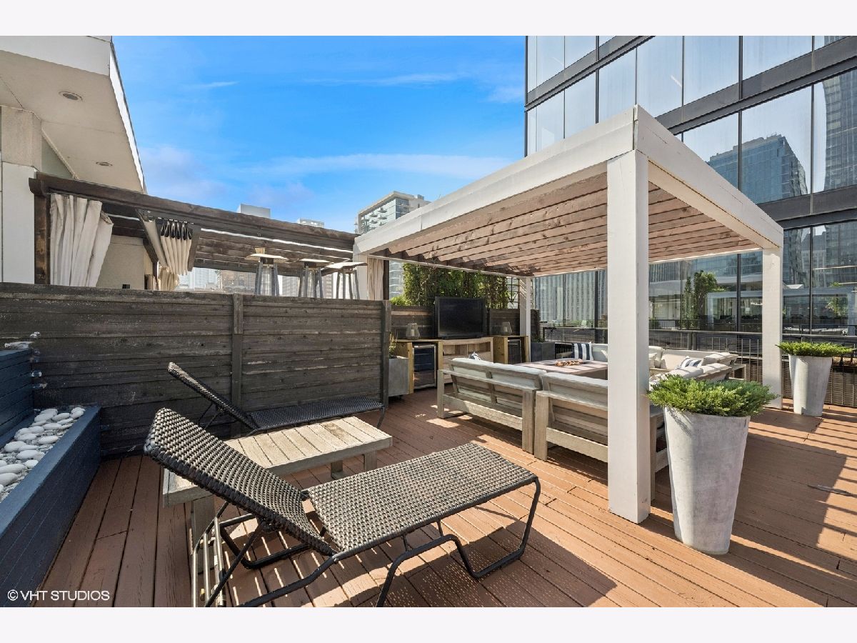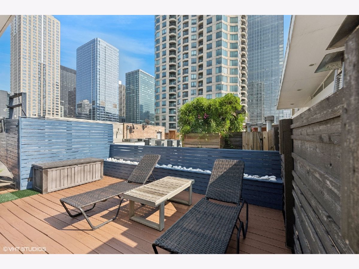 Welcome to 154 W Hubbard - a chic and stylish loft with an impressive 1500 SF private roof deck showcasing stunning 360-degree city views. Flooded with north and east-facing light, this residence wows with its soaring 14 ft ceilings, exposed brick, hardwood flooring throughout, and sleek finishes. The entryway makes an impression with a built-in custom leather-upholstered bench with storage. The expansive floor plan flows seamlessly throughout the living space, creating the perfect space to entertain. A sun-filled living/dining area has ample room for substantial seating areas, a large dining table, a piano, or perhaps a pool table. A balcony off the living room provides the perfect place to grill. The living space opens to an exquisite kitchen, which was fully upgraded with upscale finishes in 2020 and features an oversized island with matching countertops and backsplash, custom cabinet system, and Sub-Zero, Bosch, and Viking appliances including a wine fridge. The third bedroom space is currently configured as an open den just off the kitchen with a dry bar. The primary suite has a graciously sized bedroom with a custom walk-in closet. Completely renovated in 2024, the ensuite primary bath was transformed into a spa-style retreat offering a steam shower, heated floors, new stone flooring and walls, a double sink, and private commode. The second bedroom is located across the hall from an elegantly appointed full bath with shower. A large in-unit laundry room with new LG washer and dryer offers additional storage space. The 1500 SQFT private rooftop deck has a pergola-covered seating area with firepit, an outdoor kitchen with bar seating, and newly stained flooring as of June 2025. This incredible space is perfect for entertaining guests or simply relaxing. Heated, attached garage parking for one car is included in the price. This boutique elevator building has a friendly tight-knit community with proactive homeowners. Located in the heart of Chicago's vibrant River North neighborhood, this home is just steps from eclectic restaurants, bars, shopping, grocery stores, coffee shops, and public transportation.