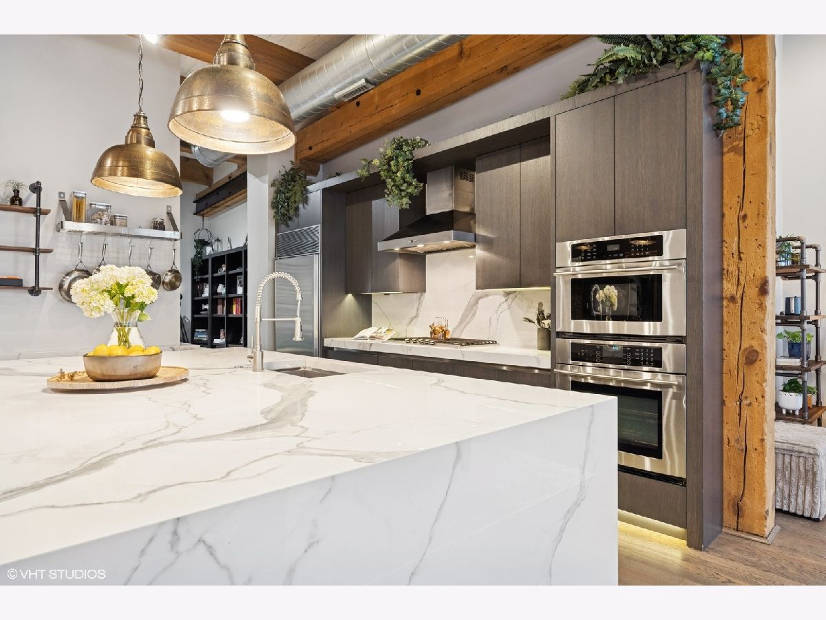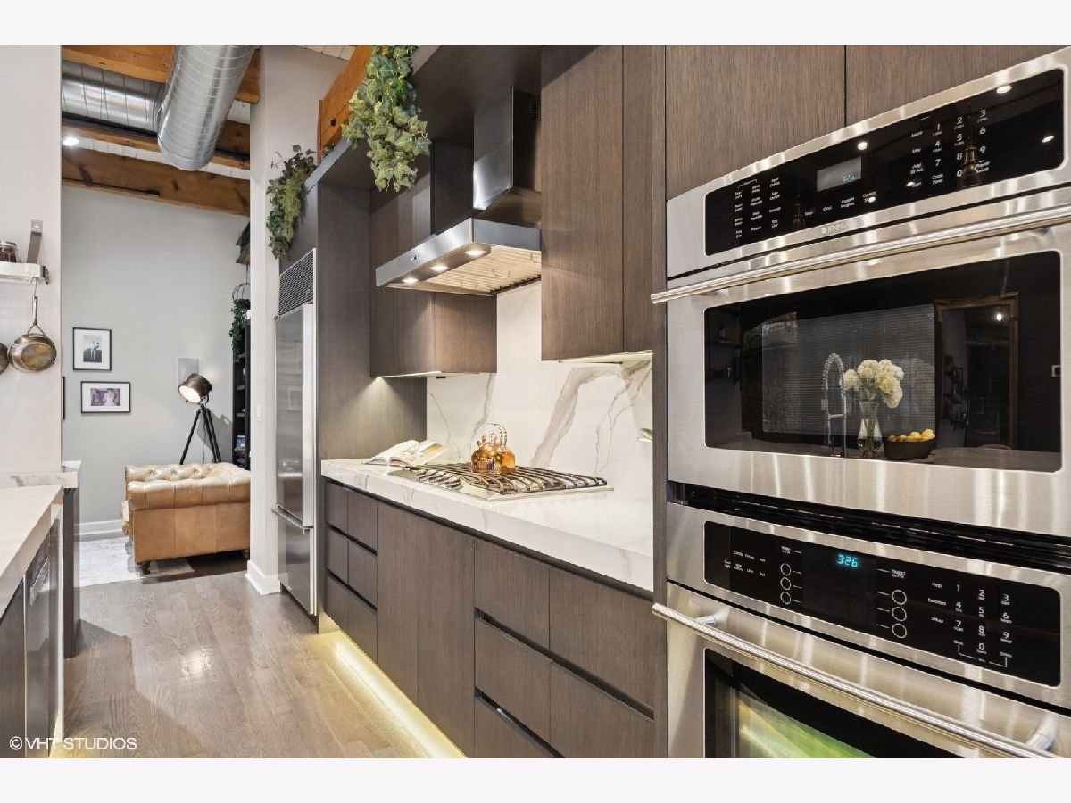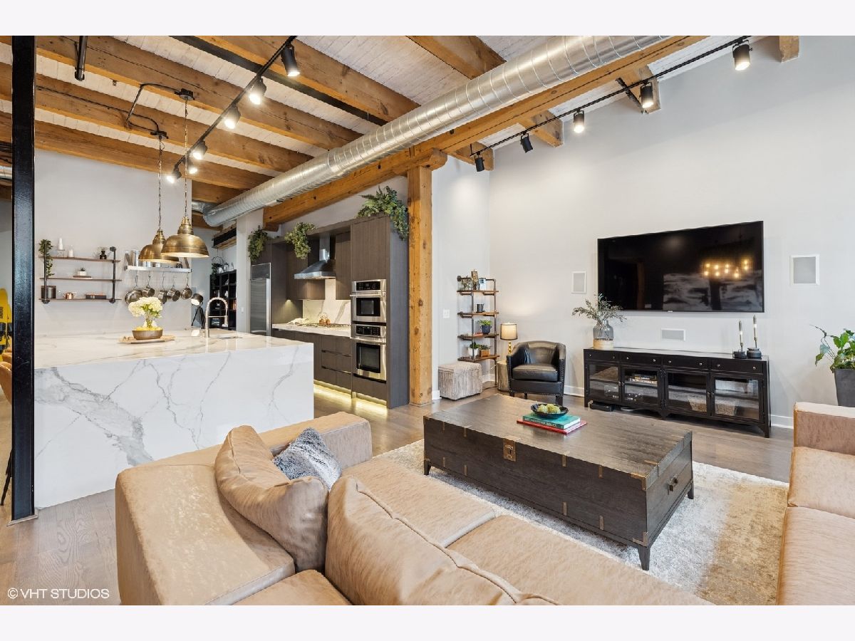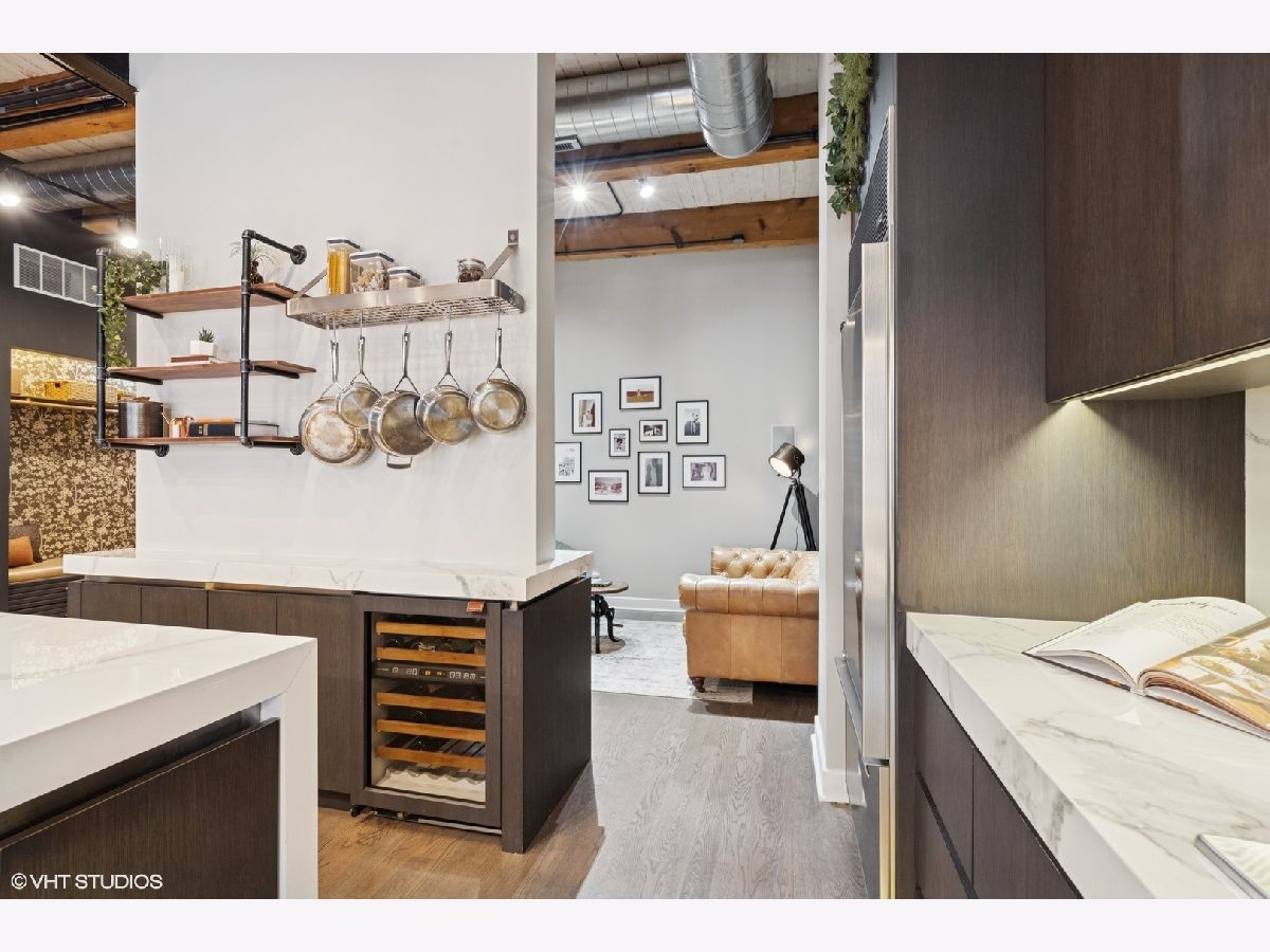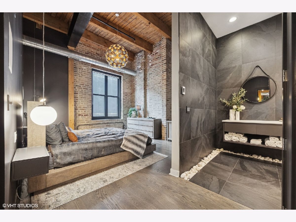 Welcome to 154 W Hubbard - a chic and stylish loft with an impressive 1500 SF private roof deck showcasing stunning 360-degree city views. Flooded with north and east-facing light, this residence wows with its soaring 14 ft ceilings, exposed brick, hardwood flooring throughout, and sleek finishes. The entryway makes an impression with a built-in custom leather-upholstered bench with storage. The expansive floor plan flows seamlessly throughout the living space, creating the perfect space to entertain. A sun-filled living/dining area has ample room for substantial seating areas, a large dining table, a piano, or perhaps a pool table. A balcony off the living room provides the perfect place to grill. The living space opens to an exquisite kitchen, which was fully upgraded with upscale finishes in 2020 and features an oversized island with matching countertops and backsplash, custom cabinet system, and Sub-Zero, Bosch, and Viking appliances including a wine fridge. The third bedroom space is currently configured as an open den just off the kitchen with a dry bar. The primary suite has a graciously sized bedroom with a custom walk-in closet. Completely renovated in 2024, the ensuite primary bath was transformed into a spa-style retreat offering a steam shower, heated floors, new stone flooring and walls, a double sink, and private commode. The second bedroom is located across the hall from an elegantly appointed full bath with shower. A large in-unit laundry room with new LG washer and dryer offers additional storage space. The 1500 SQFT private rooftop deck has a pergola-covered seating area with firepit, an outdoor kitchen with bar seating, and newly stained flooring as of June 2025. This incredible space is perfect for entertaining guests or simply relaxing. Heated, attached garage parking for one car is included in the price. This boutique elevator building has a friendly tight-knit community with proactive homeowners. Located in the heart of Chicago's vibrant River North neighborhood, this home is just steps from eclectic restaurants, bars, shopping, grocery stores, coffee shops, and public transportation.