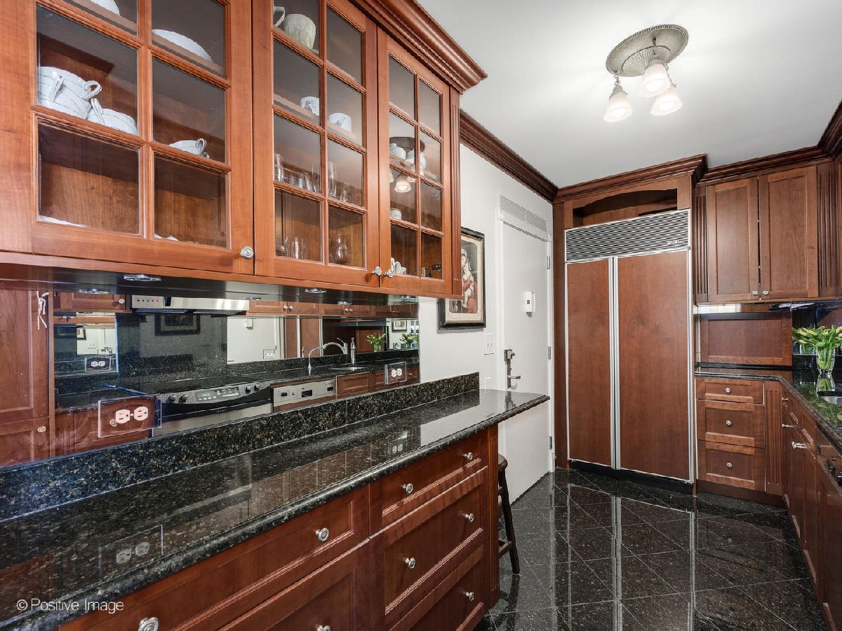 Breathtaking lake views take center stage in this rarely available, preferred A-tier residence at 1550 N. Lake Shore Drive. Framed by oversized picture windows, the gracious great room captures uninterrupted blue-water vistas stretching from the curve of North Avenue Beach to the fireworks of Navy Pier-a sweeping shoreline panorama that becomes the home's serene, ever-changing backdrop from sunrise through sunset. Approximately 1,400 square feet, the residence was originally configured as a two-bedroom and has been thoughtfully opened to create an expansive one-bedroom, two-bath layout, ideal as an elegant pied-a-terre or second home. The open-concept great room, complete with a dry bar with wine refrigerator, offers exceptional scale for entertaining while keeping the dramatic lakefront setting front and center. Classic architectural detailing includes crown molding, wainscoting, elegant paneled window airconditioner covers, and custom built-in bookshelves with a media center that add depth and character while allowing the lakefront setting to remain the focal point. Natural-finish oak flooring runs throughout, and recently painted interiors are illuminated by elegant, whimsical chandeliers that add warmth and personality. The spacious primary suite is complemented by a beautifully appointed Calacatta marble bath with a separate makeup vanity. The guest bath is finished in Irish Brown marble. Both baths feature Edwardian exposed-pipe chrome tub and shower fixtures with porcelain handles and distinctive sunflower showerheads. The kitchen features cherry cabinetry with glass-front uppers, granite countertops, and integrated panel SubZero refrigerator. Custom closet systems throughout provide exceptional organization and storage capacity. Located just steps from North Avenue Beach, Lincoln Park, Lincoln Park Lagoon and the lakefront trail, the home offers immediate access to one of Chicago's most beloved and iconic stretches of shoreline. The nearby roundabout and expansive Lincoln Park create a particularly welcoming environment for pet owners, walkers, runners, and anyone who enjoys an active lakefront lifestyle. This is a rare opportunity to own a graciously scaled, preferred-tier twelfth-floor residence in one of Chicago's most coveted full-service buildings, where the lakefront, from beach to skyline, defines the experience of Home. The building has recently completed the rooftop deck, plumbing risers, lobby, hallways, and elevators. 1550 N. Lake Shore Drive is a dog friendly building, allows in-unit washer and dryer, and has garage parking onsite. All disclosures, the one bed and two bed floorplan, 2026 budget and move in packet may be found under the additional information tab.