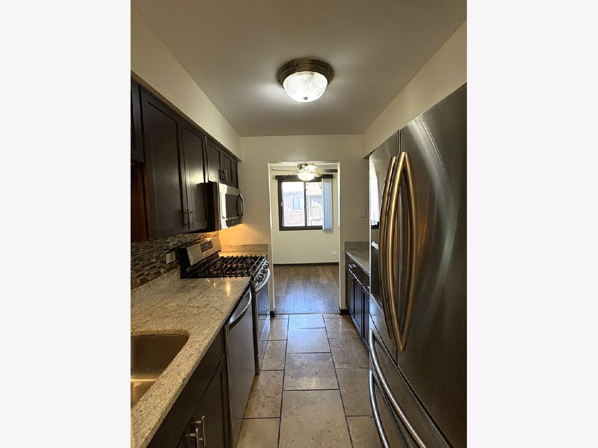 Beautiful updated top floor unit featuring 2 bedrooms and 1 1/2 baths. Lovely kitchen with granite tops, glass tile back-splash, travertine tiled floors, stainless steel appliances and maple cabinets. The living room and dining room combo has laminate hardwood flooring. Freshly painted a nice neutral color. Both bathrooms are updated with granite tops, travertine flooring, and the main bath has a beautiful shower with tile and clear glass frameless door. Huge walk in closet for ample storage. 2 permit parking spaces included. Large Balcony. Conveniently located close to restaurants, shopping, transportation, forest preserves & walking trails.