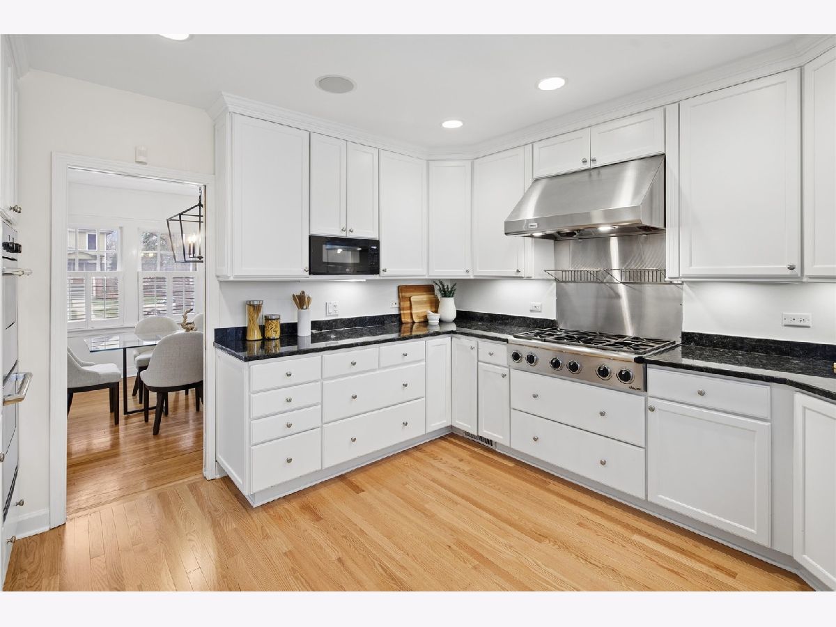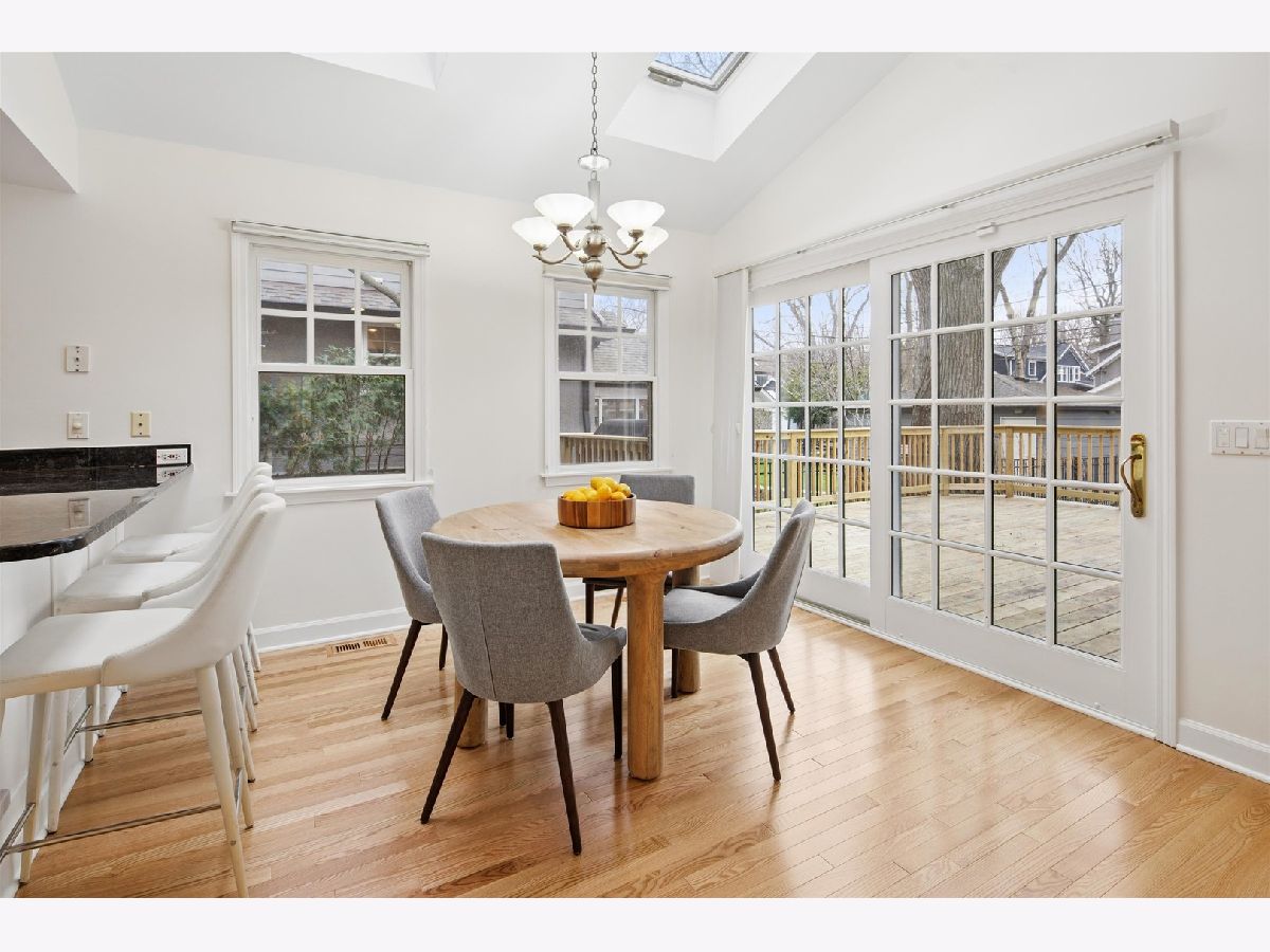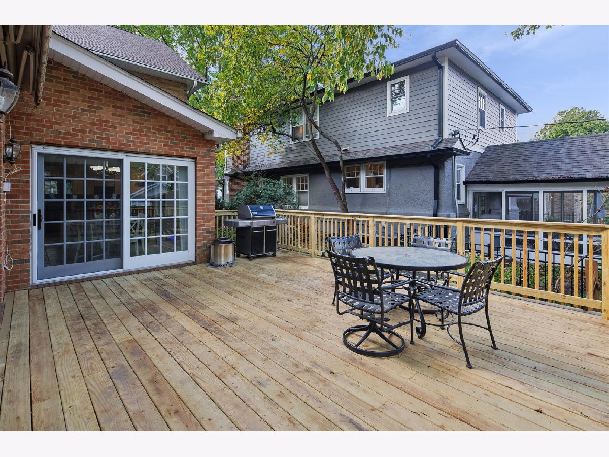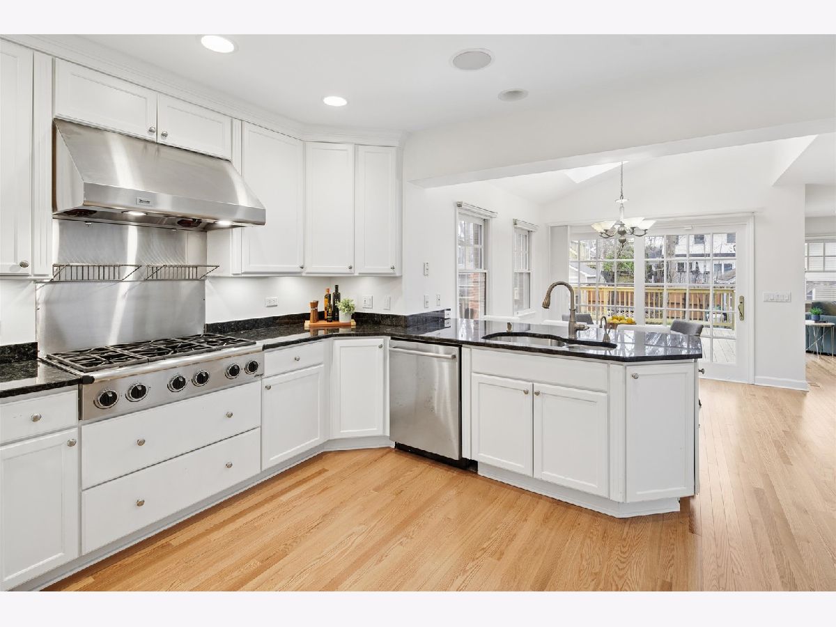 Set on a beautifully landscaped lot in the heart of McKenzie Square, this classic, all-brick center entry Colonial has been exceptionally well maintained and thoughtfully updated over the years. Wonderful flow and space throughout with 5 bedrooms and 3.5 baths, gracious room sizes, finished basement and attic. Enter through a formal foyer with decorative inlay hardwoods and a large coat closet. To the right, a sun-filled formal living room with a wood-burning fireplace and an impressive decorative mantle sets a welcoming tone. Off to the left, the dining room offers generous space for holiday entertaining and quiet dinners at home. The heart of the home is the open kitchen and family room looking out to an oversized deck and backyard. The kitchen features white cabinetry, Thermador/Sub-Zero/Bosch stainless steel appliances, double sink with dedicated water heater, dark granite countertops and breakfast peninsula and a walk-in pantry with pocket door. An eat-in breakfast room with skylights overhead brings in wonderful natural light from above. An enormous walk-out back deck with retractable, motorized awning, accessible from both the breakfast area and the family room, extends the living space, creating a seamless indoor-outdoor flow. Upstairs, the primary suite spans the width of the rear of the home with vaulted ceilings, and windows on three exposures overlooking the deck and backyard. Double walk-in closets with professional organizers and a spacious en-suite bath with a glass-enclosed steam shower with built-in bench, double vanity, and a large linen closet complete the suite. Three additional bedrooms on this level all feature hardwood floors and closet organizers. Cozy and carpeted 3rd floor offers flexible space for a study or playroom with additional storage. The finished basement rounds out the home with 9' ceilings and heated floors, a 5th bedroom, full bath, built-in bar with quartz countertops and beverage fridge, and a separate dedicated wine cellar. 1st floor full size laundry room with newer (2025) side-by-side LG washer/dryer, laundry sink, laundry chute, extra storage and separate mudroom make everyday life easy. Tons of additional features, updates and improvements to hit the practical side of living, including a central vac throughout with kitchen sweep, whole-house tankless water heater, backup generator, Eero high-speed WiFi, recessed lighting, in-ceiling speakers, and a new tear-off roof (2018). The backyard offers a newly resurfaced deck (2025) sized for serious entertaining, a play area with swing set tucked alongside mature plantings, and a detached heated 2.5 car garage. Shutters and hardwood floors including brand new hardwoods in the back half of the main level give the home a cohesive, traditional feel. Amazing McKenzie Square location close to McKenzie School, Howard Park, Metra and downtown Wilmette restaurants and shopping.
