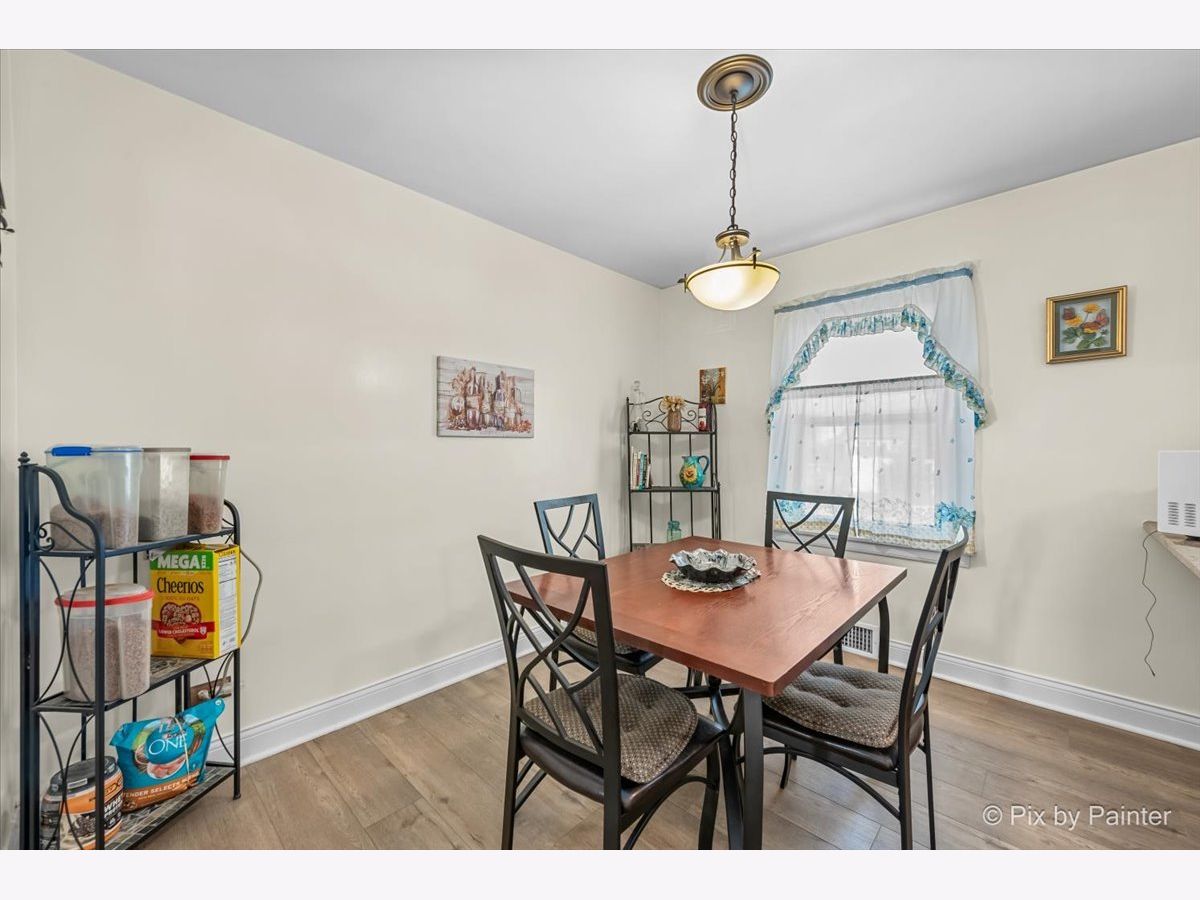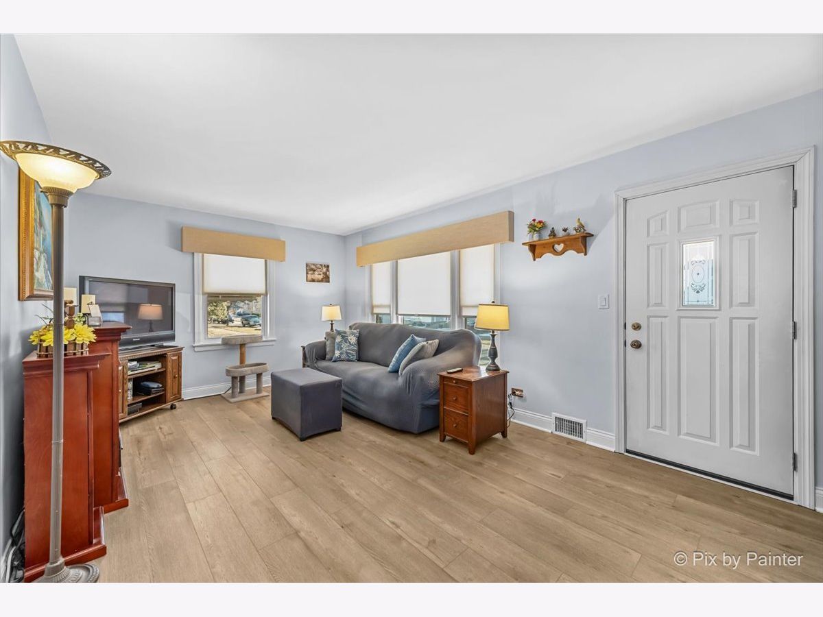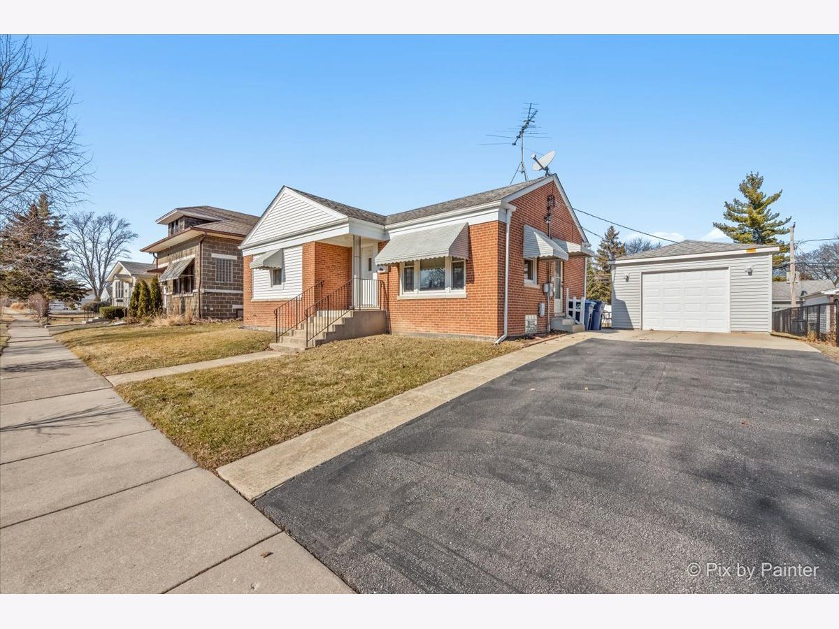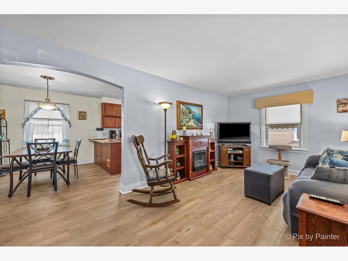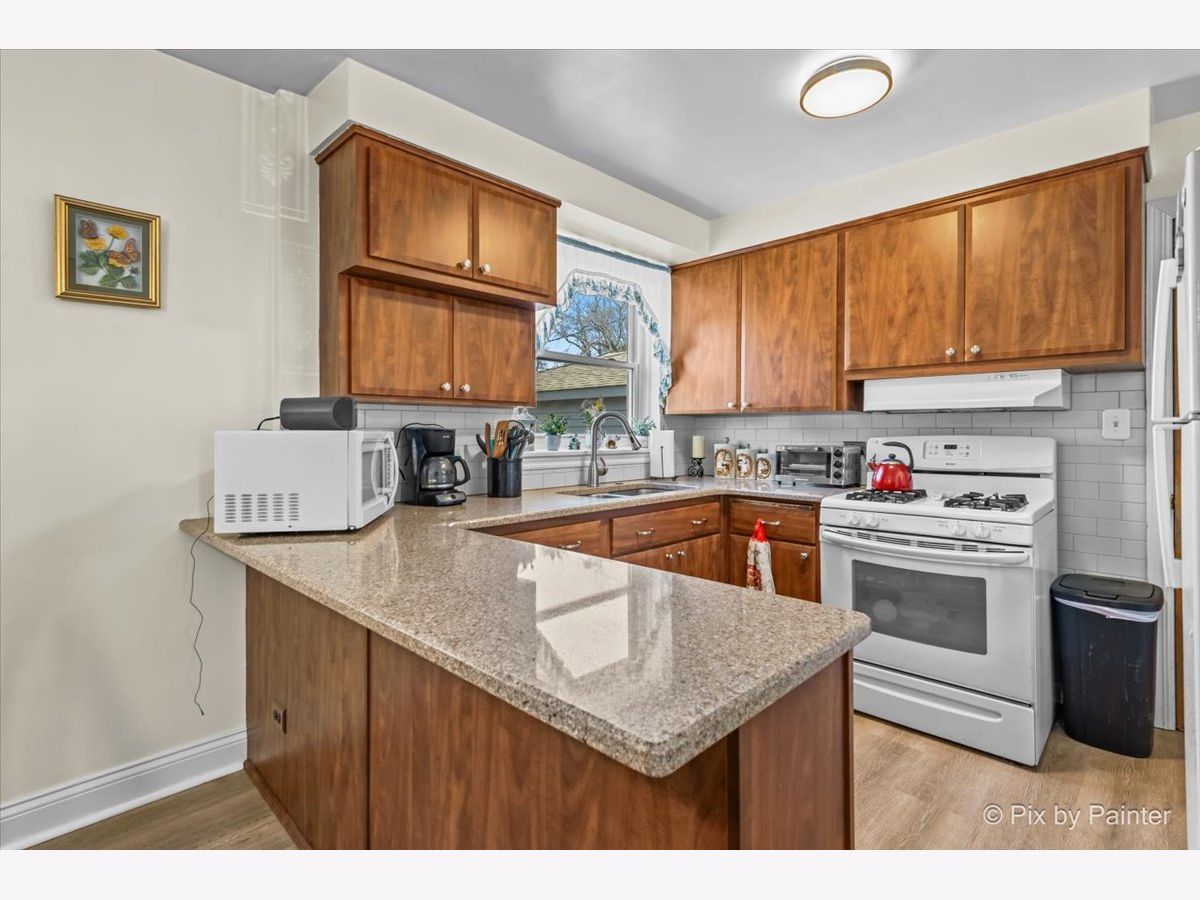 Welcome to this well maintained and thoughtfully updated home offering 935 square feet of comfortable living space with two bedrooms and one full bath. The main living area features vinyl plank flooring installed approximately four years ago, higher baseboards, and Feldco vinyl windows that bring in natural light. A freestanding gel can fireplace, designed as a furniture piece rather than a built in fixture, adds warmth and character and can remain if desired. The kitchen includes updated cabinet doors, quartz countertops, and a self cleaning oven, microwave, and refrigerator, creating a functional space for everyday living. The bathroom has been refreshed with a new toilet, updated shower, exhaust fan, and fresh paint. Exterior improvements include replaced siding, a chimney that was completely rebuilt in 2025, and gutters equipped with gutter guards for low maintenance living. The partially finished basement offers additional living space, a bar that can stay, generous storage, and replaced ceiling tiles. Copper pipes were replaced in 2017, the sewer line was rodded within the last two years, and the sump pump and water heater were both replaced in 2017. The washer, purchased in 2020, includes a tub clean feature. Additional highlights include a garage built in 2017 and a location outside of the O'Hare flight path. This move in ready home offers comfort, functionality, and thoughtful updates throughout.