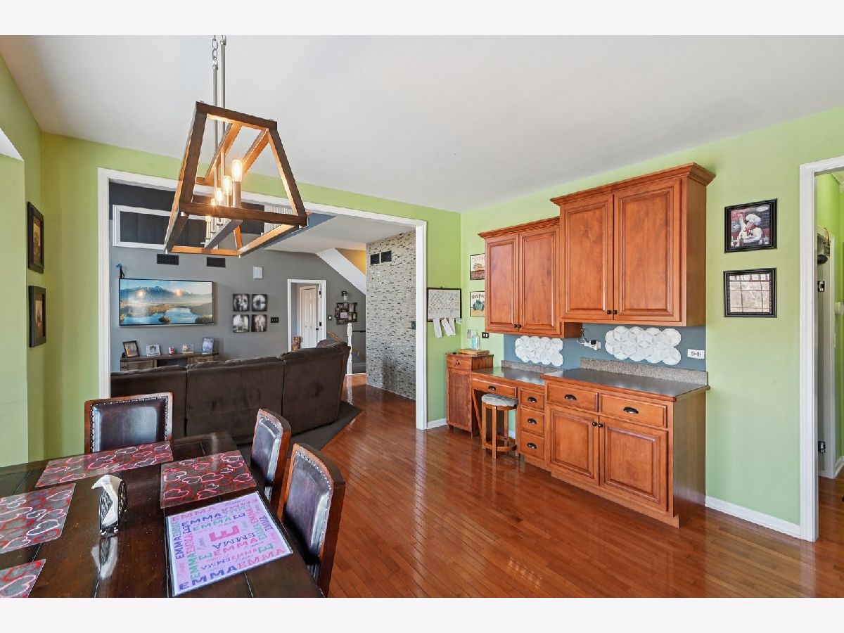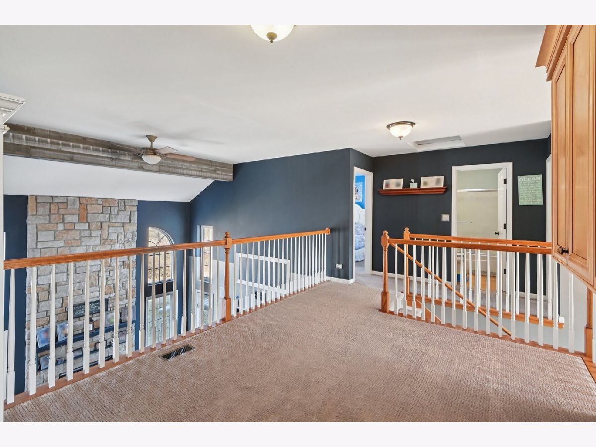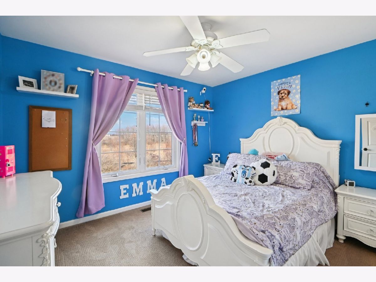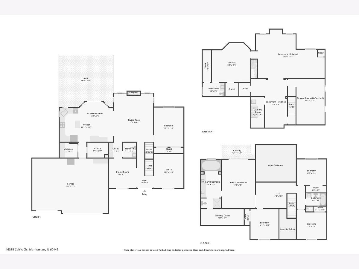 Beautifully maintained 5-bedroom home with 2 full baths, 2 half baths, and a 3-car garage, offering 3,110 sq ft above grade and 3,910 total sq ft including the finished basement. Located on a quiet circle in the desirable Village of Manhattan, known for its small-town charm, parks, community events, and convenient Metra access. The main level features a vaulted entry, formal dining room, and private office near the front entrance, ideal for working from home. The spacious living room with vaulted ceiling flows into the kitchen and eating area, perfect for everyday living and entertaining. A main-level bedroom and half bath offer flexibility for guests or related living. The kitchen includes ample cabinetry, a walk-in pantry, and backyard views. Enjoy the private outdoor space with a large deck, scenic natural tall grass, direct access to a walking path, and a nearby pond. The second floor offers four bedrooms, a full bath, and a primary suite with a walk-in closet and a private bath with a soaking tub and a separate shower. The finished basement features a theater room, a half bath, and a laundry area.