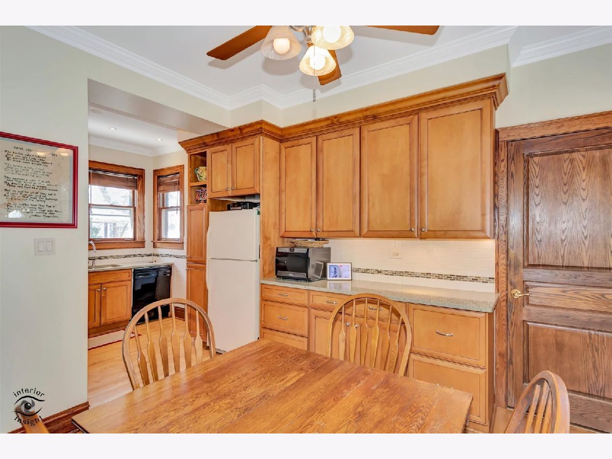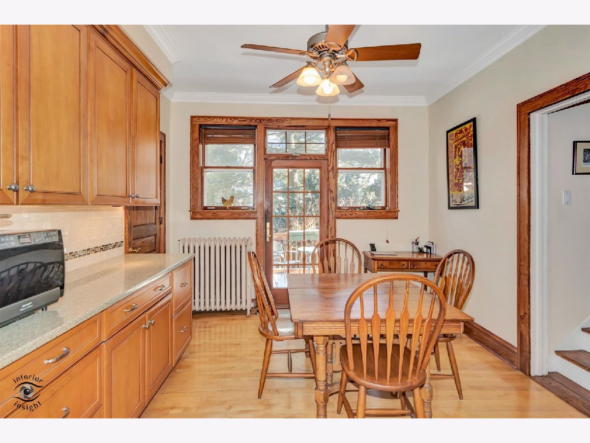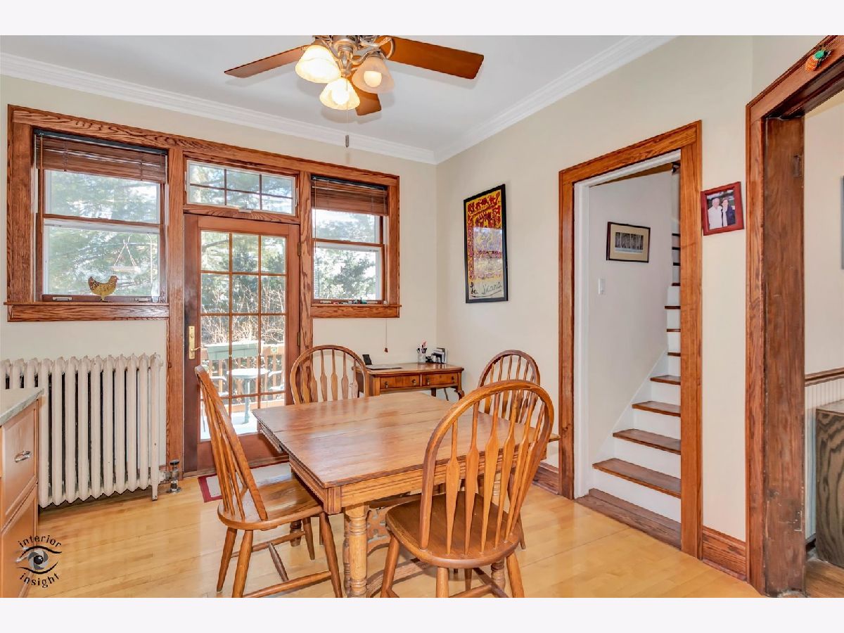 Passing on a well-loved family home rich in classic, traditional charm, this beautifully maintained residence showcases natural wood trim and molding throughout, cove ceilings, rich hardwood floors, and stunning stained-glass details. Thoughtfully updated over the years, the freshly painted interior features custom molding, a Frank Lloyd Wright-inspired chandelier, and a renovated kitchen with custom maple cabinetry, granite countertops, and a custom tile backsplash with stone accents. An open eating area is complemented by an oversized walk-in pantry and a door leading to the deck overlooking the lush, private yard. The flexible main-floor den also serves perfectly as a convenient 4th bedroom. An open staircase leads to the second level offering three bedrooms and a fully renovated bath with a custom arched ceiling, subway tile surround, custom wood vanity, and tile flooring. Set on an oversized 75 x 175 lot, the peaceful, private yard provides a fabulous outdoor retreat. Excellent condition/ As-Is Sale.