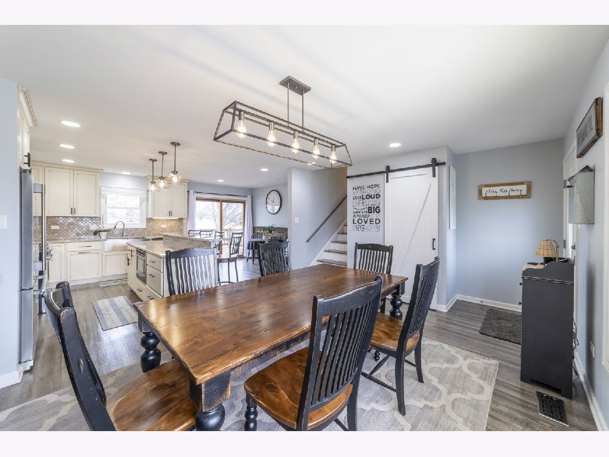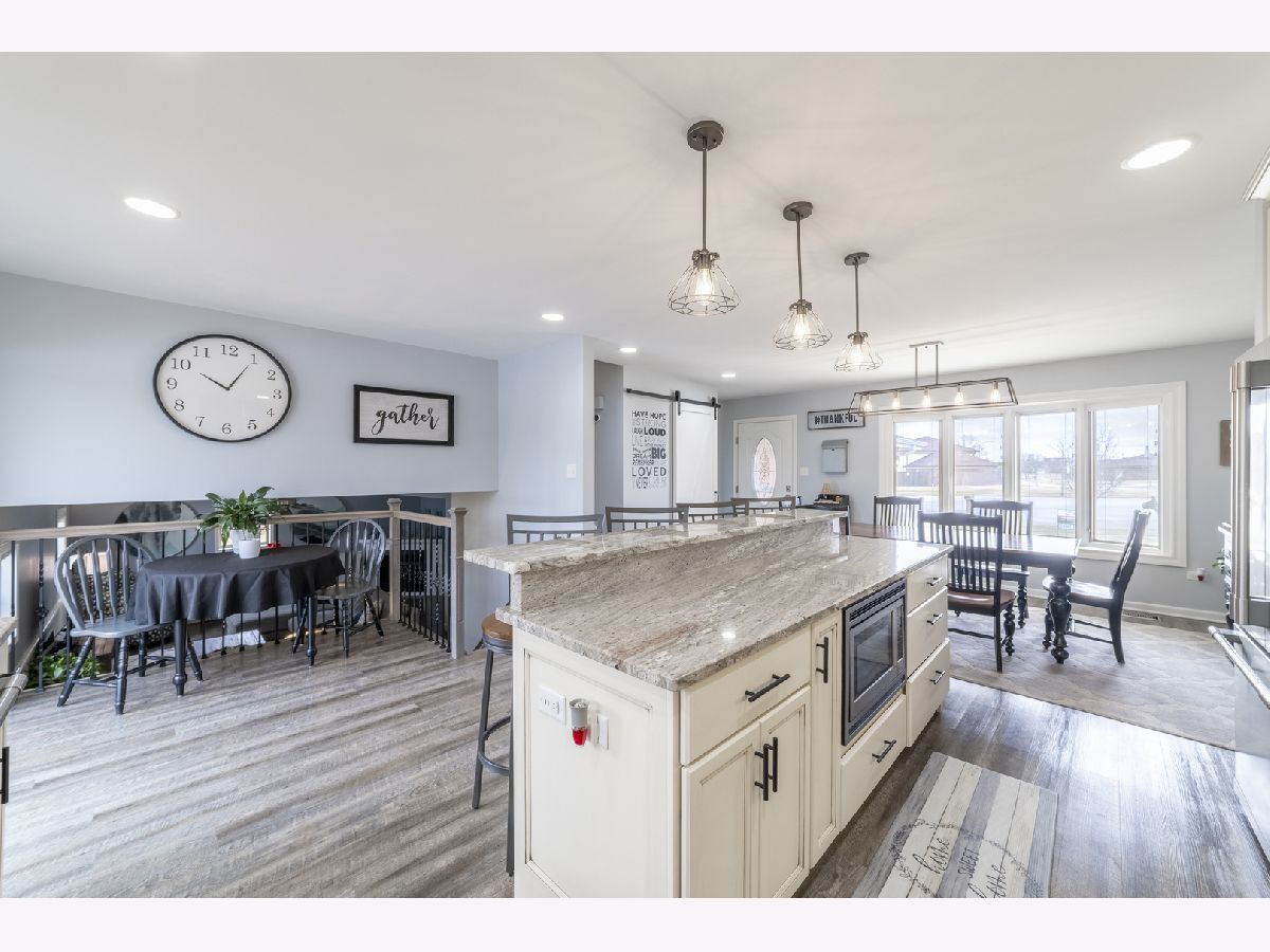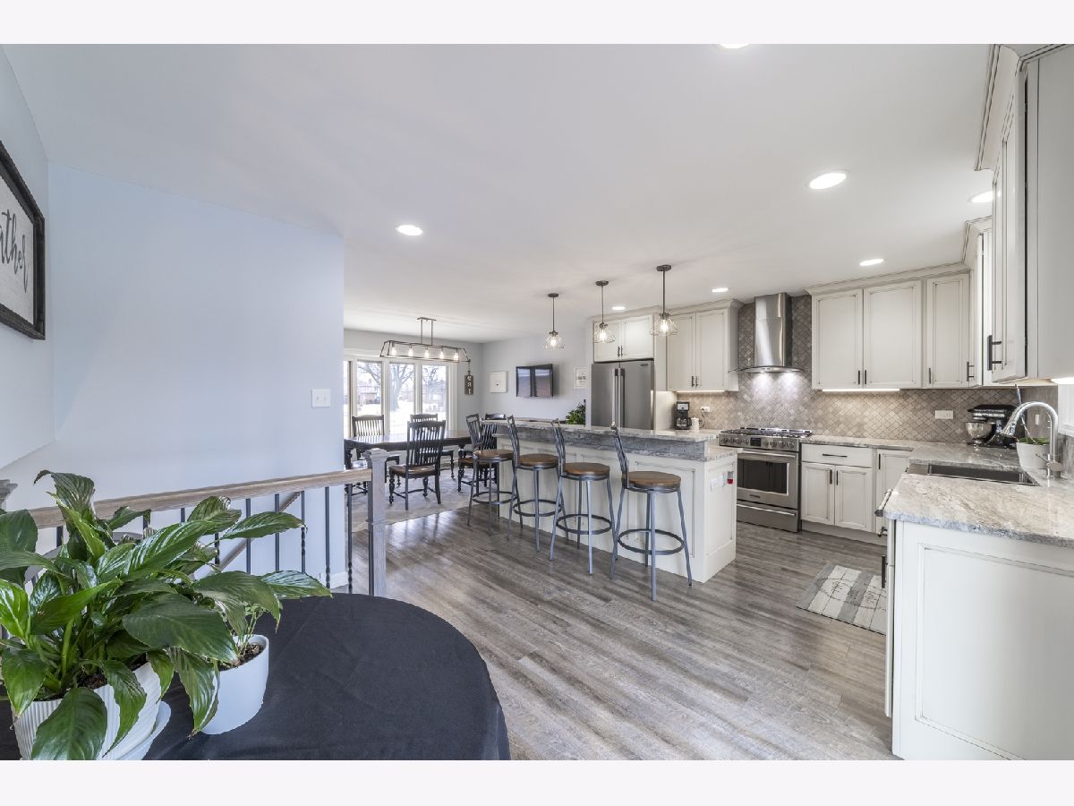 Welcome home to this completely updated and meticulously maintained 4-bedroom, 2-bath home offering stylish upgrades, thoughtful design, and exceptional functionality throughout. Step inside to a bright, open main level floor plan featuring beautiful luxury vinyl plank flooring and a stunning, fully updated kitchen that is truly the heart of the home. The kitchen boasts an impressive 8-foot island, elegant granite countertops, a stainless steel farmhouse sink, 42-inch upper cabinets, recessed lighting, and stainless steel appliances including a 5-burner slide-in range, commercial-style hood, and microwave built directly into the island-perfect for both everyday living and entertaining. A new Pella sliding door, front bay window, and newer kitchen window bring in abundant natural light. Just beyond the kitchen, the spacious family room is enhanced by a cozy gas fireplace and separated by an updated railing that adds both style and openness. The unexpected mudroom provides incredible convenience with a second laundry hookup, abundant storage, and direct access to the clean 2-car garage featuring an epoxy floor. Upstairs, you'll find three comfortable bedrooms, each with durable laminate flooring, six-panel white doors, and ceiling fans in three bedrooms for added comfort. The home is completely carpet-free, offering both modern style and easy maintenance. The finished basement expands your living space with a flexible room that can serve as a 4th bedroom, home office, or workout area, along with the primary laundry area (washer and dryer included) and additional storage. Two convenient interior attic access points provide even more storage options. Step outside to enjoy the beautifully maintained yard featuring a new concrete driveway (2023), wood deck, gas line for an outdoor grill, and a fully fenced backyard that backs directly to a walking path-perfect for relaxing evenings or outdoor gatherings. A garden shed adds additional storage for tools and equipment. With 4 bedrooms, 2 full bathrooms, modern updates throughout, and a fantastic layout inside and out, this move-in-ready home truly has it all.
