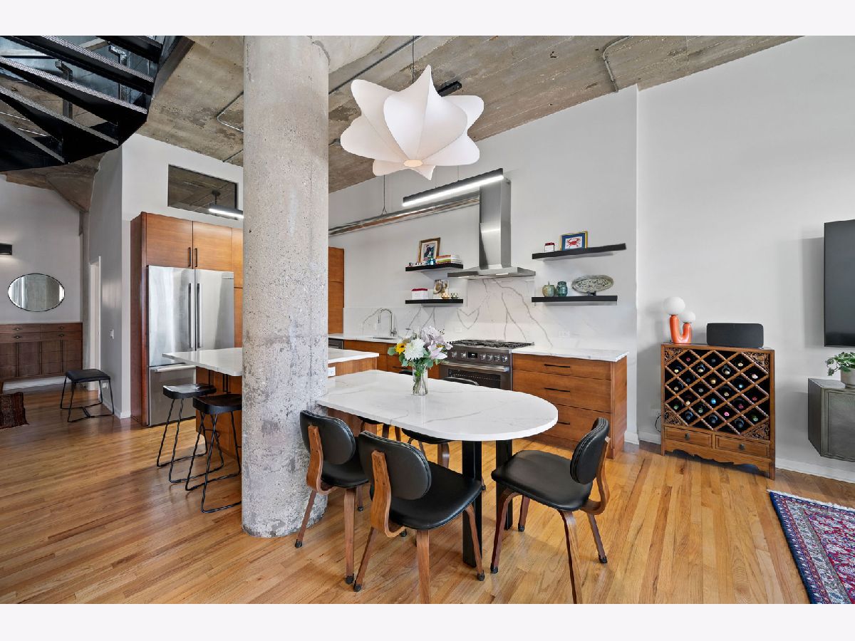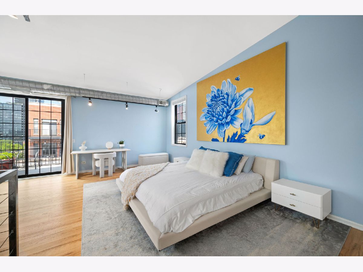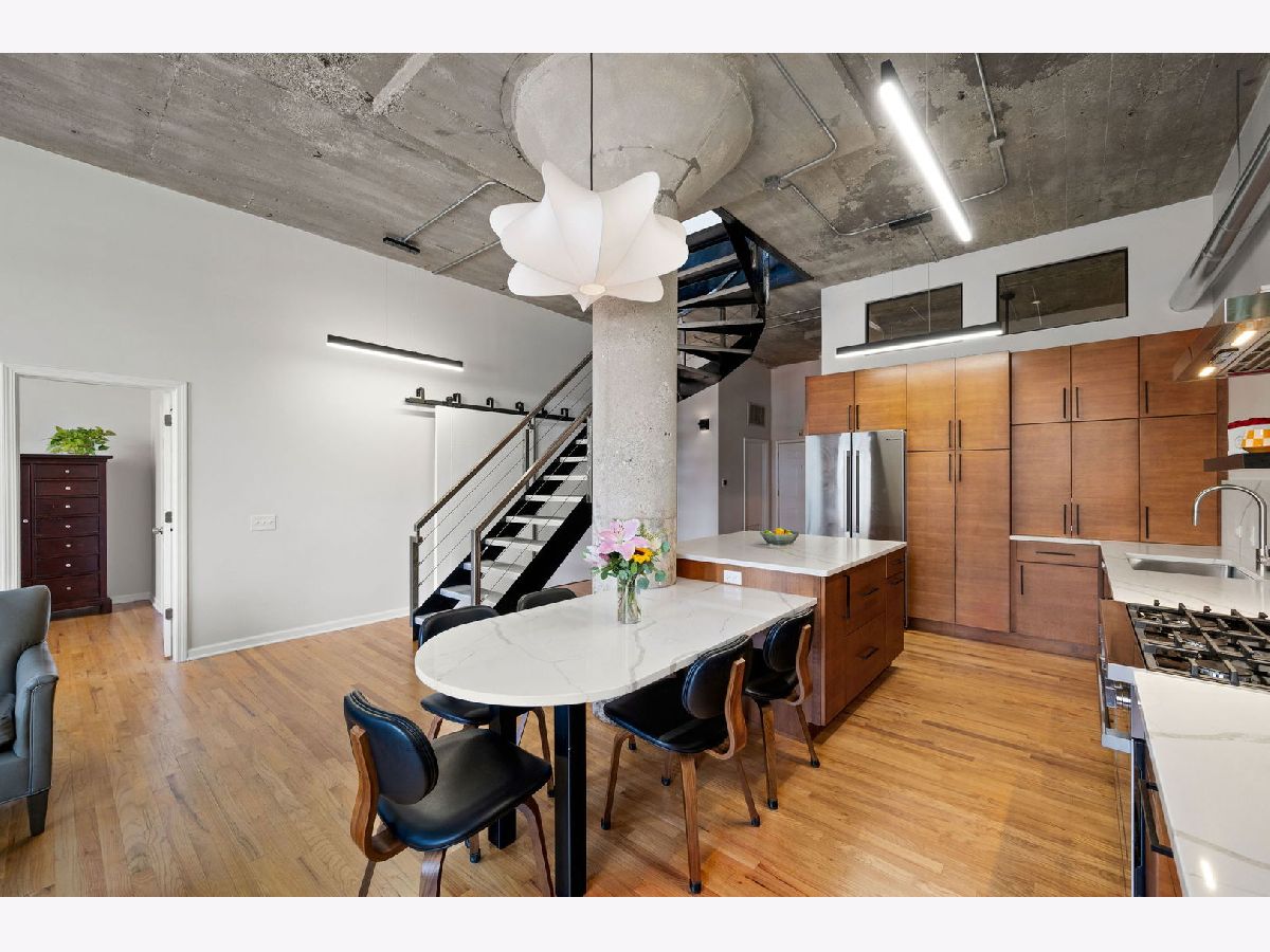 Welcome to Heartbreak Lofts in the West Loop. This modern 1,850 sq ft home features 3 bedrooms and 2.1 bathrooms with a chic and industrial aesthetic. Upon entry, you're greeted by soaring 13-foot ceilings and oversized north-facing windows that allow for exceptional natural light throughout. The recently renovated kitchen features stainless steel Bosch appliances, sleek Calcutta countertops, an oversized island, and custom dark wood cabinetry. The island is large for cooking and has table seating for 5. Head upstairs to find the expansive primary suite, which includes a walk-in closet, a renovated en-suite bathroom, and a private balcony-perfect for al fresco dining or enjoying the sunshine. The second bedroom is located back on the main level with a full bathroom and a closet, creating a comfortable and private setup for guests. The third bedroom is ideal for a home office or additional guest space. Heated garage parking for an additional cost. The building offers a shared rooftop deck with grills and east-facing skyline views. This location puts you just blocks from Skinner Park and Elementary School, public transit, and some of the city's best dining, shopping, and entertainment.