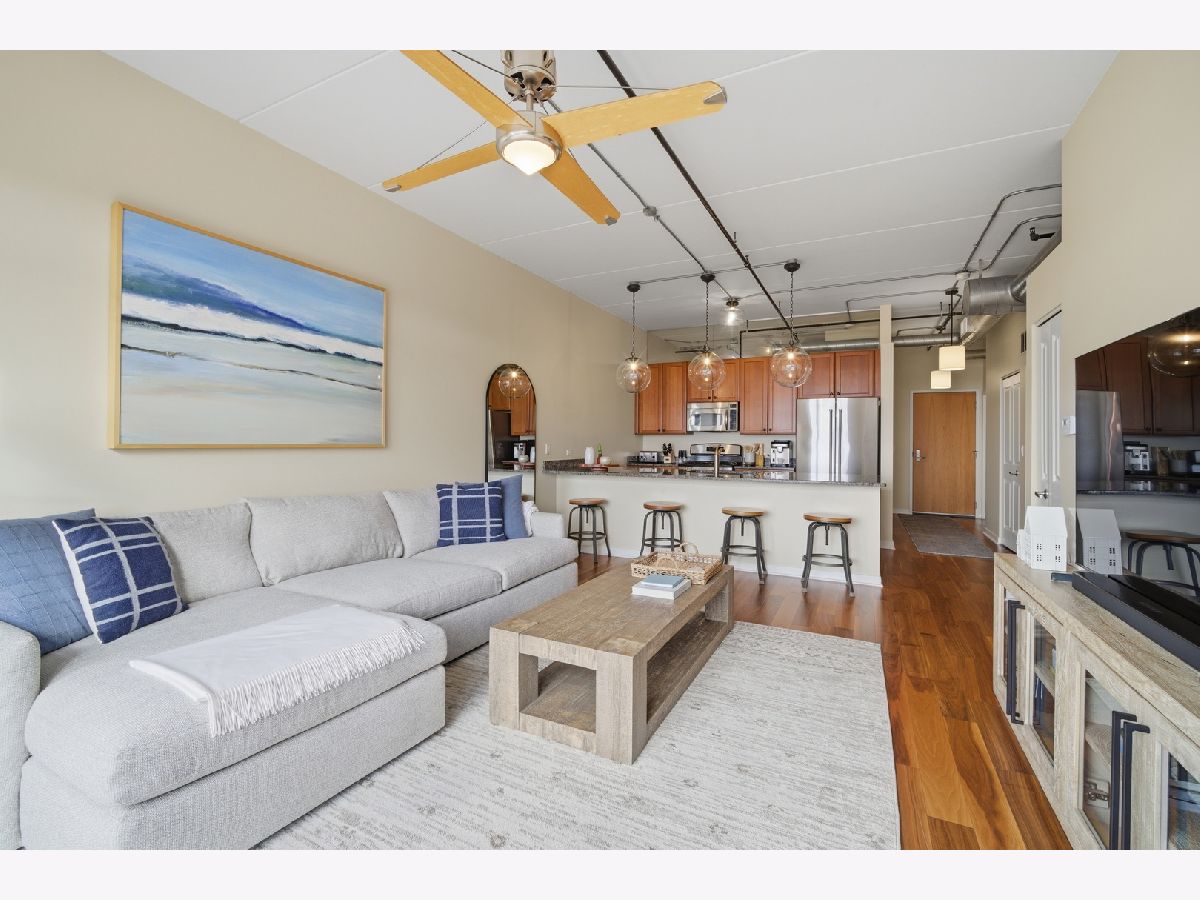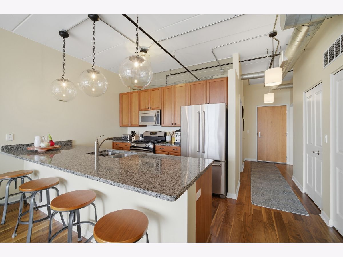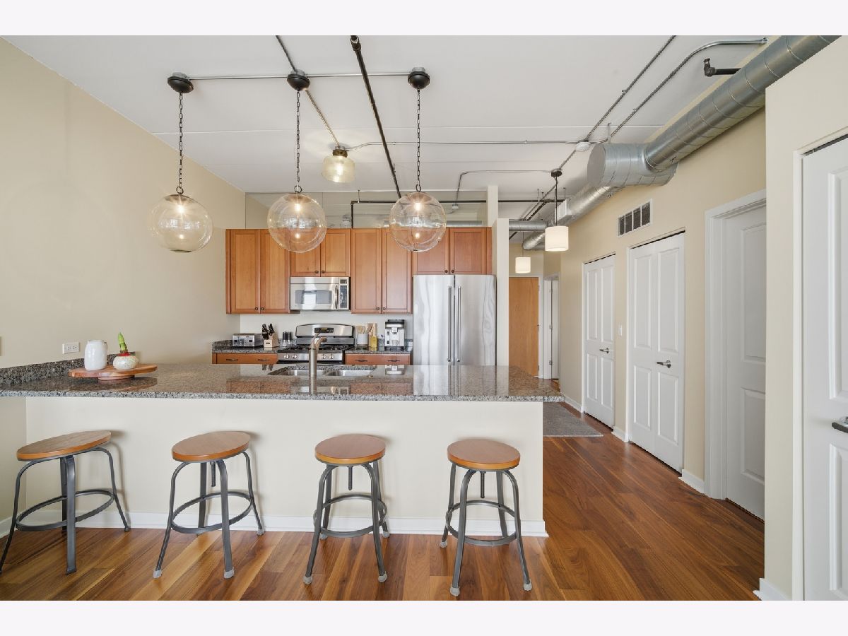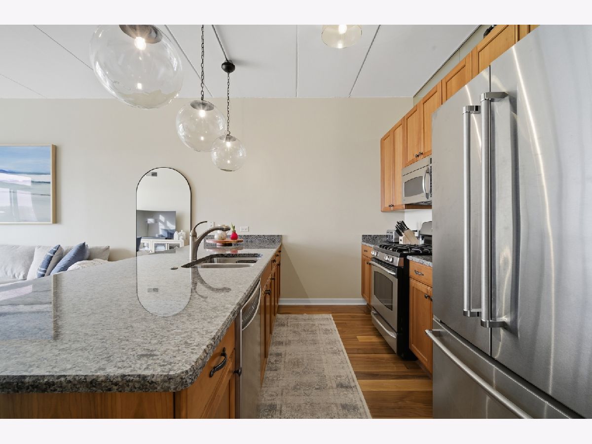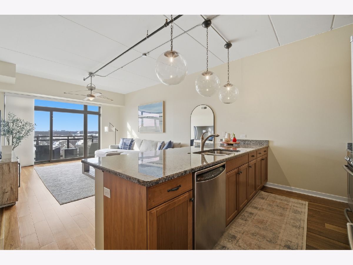 Sought after two bedroom, two bathroom top-floor condominium with a desirable southern exposure and beautiful views from your expansive balcony! This updated condo offers an open-concept floor plan with high-end finishes throughout, including stainless steel appliances, granite countertops, hardwood floors, and an oversized peninsula perfect for entertaining. The spacious primary suite offers great closet space and a luxurious en-suite bath with an oversized soaking tub/shower. The second bedroom is conveniently located across the hall from the second full bath, which includes a tub/shower combination. Additional highlights include in-unit washer and dryer, newer furnace and air conditioning and one heated garage parking space plus a oversized storage unit. Ideally situated within walking distance to all that Uptown Park Ridge has to offer, including dining, shopping, entertainment, and transportation...truly a stress free lifestyle! Tenant occupied through April 30, 2026.