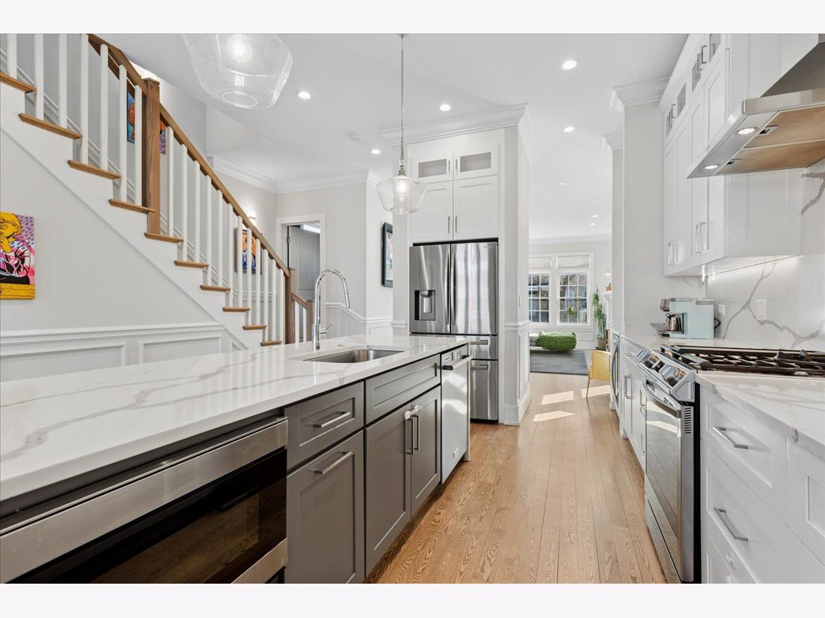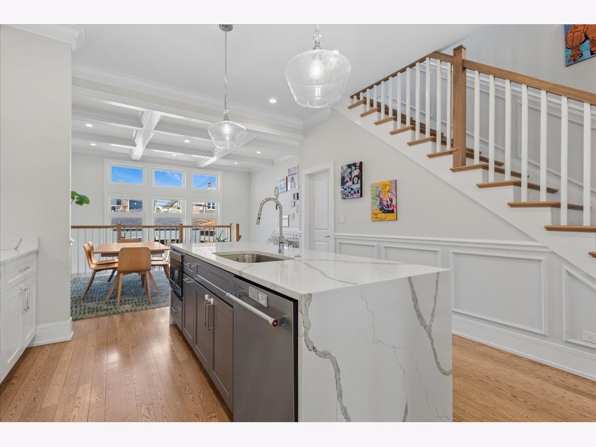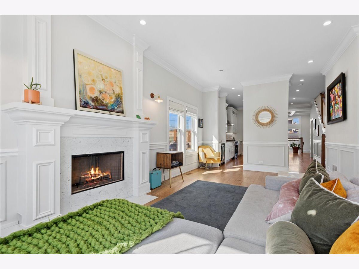 Beautifully constructed 5 bedroom / 3.1 bathroom home on a gorgeous tree-lined street in Humboldt Park/Logan Square, just blocks from the 606 Trail. This sun-filled home features hardwood floors throughout, soaring ceilings, crown molding, custom millwork, coffered ceilings in the dining room/family room, and wainscoting across the main level. The living room offers a wood-burning fireplace, has enough space for a dining room table and flows seamlessly into a butler's pantry. The gourmet kitchen is equipped with custom cabinetry, high-end stainless steel appliances, an oversized island with quartz countertops, and an additional enclosed pantry under the staircase. Just off the kitchen is a versatile flex space that can function as either a dining room or family room, with views of the beautifully landscaped yard. Upstairs, the spacious primary suite includes professionally organized closets and a spa-quality natural stone bath with a double shower, heated floors, freestanding tub, and double vanity. Two additional generously sized bedrooms and an additional full bath complete the second level. The lower level features radiant heated floors, a large rec room with a built-in wet bar, two additional, spacious bedrooms, a full bath and laundry room. A+ location close to the 606 Trail, both Mozart & Beilfuss Parks, Healy Metra stop, parks, shopping and all the restaurants, cafes & nightlife that Logan Square & Humboldt Park has to offer!
