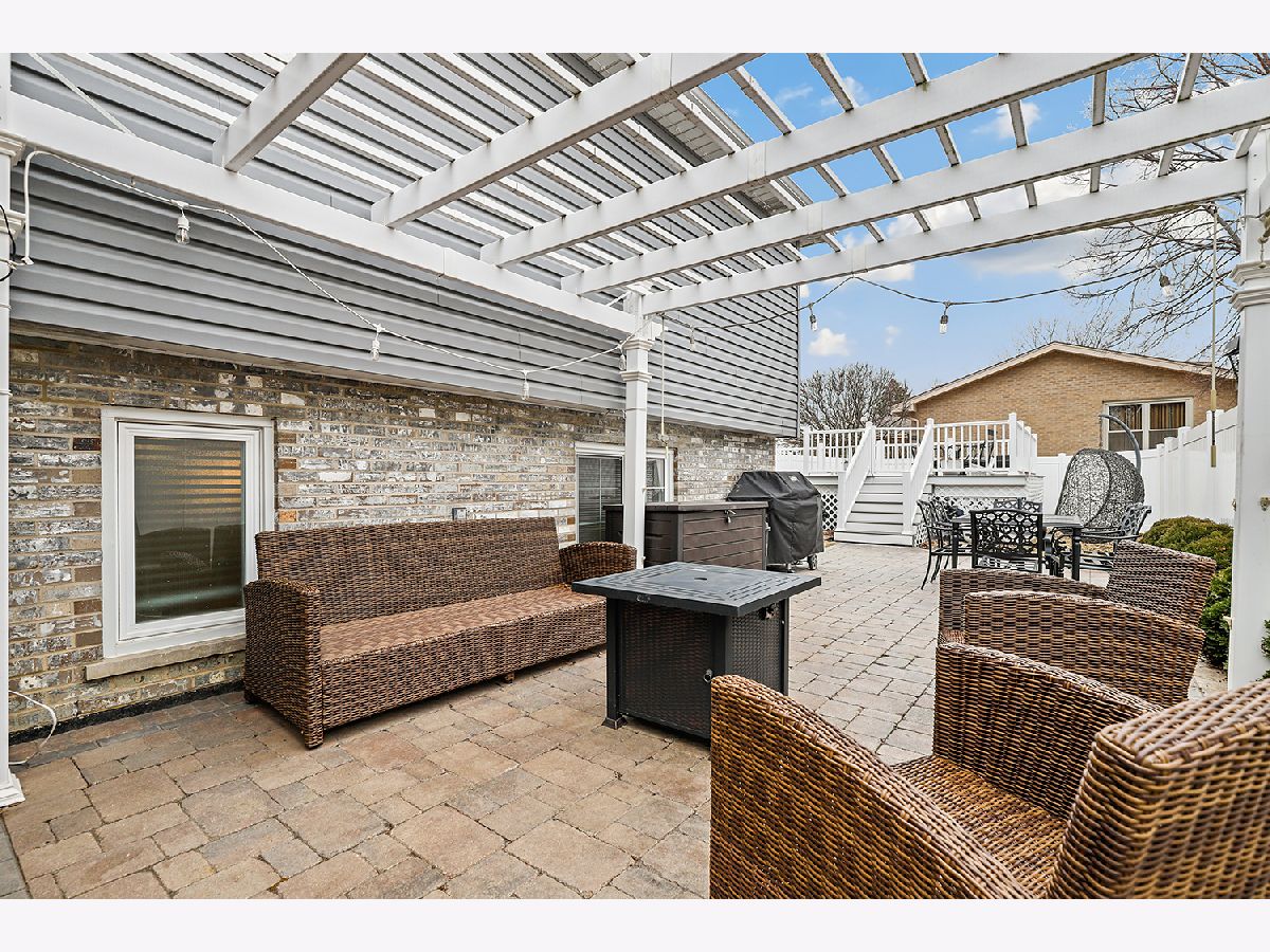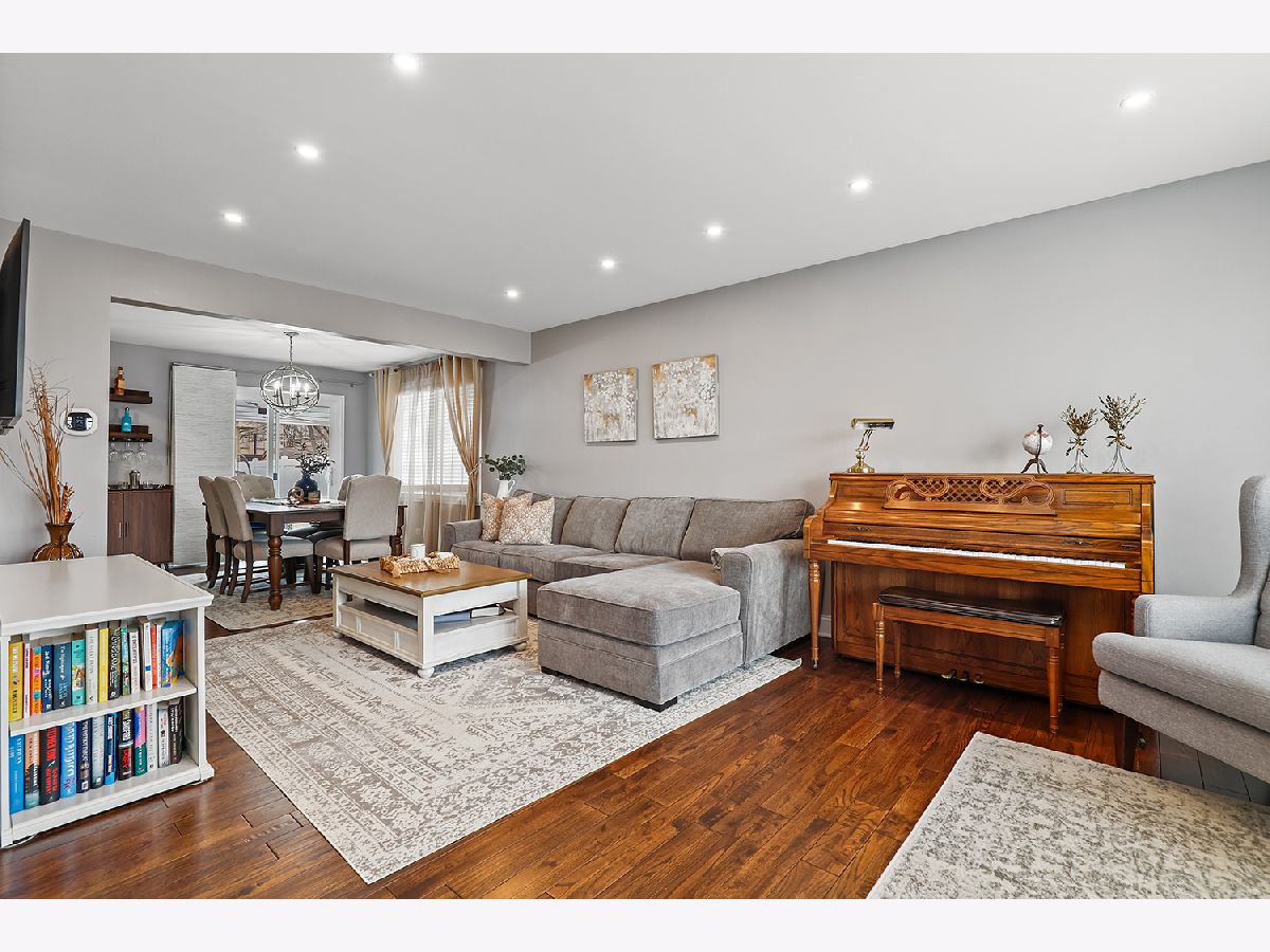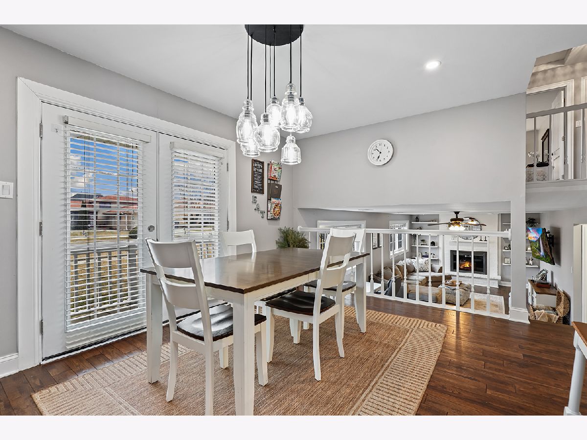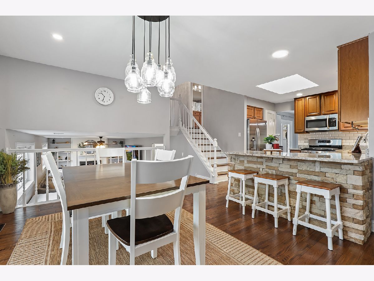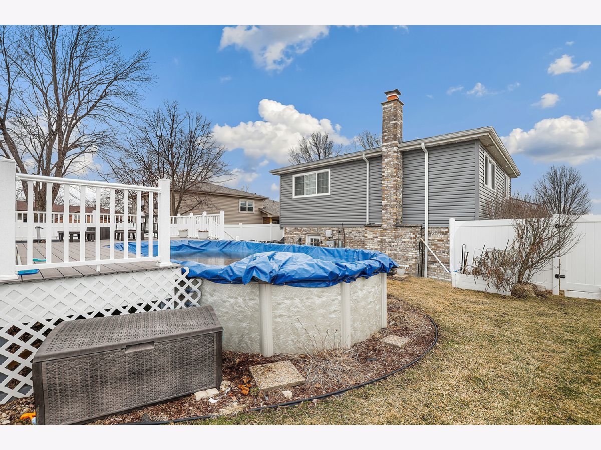 This 3 bedroom - 2 bath home sets a new standard for luxury with beautifully updated finishes throughout! The spacious eat-in kitchen features 42" maple cabinets, a peninsula that doubles as a breakfast bar, granite countertops, and stainless steel appliances, including a brand-new dishwasher. You'll also find a pantry, French doors leading to the side porch, modern light fixtures, and added LED recessed lighting. The home offers a wonderful flow with neutral paint, 41/4" dark walnut hand-scraped hardwood flooring, white trim, and elegant two-panel arch-top doors. Upstairs, the full bath showcases a granite countertop, hammered copper sink, travertine tile, and oil-rubbed bronze finishes. The primary bedroom features a dimmable rustic pendant chandelier, and there are two additional generously sized bedrooms on the upper level. The lower-level family room offers a cozy white brick fireplace, along with a luxurious full bath that was completely remodeled in 2023 and includes a stunning tiled shower. Step through the brand-new sliding glass door from the dining area into your backyard paradise. Enjoy the new concrete walk and patio, new decking around the pool, a new fence (2022), and a pergola-perfect for relaxing or entertaining family and friends. Conveniently located just minutes from I-80 between I-57 and I-355. Updates include kitchen appliances (2019), windows (2018), and a brand-new roof (2025). New Siding and gutters and New skylight in kitchen. The furnace, A/C, and water heater have all been well maintained. Attics and a cement crawl space provide ample storage. A must-see!
