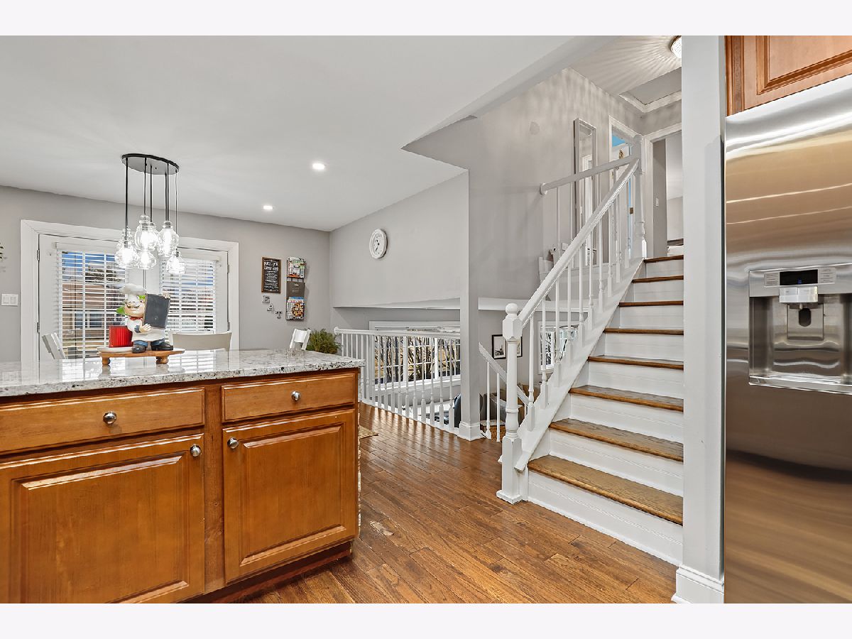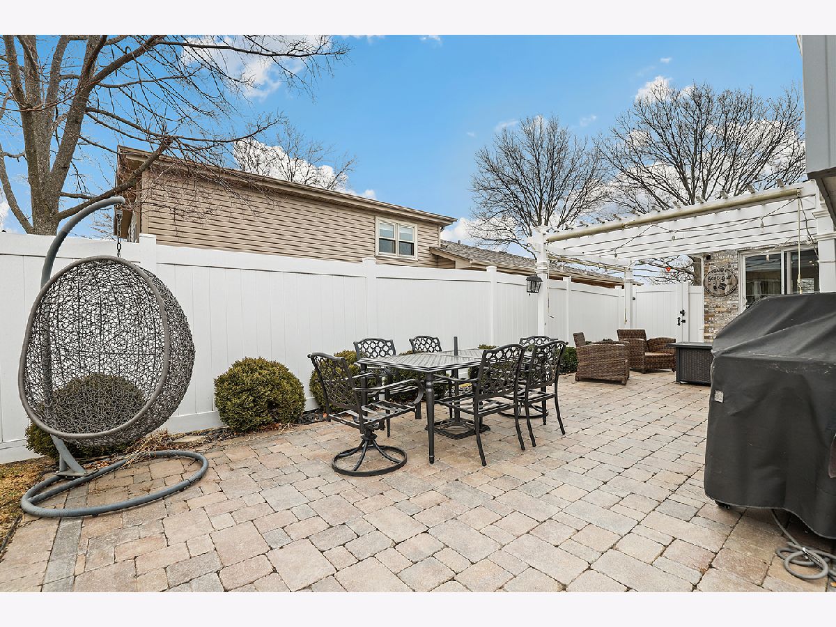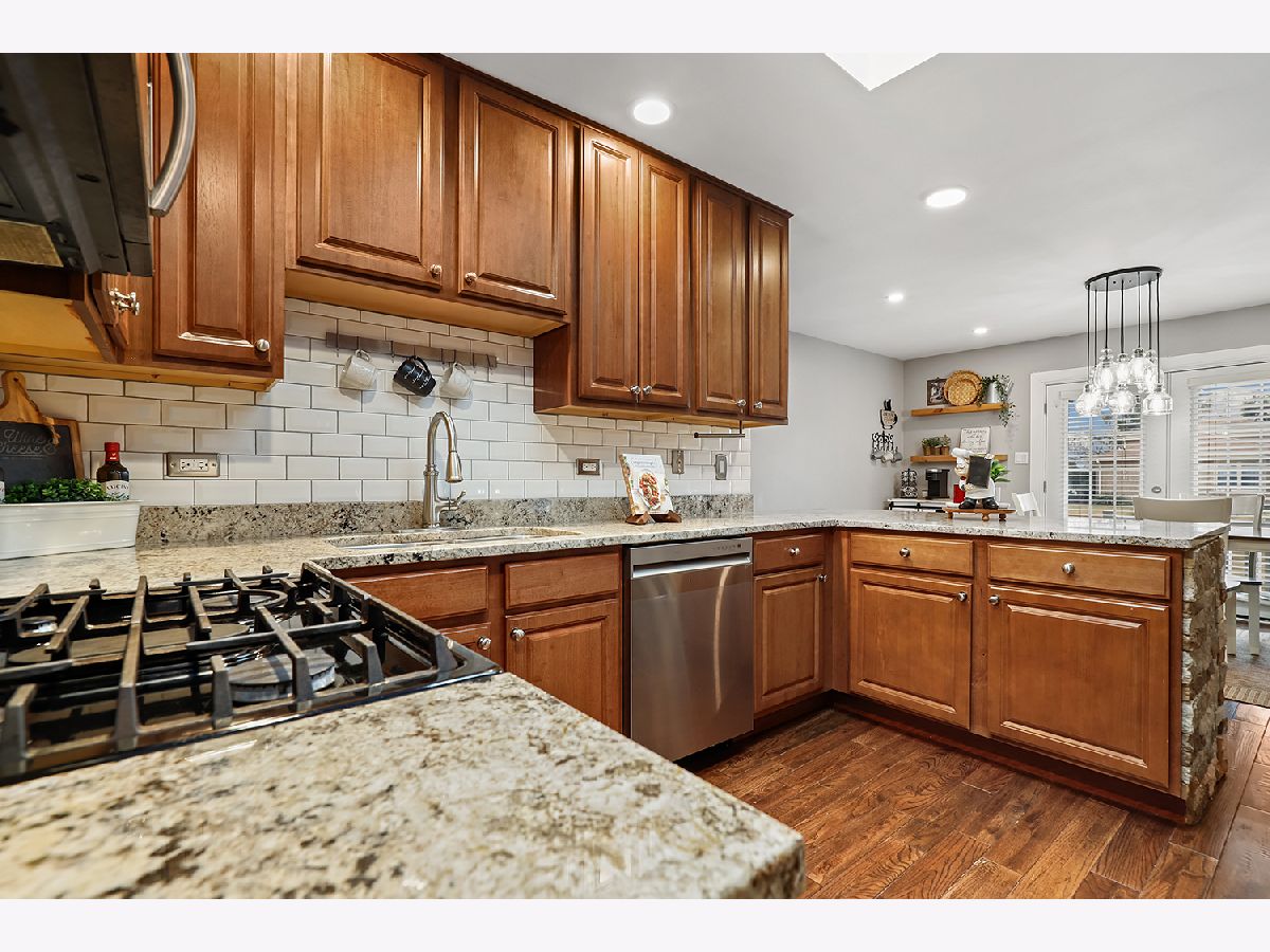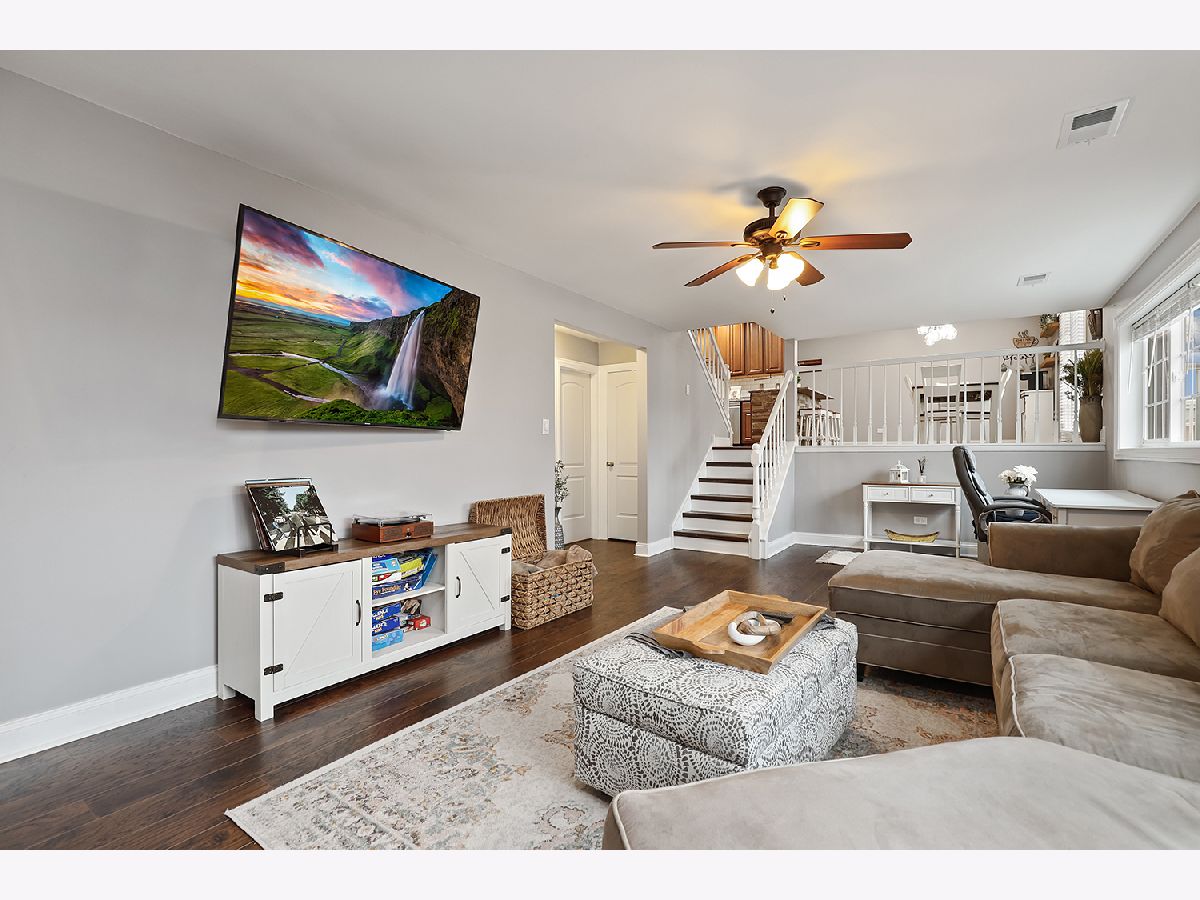 This 3 bedroom - 2 bath home sets a new standard for luxury with beautifully updated finishes throughout! The spacious eat-in kitchen features 42" maple cabinets, a peninsula that doubles as a breakfast bar, granite countertops, and stainless steel appliances, including a brand-new dishwasher. You'll also find a pantry, French doors leading to the side porch, modern light fixtures, and added LED recessed lighting. The home offers a wonderful flow with neutral paint, 41/4" dark walnut hand-scraped hardwood flooring, white trim, and elegant two-panel arch-top doors. Upstairs, the full bath showcases a granite countertop, hammered copper sink, travertine tile, and oil-rubbed bronze finishes. The primary bedroom features a dimmable rustic pendant chandelier, and there are two additional generously sized bedrooms on the upper level. The lower-level family room offers a cozy white brick fireplace, along with a luxurious full bath that was completely remodeled in 2023 and includes a stunning tiled shower. Step through the brand-new sliding glass door from the dining area into your backyard paradise. Enjoy the new concrete walk and patio, new decking around the pool, a new fence (2022), and a pergola-perfect for relaxing or entertaining family and friends. Conveniently located just minutes from I-80 between I-57 and I-355. Updates include kitchen appliances (2019), windows (2018), and a brand-new roof (2025). New Siding and gutters and New skylight in kitchen. The furnace, A/C, and water heater have all been well maintained. Attics and a cement crawl space provide ample storage. A must-see!