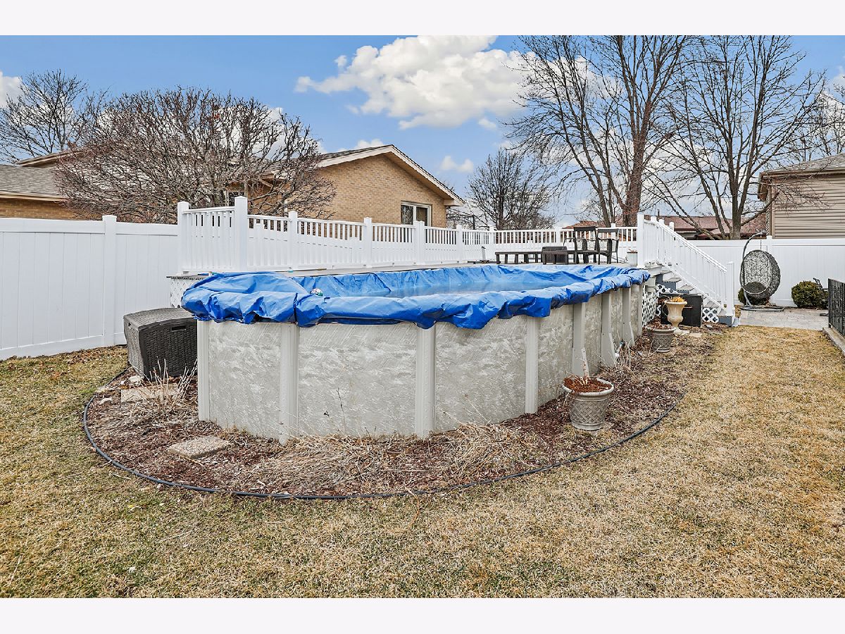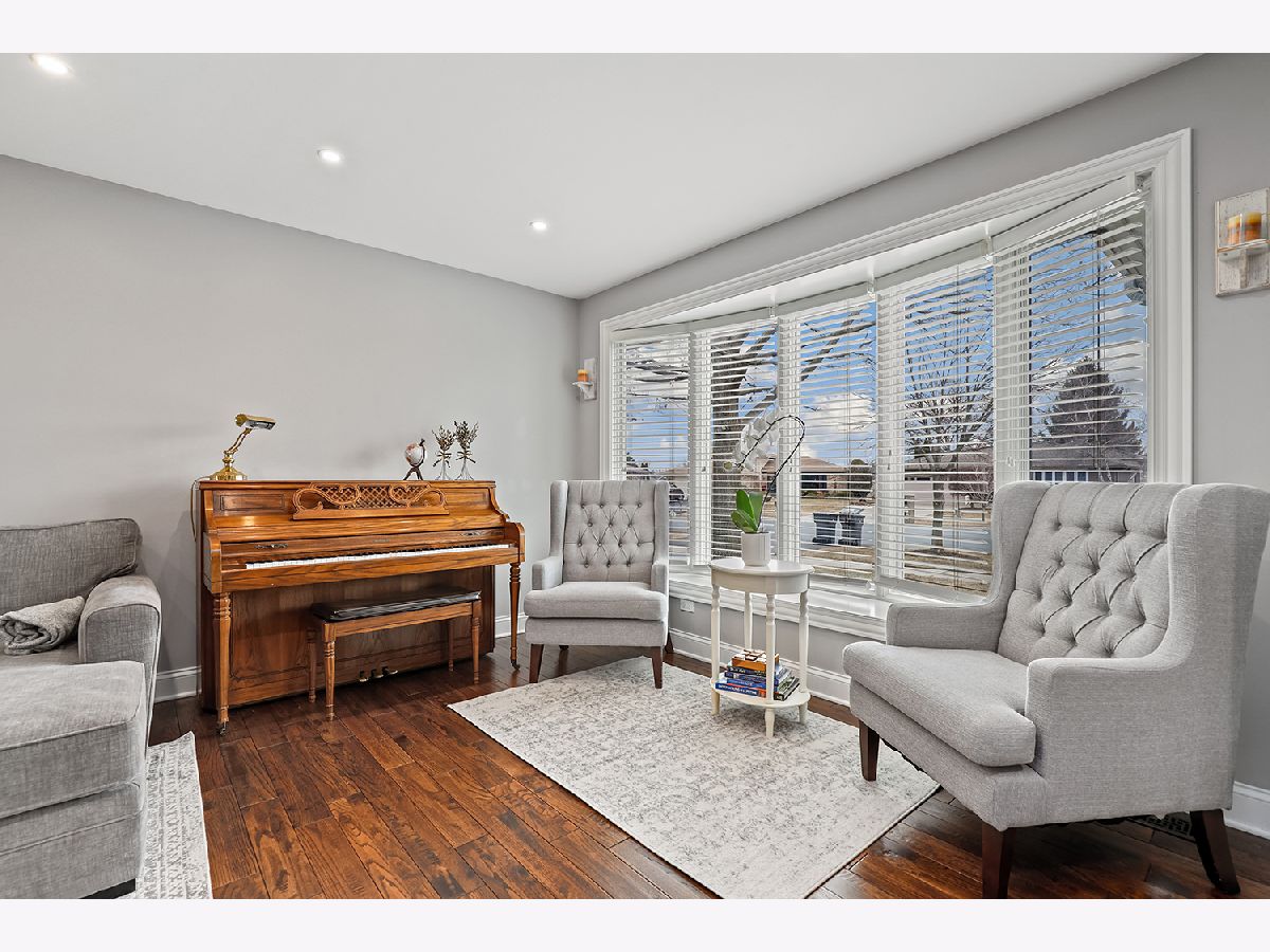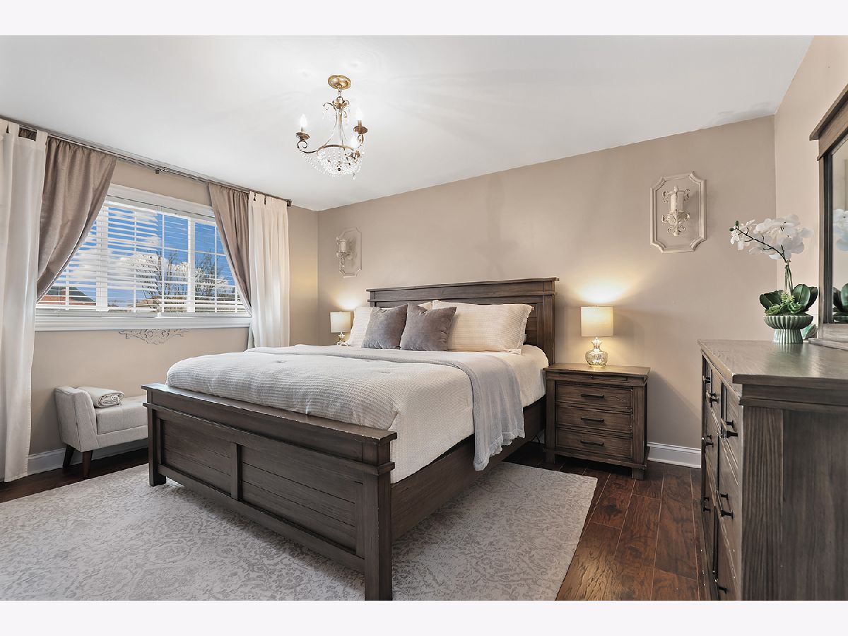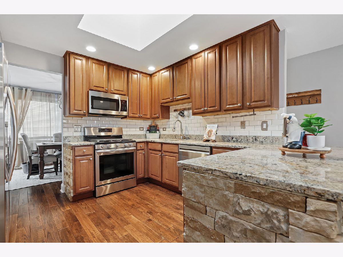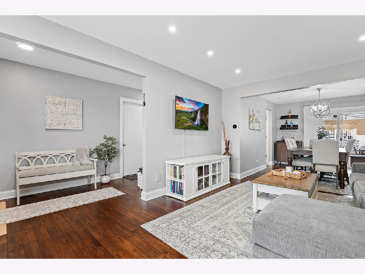 This 3 bedroom - 2 bath home sets a new standard for luxury with beautifully updated finishes throughout! The spacious eat-in kitchen features 42" maple cabinets, a peninsula that doubles as a breakfast bar, granite countertops, and stainless steel appliances, including a brand-new dishwasher. You'll also find a pantry, French doors leading to the side porch, modern light fixtures, and added LED recessed lighting. The home offers a wonderful flow with neutral paint, 41/4" dark walnut hand-scraped hardwood flooring, white trim, and elegant two-panel arch-top doors. Upstairs, the full bath showcases a granite countertop, hammered copper sink, travertine tile, and oil-rubbed bronze finishes. The primary bedroom features a dimmable rustic pendant chandelier, and there are two additional generously sized bedrooms on the upper level. The lower-level family room offers a cozy white brick fireplace, along with a luxurious full bath that was completely remodeled in 2023 and includes a stunning tiled shower. Step through the brand-new sliding glass door from the dining area into your backyard paradise. Enjoy the new concrete walk and patio, new decking around the pool, a new fence (2022), and a pergola-perfect for relaxing or entertaining family and friends. Conveniently located just minutes from I-80 between I-57 and I-355. Updates include kitchen appliances (2019), windows (2018), and a brand-new roof (2025). New Siding and gutters and New skylight in kitchen. The furnace, A/C, and water heater have all been well maintained. Attics and a cement crawl space provide ample storage. A must-see!