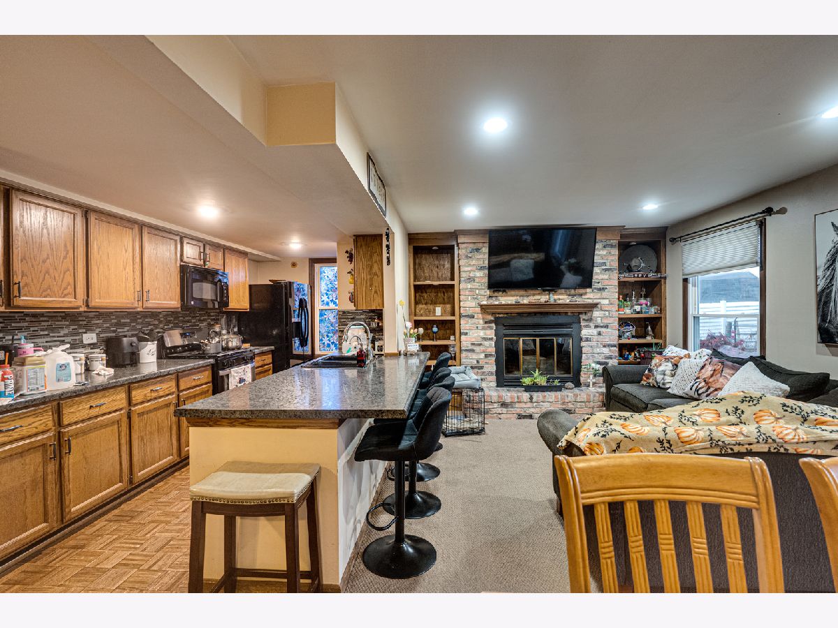 Move-In Ready Charmer with Vaulted Ceilings, Outdoor Kitchen & Tons of Natural Light! Welcome to this beautifully maintained 3-bedroom, 2-bath home offering an inviting open-concept layout and modern updates throughout. Step inside to a bright living room with dramatic two-story vaulted ceilings and comfy carpeting. The kitchen impresses with hardwood floors, stainless-steel appliances, a stylish glass tile backsplash, generous counter space with breakfast bar seating, and a convenient pantry. The adjoining dining area features sliding doors with shutters leading to a gorgeous stone patio - perfect for outdoor dining and entertaining. The spacious family room showcases recessed lighting, a cozy wood-burning fireplace, and custom built-in shelving for added character. A first-floor bedroom, full bath, and laundry area provide flexible living options and everyday convenience. Upstairs, the primary suite is a true retreat with French doors, abundant natural light, and access to a shared full bath. The third bedroom is equally spacious and bright. Enjoy your private backyard oasis with an expansive stone patio, outdoor kitchen, fire pit, and garden area - ideal for relaxing or hosting guests. Additional highlights include a whole-house natural gas generator and the peace of mind of being outside the flood plain. This home combines comfort, style, and functionality - ready for you to move right in and start making memories!