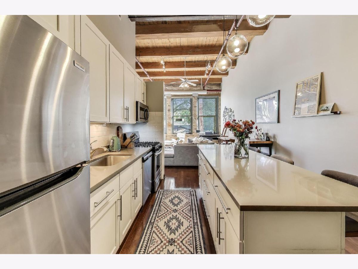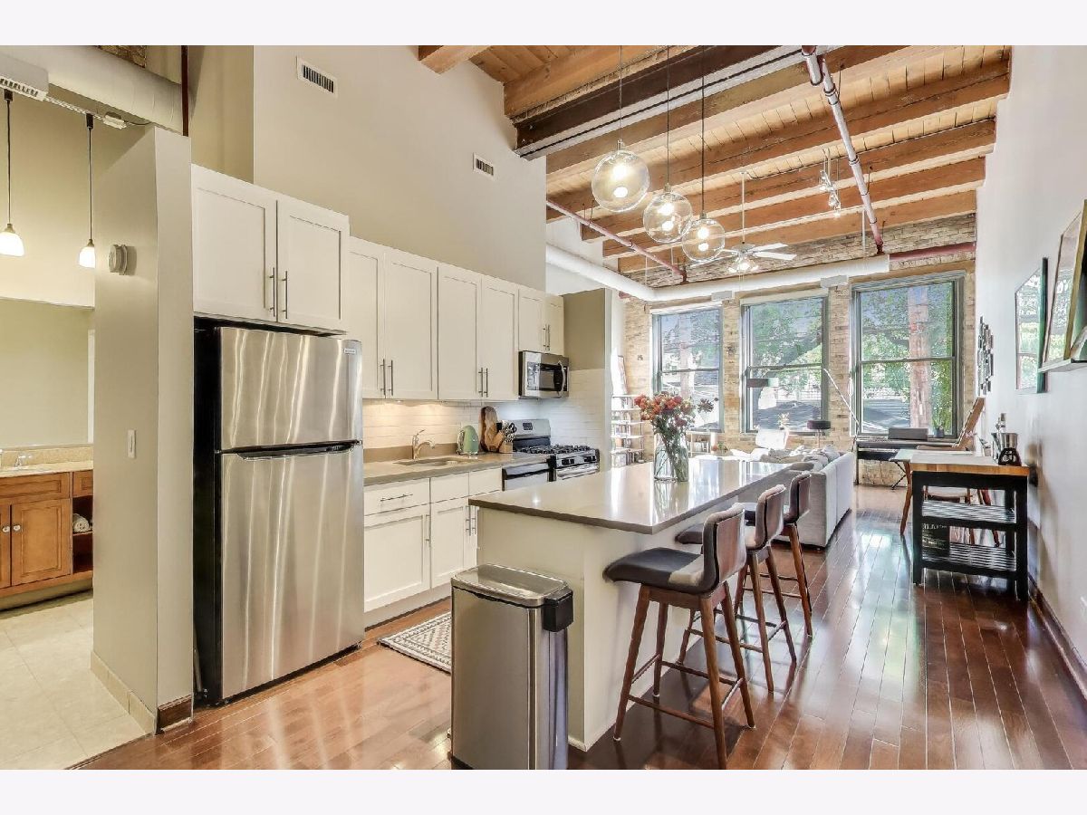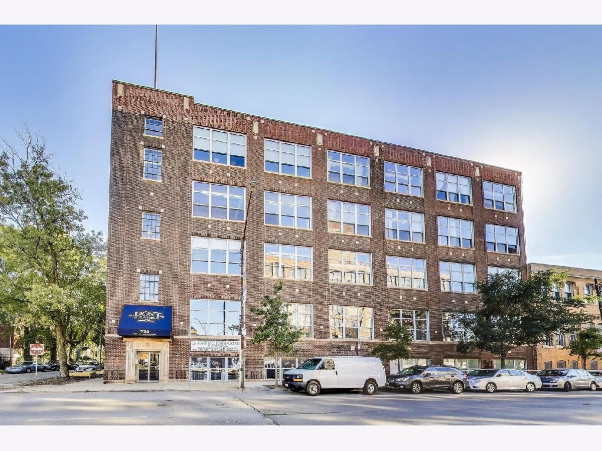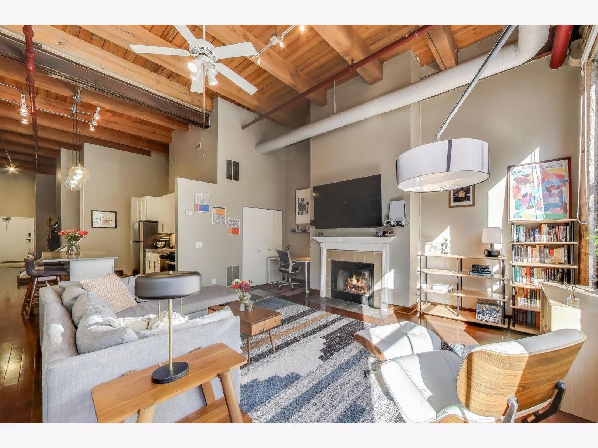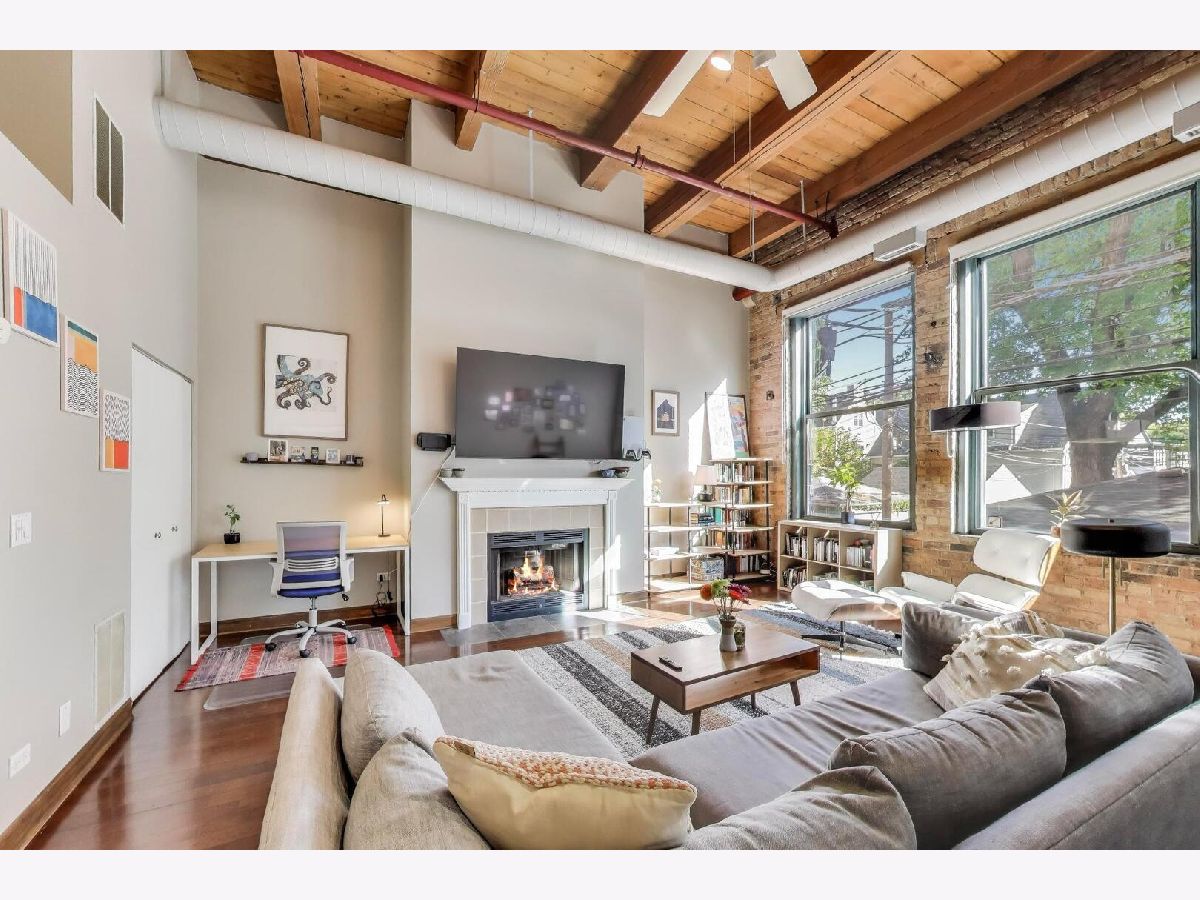 Discover authentic Chicago loft living at the iconic Post Card Factory Lofts in the heart of Lakeview. This move-in ready 2-bedroom, 1-bath residence blends timeless industrial character with thoughtful updates - all in a surprisingly quiet setting. Unlike what you might expect from the address, this unit does not face Irving Park Road, offering a more peaceful and private atmosphere while still being steps from everything Lakeview has to offer. Inside, you'll find soaring 14-foot timber ceilings, exposed brick walls, oversized south-facing windows, and rich hardwood floors that create a warm, light-filled space. The expansive open living and dining area is anchored by a gas fireplace, making it ideal for both everyday comfort and entertaining. The modern kitchen features stainless steel appliances, quartz countertops, and an impressive eight-foot island with seating - perfect for cooking, gathering, or casual dining. The primary bedroom offers generous closet space, while the lofted second bedroom provides flexibility for guests, a home office, or creative space, with additional storage below. New window treatments (blinds) have been added throughout, enhancing both privacy and style. Brand new, extra-large bathroom vanity, sink, quartz counter top, and in-unit GE washer dryer, conveniently built in behind the vanity, giving the next owner immediate value and functionality. Building amenities include resident and freight elevators, bike storage, a nearby second-floor laundry room, trash chute, and a shared rooftop deck with panoramic city views. One assigned parking space in the attached heated garage is included, plus ample street parking for guests. Located just steps from the Brown Line, and minutes from Lake Michigan, Belmont Harbor, Wrigley Field, restaurants, coffee shops, and neighborhood favorites - this home offers the best of Lakeview living with character you simply can't replicate. A true loft with history, charm, and comfort.