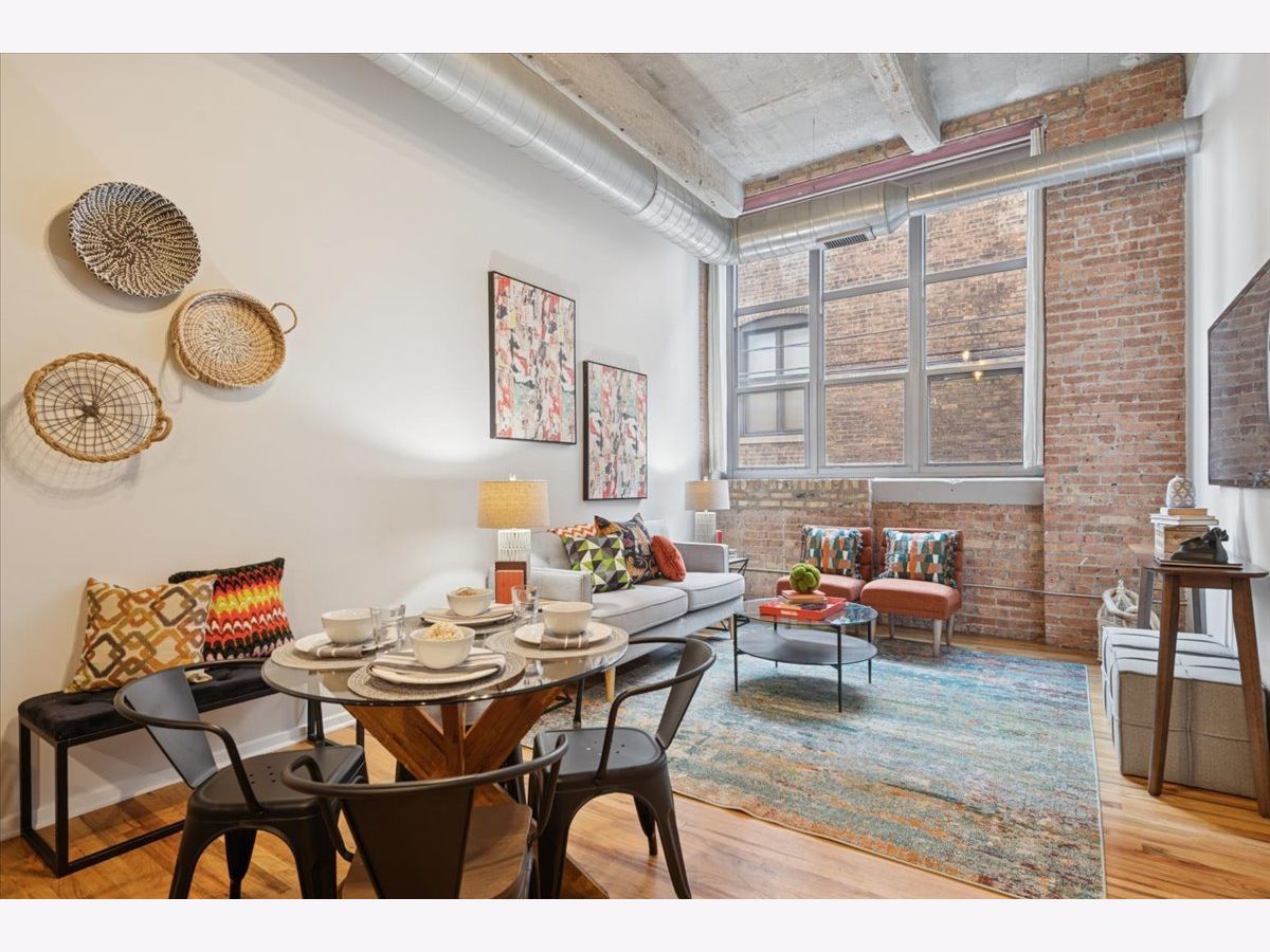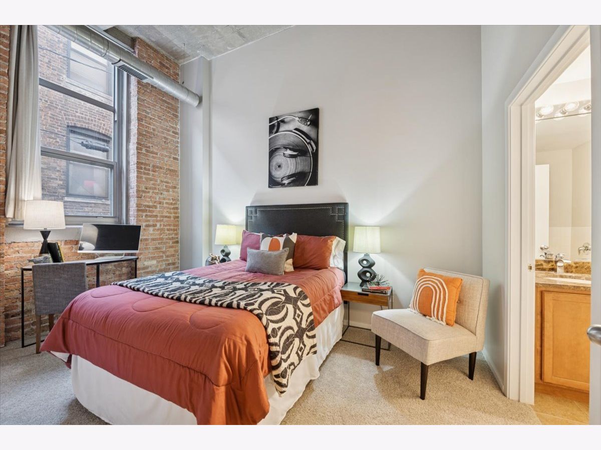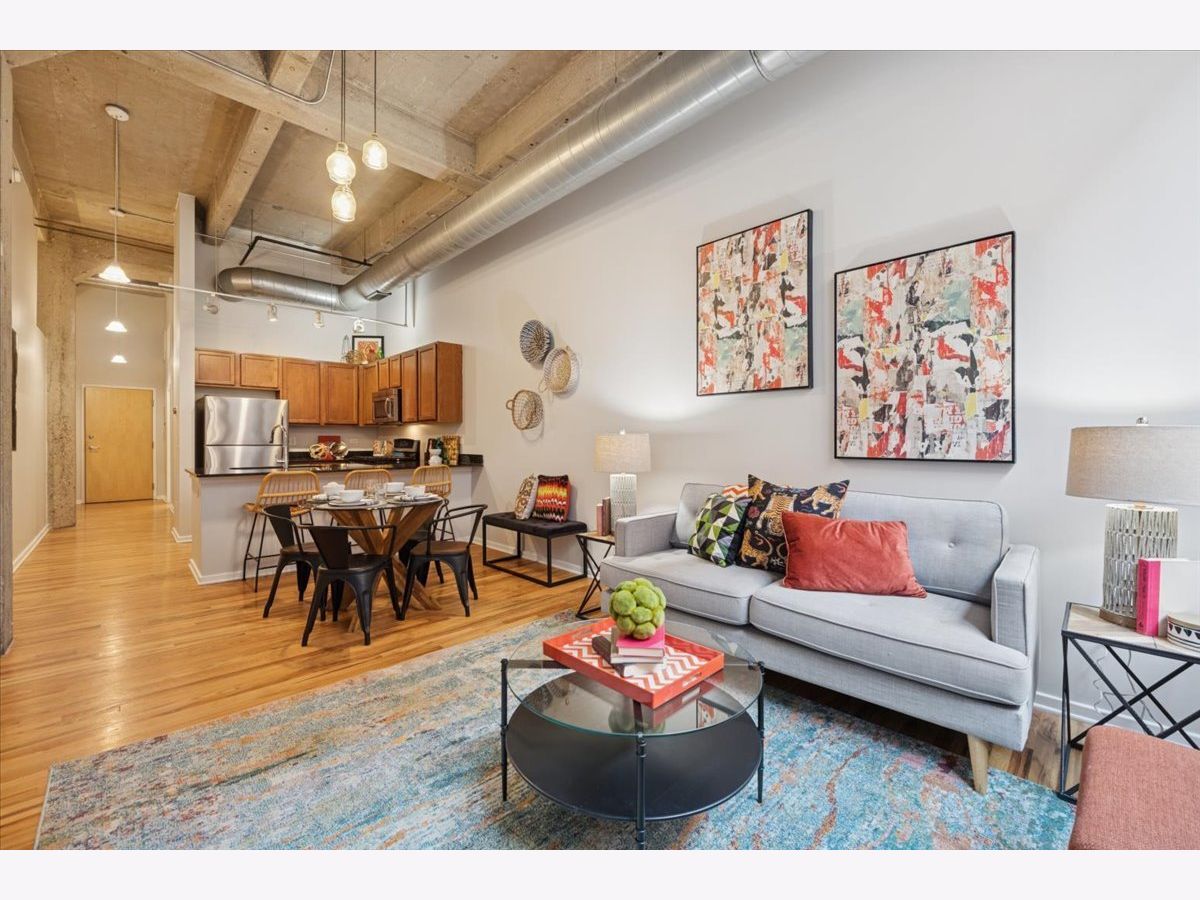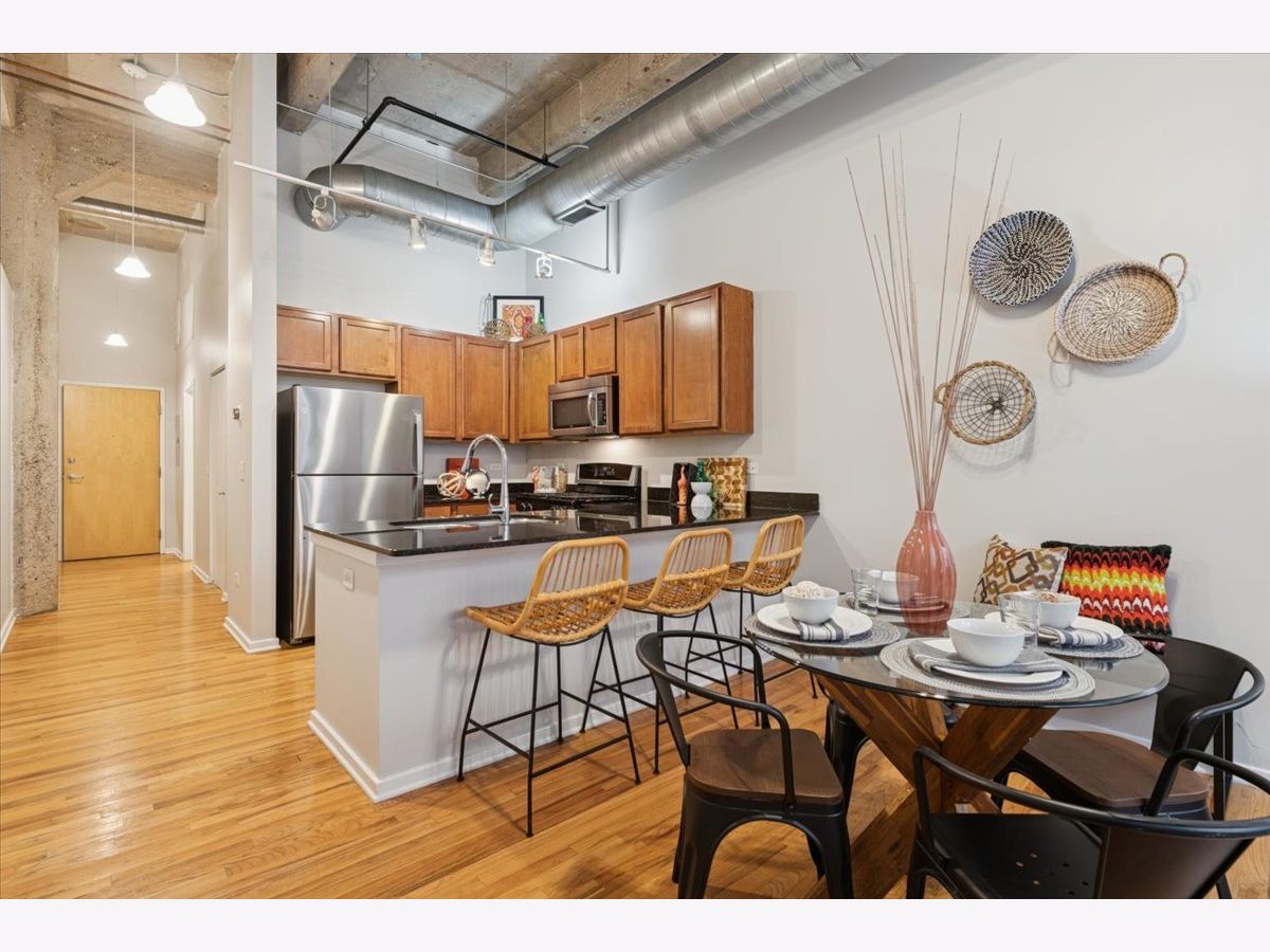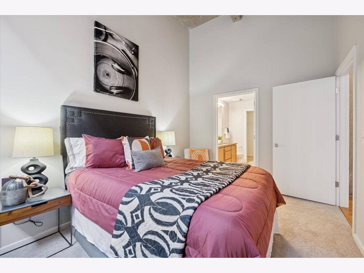 Spacious two-bedroom, two-bath residence located in one of Bucktown's most sought-after loft communities, complete with a deeded garage parking space. Dramatic soaring concrete ceilings and authentic brick accents create a true loft aesthetic. Exceptional storage throughout, highlighted by an oversized walk-in closet measuring approximately 9x6. The kitchen flows seamlessly into the living and dining areas and features stone countertops, a peninsula for casual seating, and modern steel-finish appliances. Rich wood flooring runs throughout the main living spaces. The primary suite includes a private bathroom with dual vanities, a separate enclosed shower, and a soaking tub. Convenient in-home laundry. Residents enjoy access to a well-equipped gym, expansive rooftop terrace, and an entertaining lounge, with direct access across the street to the start of the Bloomingdale Trail. Recent updates include fresh paint, new carpeting, new HVAC and updated lighting. Investor friendly building.