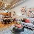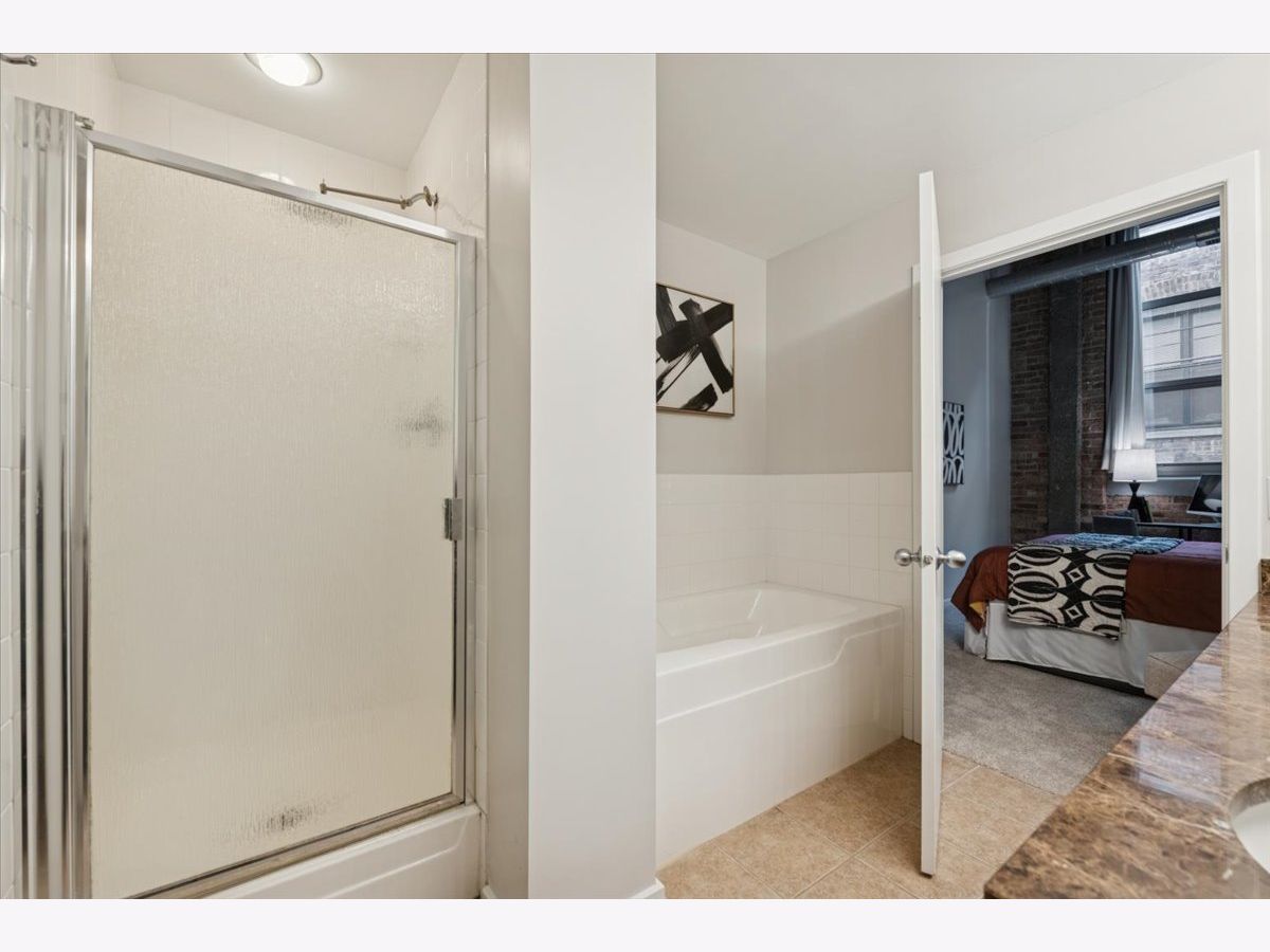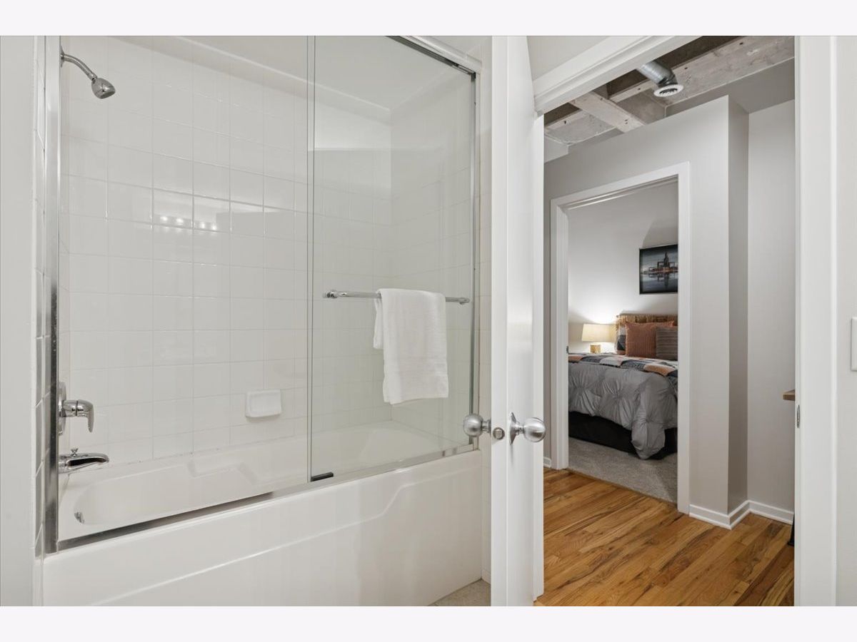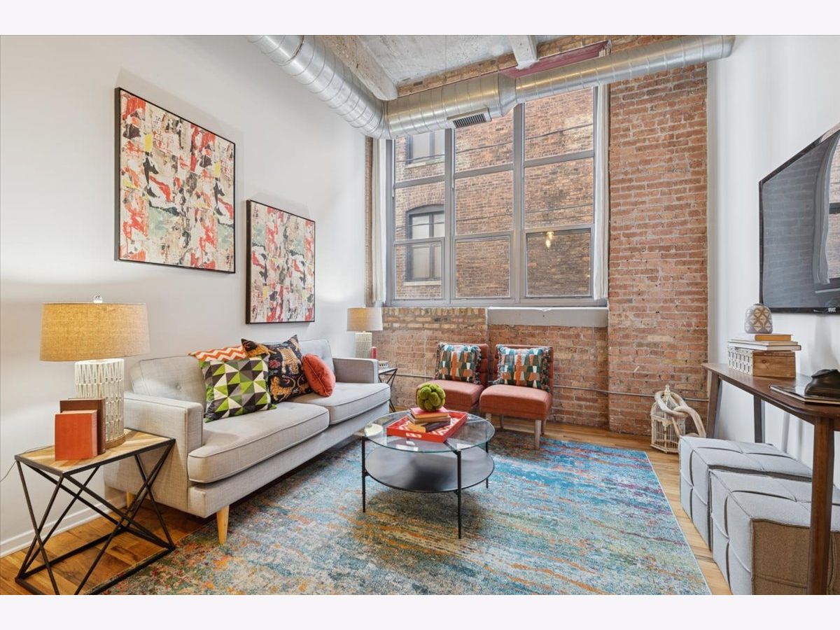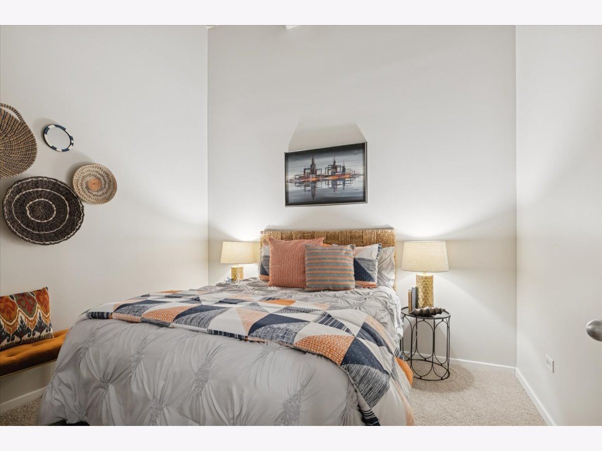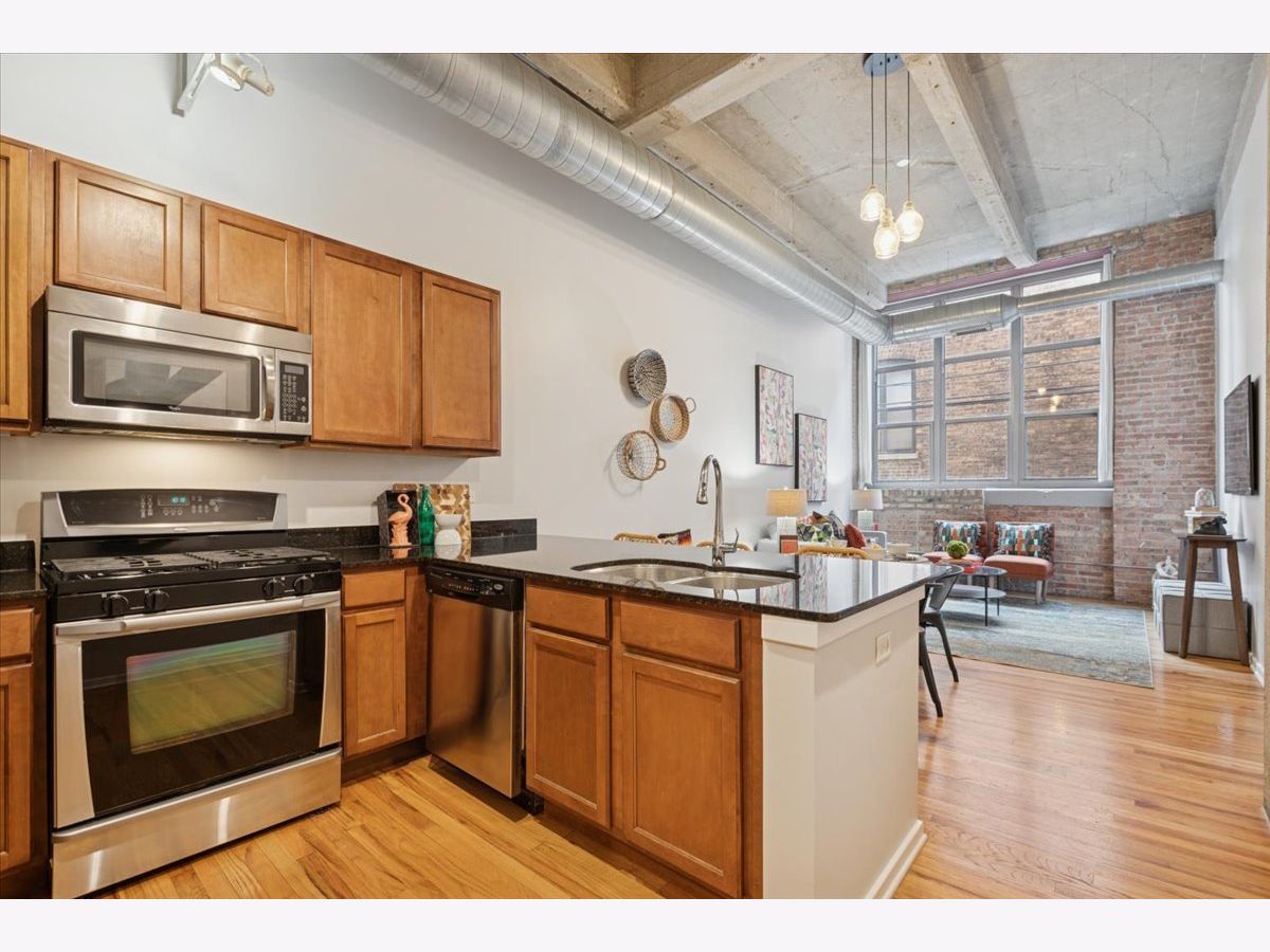 Spacious two-bedroom, two-bath residence located in one of Bucktown's most sought-after loft communities, complete with a deeded garage parking space. Dramatic soaring concrete ceilings and authentic brick accents create a true loft aesthetic. Exceptional storage throughout, highlighted by an oversized walk-in closet measuring approximately 9x6. The kitchen flows seamlessly into the living and dining areas and features stone countertops, a peninsula for casual seating, and modern steel-finish appliances. Rich wood flooring runs throughout the main living spaces. The primary suite includes a private bathroom with dual vanities, a separate enclosed shower, and a soaking tub. Convenient in-home laundry. Residents enjoy access to a well-equipped gym, expansive rooftop terrace, and an entertaining lounge, with direct access across the street to the start of the Bloomingdale Trail. Recent updates include fresh paint, new carpeting, new HVAC and updated lighting. Investor friendly building.