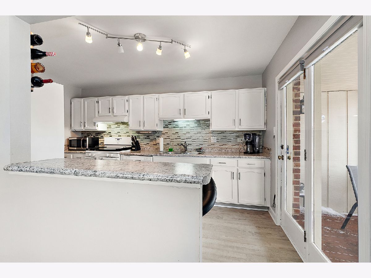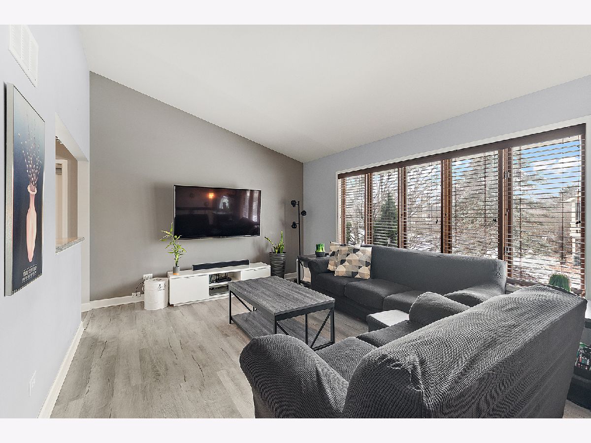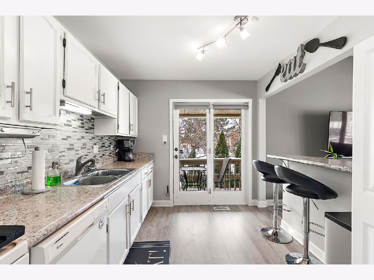Welcome to Cambridge Place. Soaring ceilings highlight the spacious living room, featuring a convenient pass-through to the kitchen. Showcased with bright, white cabinetry, a coordinating backsplash, and an island with seating. A separate area provides additional dining space. Solid surface flooring runs throughout the main level. Sliding glass doors lead to a raised, covered deck, with just a few steps down to a second private deck overlooking grassy area in this end-unit townhome. The main level offers two bedrooms and a full bath. The finished lower level provides an excellent related living or guest option, complete with a large recreation area, 3rd bedroom/office, full bathroom, and laundry area. Additional features include a front-load two-car garage and thoughtful layout ideal for comfortable everyday living and entertaining. One block from the park and close to shopping, expressway and schools. The HOA covers water, garbage, exterior maintenance, including roofs, siding and balconies, common insurance, lawn care and snow removal.