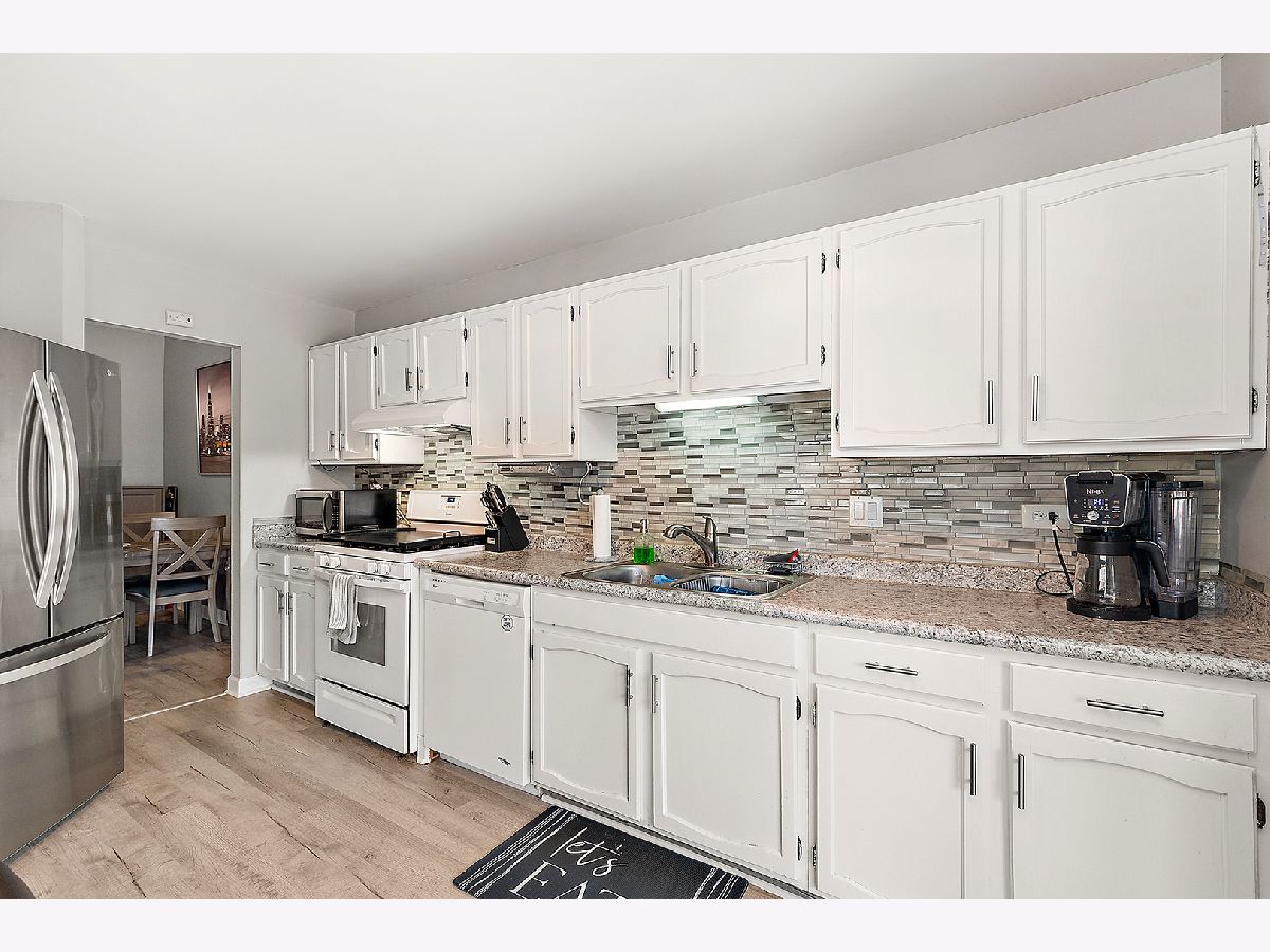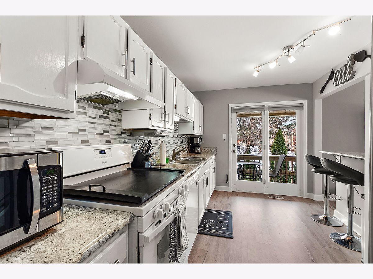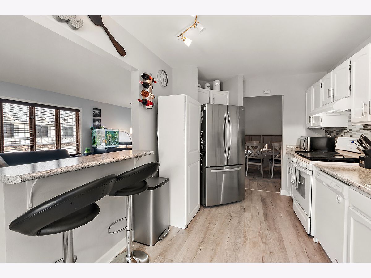 Welcome to Cambridge Place. Soaring ceilings highlight the spacious living room, featuring a convenient pass-through to the kitchen. Showcased with bright, white cabinetry, a coordinating backsplash, and an island with seating. A separate area provides additional dining space. Solid surface flooring runs throughout the main level. Sliding glass doors lead to a raised, covered deck, with just a few steps down to a second private deck overlooking grassy area in this end-unit townhome. The main level offers two bedrooms and a full bath. The finished lower level provides an excellent related living or guest option, complete with a large recreation area, 3rd bedroom/office, full bathroom, and laundry area. Additional features include a front-load two-car garage and thoughtful layout ideal for comfortable everyday living and entertaining. One block from the park and close to shopping, expressway and schools. The HOA covers water, garbage, exterior maintenance, including roofs, siding and balconies, common insurance, lawn care and snow removal.