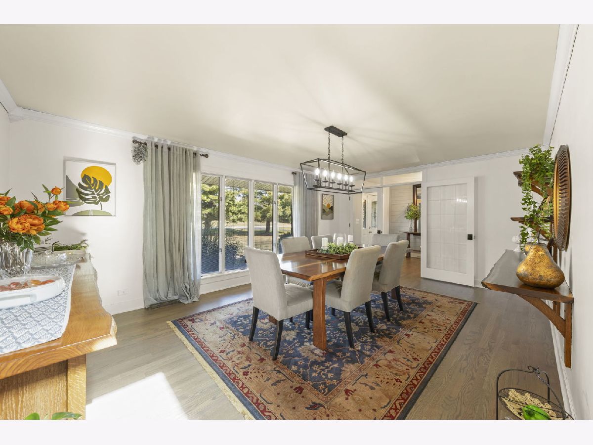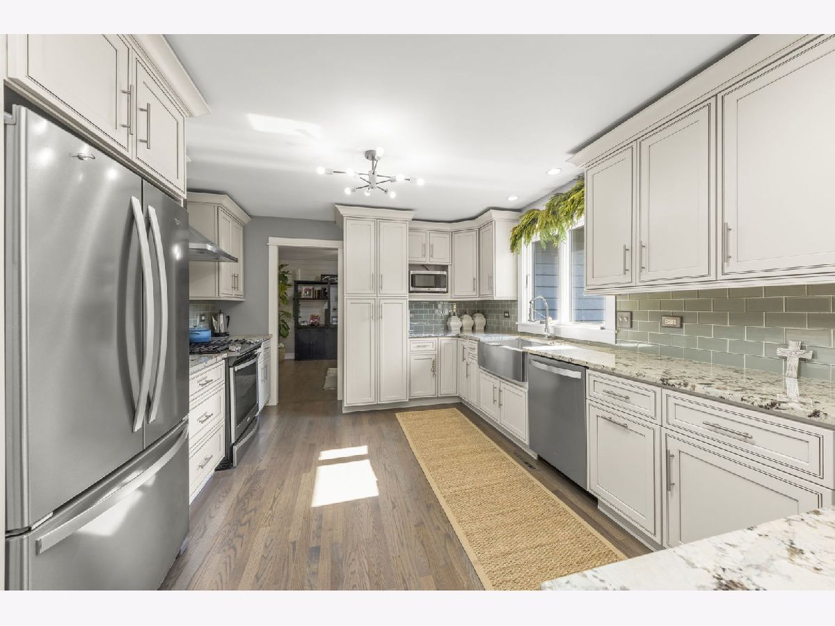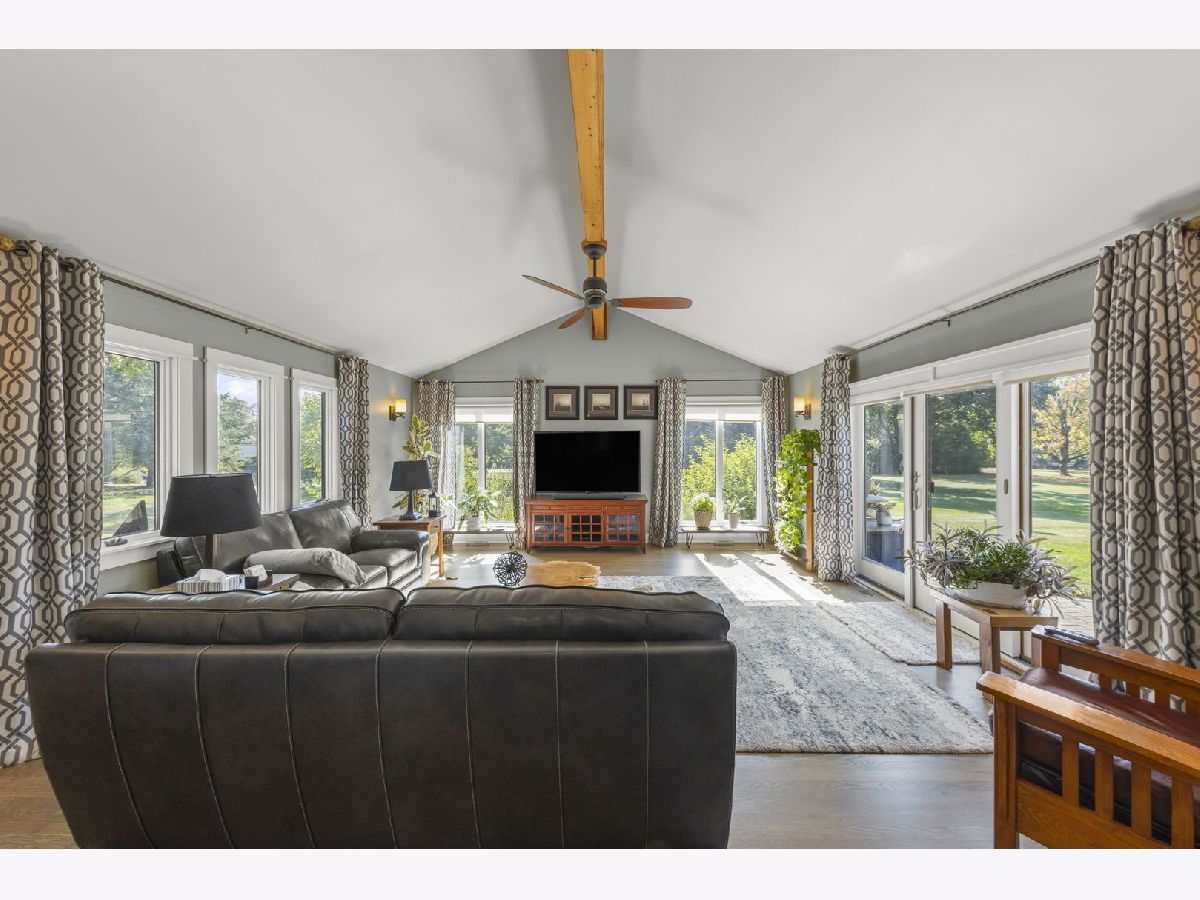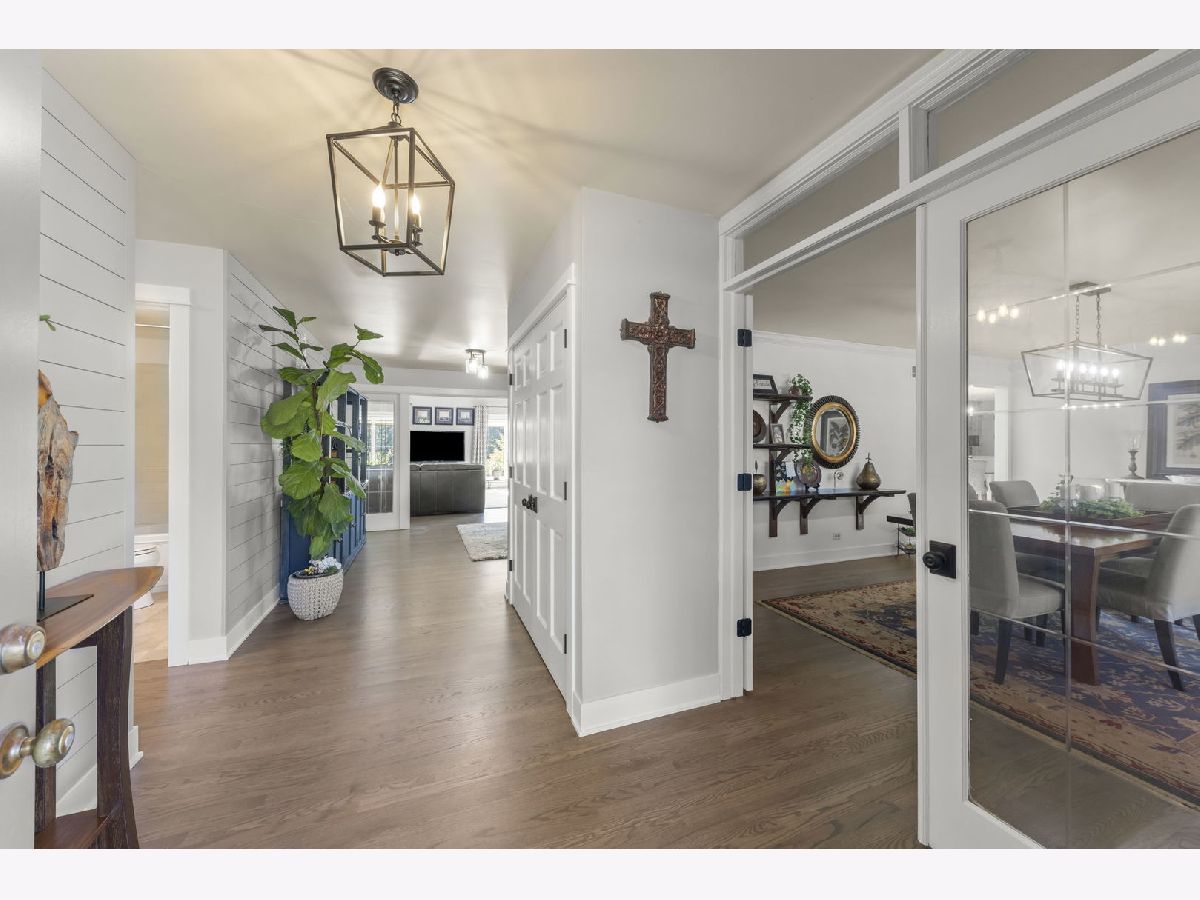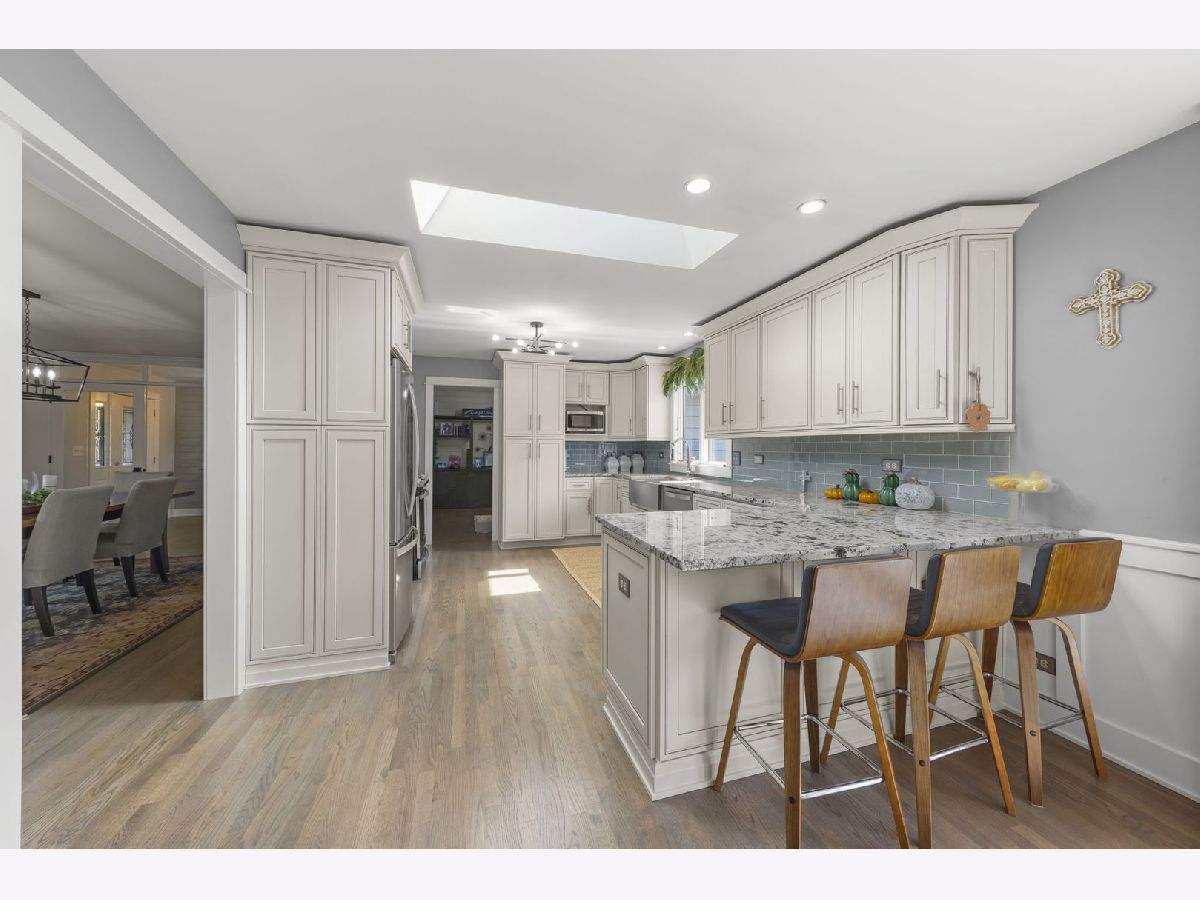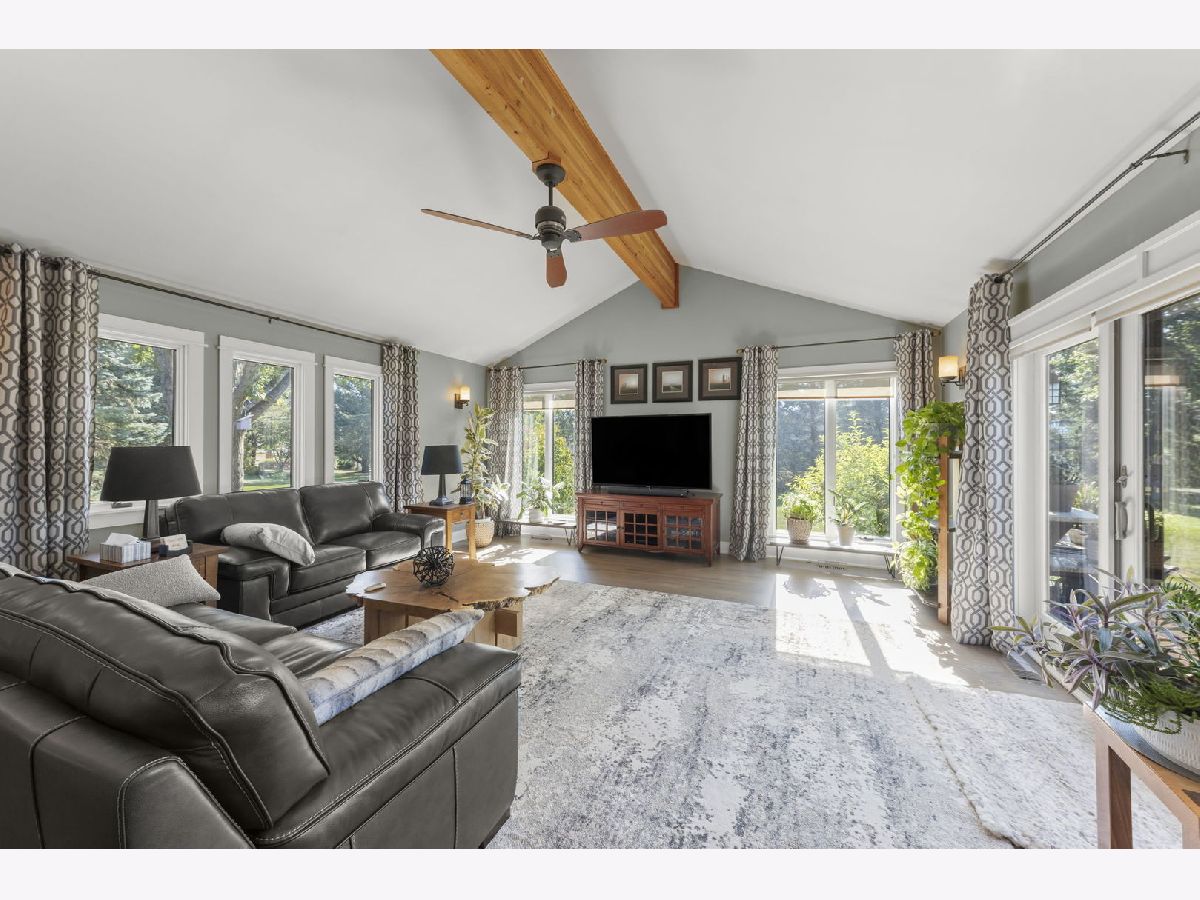 Welcome to this beautifully updated 3-bedroom, 3-bathroom all-brick ranch perfectly situated on a spacious, landscaped lot surrounded by mature trees and open green space. This meticulously maintained home blends timeless construction with stylish modern updates, offering an inviting layout ideal for both everyday living and entertaining. Step inside to discover warm hardwood floors, elegant trim work, and abundant natural light throughout. The open-concept design features a sophisticated living area with vaulted ceilings, exposed beam, and panoramic windows that frame peaceful backyard views. French doors open to a bright and versatile living room, while the formal dining room provides a perfect setting for gatherings. The gourmet kitchen is a showstopper-equipped with custom cabinetry, stainless steel appliances, granite countertops, a farmhouse sink, and a skylight that fills the room with sunshine. The adjoining family room features a modern gas fireplace and a comfortable, welcoming atmosphere. Each of the three full bathrooms has been tastefully remodeled with contemporary finishes, tile detailing, and updated fixtures. The private primary suite offers comfort and elegance, while the additional bedrooms provide flexibility for family or guests, Outdoors, enjoy the ultimate retreat-a stunning paver patio surrounded by vibrant landscaping, perennial gardens, and mature evergreens for privacy. Perfect for morning coffee, evening entertaining, or relaxing under the stars. The oversized 3-car garage provides ample space for vehicles, storage, and workshop potential. Additional highlights include a newer roof, energy-efficient windows, updated lighting, and a beautifully landscaped yard with plenty of room for recreation or gardening. Ideally located in a quiet, established neighborhood close to shopping, dining, and parks-this home offers the perfect blend of comfort, quality, and style.