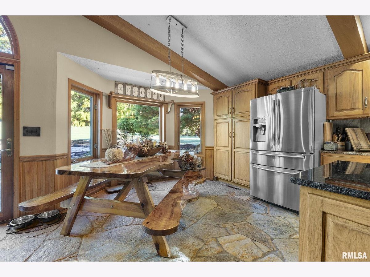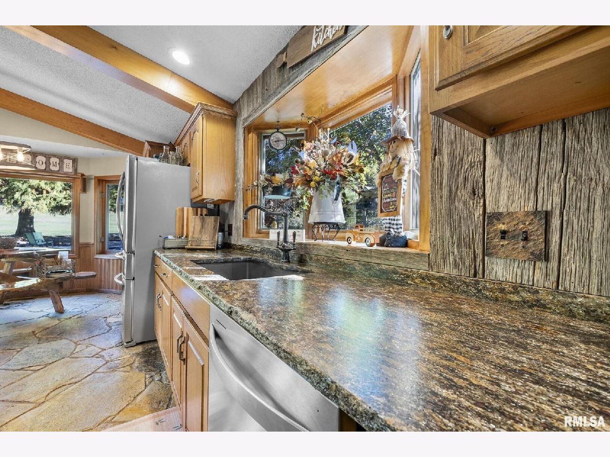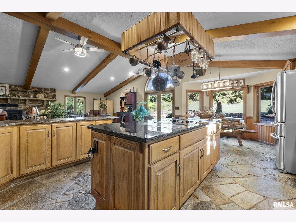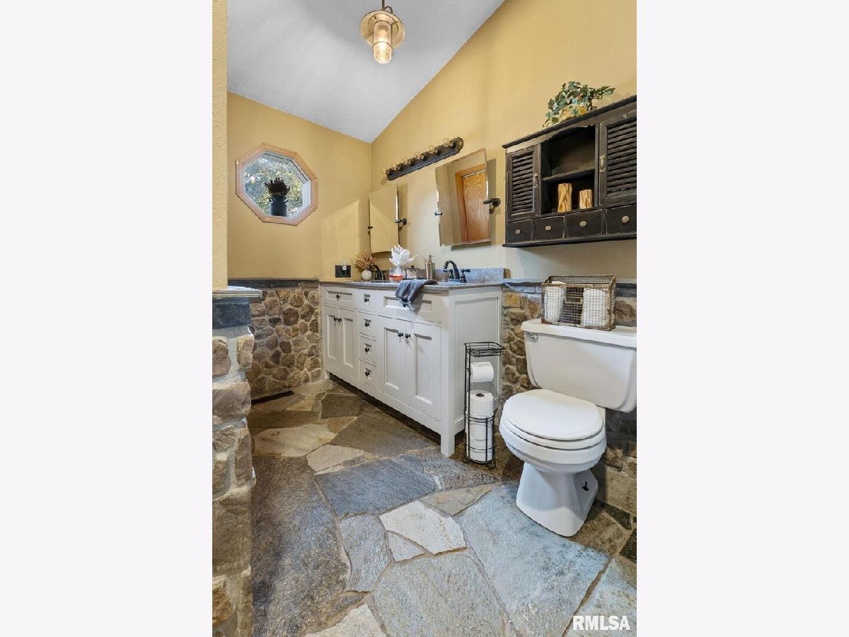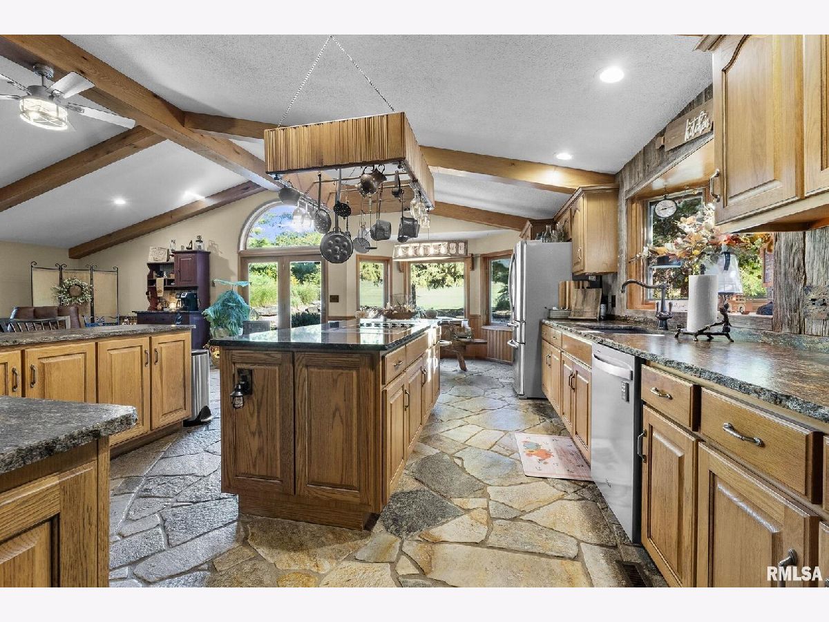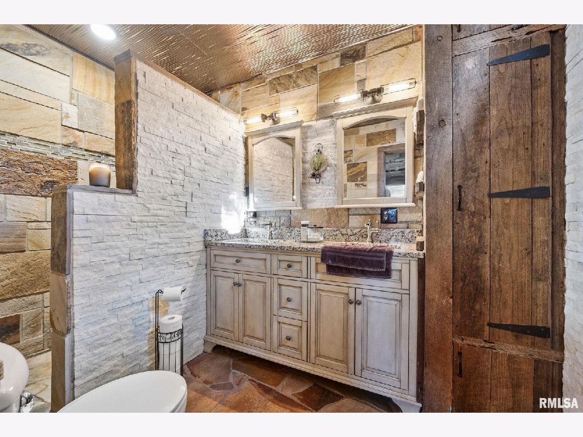 Your inner peace starts when you head down a picturesque country road, canopied by mature trees that lead you to your 21.5 +/- acre property waiting to erase the stresses of the day! This custom home and property were hand-crafted by the current owner, and no corners were cut. Natural landscaping stone touches every corner of this spacious home and picturesque patio. Words are not able to do justice to the tranquil and lush outdoor patio showcasing koi ponds connected by streams, various waterfalls, and water features. A gazebo area that features a custom-made hexagon stone table with ample seating, along with a custom serving table. Steps away from the house, you will find 3 outbuildings for all your needs. Building 1 boasts a 30'x60' with a concrete floor, insulated and heated. Complete with 3 automatic garage doors, 2 walk-in doors, and a 13'x60' lean-to off the back side. Building 2 is 22'x18' with a concrete floor, a garage door, and walk doors. Building 3 is 18'x16', perfect for a wood shop or mancave/she-shed. A concrete floor covered with easy walk foam floor, electric, heat, and A/C. The driveway boasts custom-designed pavers that add a beautiful touch as you drive into the property. The remaining property has a small ag field that is currently being used for farming, a great wooded area that borders some of the Shawnee Nation Forest, and a fully stocked pond. The pond is surrounded by cypress trees and has its own dock, a 5-hp commercial aerator, and is fully stocked! This pond is full of large Catfish, Bluegill, and Bass! Whether you enjoy hunting, fishing, or just enjoying the peaceful outdoors, this property has it all. The home boasts approximately 3,800 square feet of custom high-end touches that are tastefully rustic and extremely well done. As you enter the great room, you will fall in love with the natural stone fireplace that encompasses the entire wall and includes a custom barn wood firebox. The floors are gorgeous natural stone that span the entirety of this main floor. This open concept room includes a large kitchen area and is the perfect marriage of high-end touches. The granite countertops are highlighted on the very large entertaining island that seats 6, while the cooking island allows you to interact with guests while preparing meals. Off the side of the island area is a spacious dining area with a beautiful view through the picture windows looking out to the patio area. A step up from the great room takes you into a perfect private dining area surrounded by barn wood wainscoting. Onward takes you to another sitting area and a gorgeous fireplace! The theme of natural stone and rustic feel continues throughout this level. The main floor is complete with a laundry room, office, full bath off the great room, and a master suite with another full bath. The master suite is as rustic and cozy as it gets. With reclaimed barn wood, rustic barn tin, and natural stone work in the master bath, this is a must-see master area! Upstairs features 4 more bedrooms and a full bath! Perfect for hosting guests and family. This whole level of space provides plenty of privacy and space for your family or guests. This property truly has so much to offer and is a must-see to appreciate the true beauty the current owner has put into it.