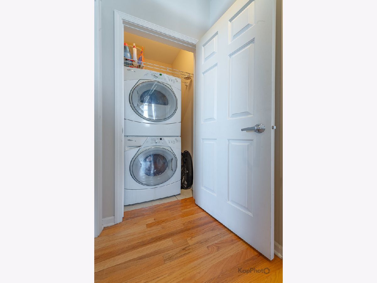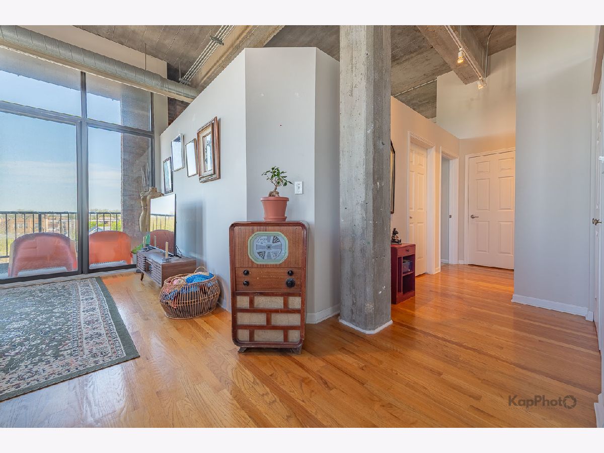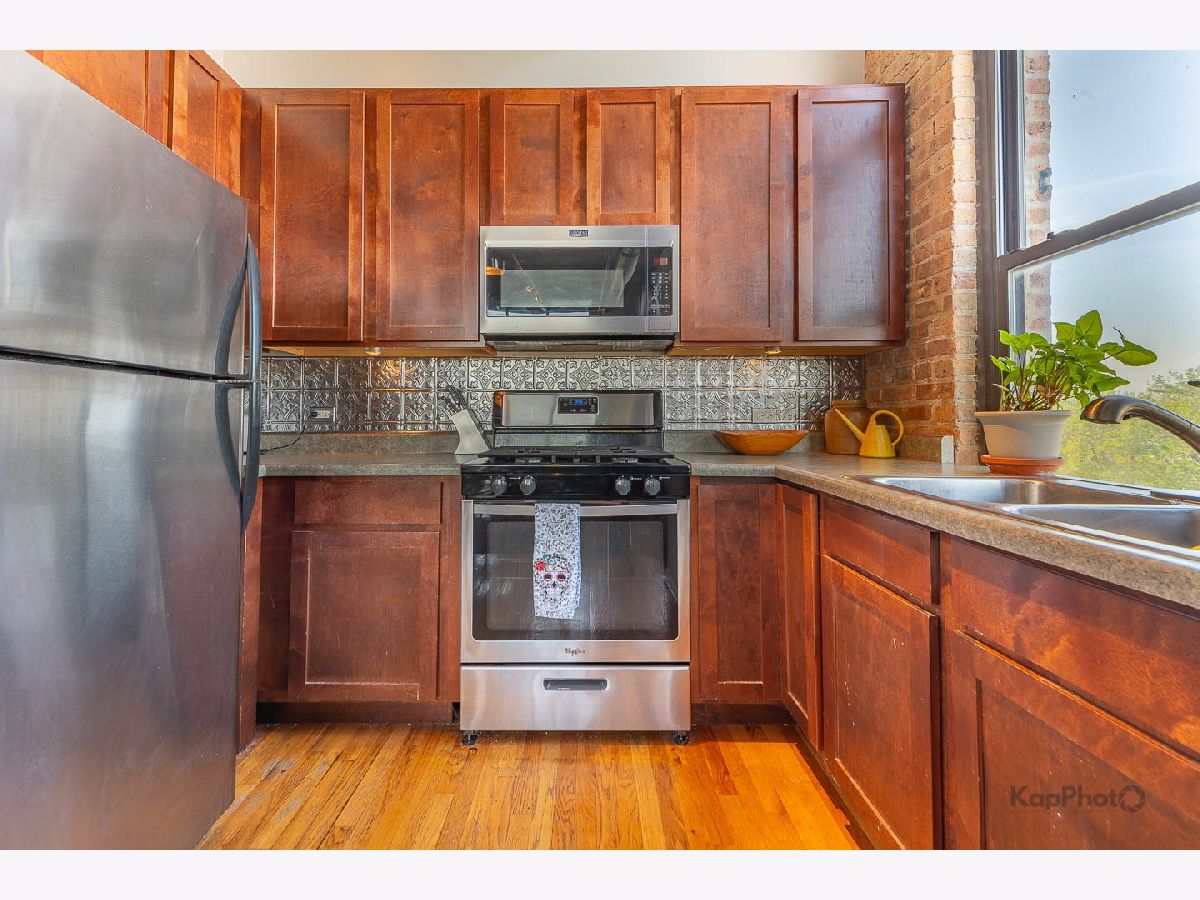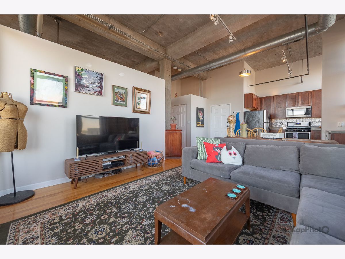 Great opportunity to own this corner 2 bed/1 bath condo/artist loft with access to the 606 Trail in Logan Square. Spacious living/dining room combo with large windows that saturate the space with natural light. Beautiful hardwood floors throughout the common areas of the unit. Kitchen contains 42-in. cabinets and stainless steel appliances. Bathroom has a double sink and natural stone tile. Both bedrooms have exposed brick walls and large windows. There is an in-unit washer/dryer combo and a huge private balcony. In addition, there is access to the rooftop deck that offers amazing views of the city. A parking space inside a gated lot is included. Plenty of amenities in the neighborhood for you to enjoy. Must see!