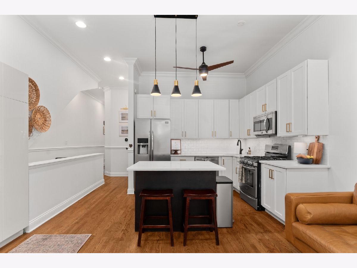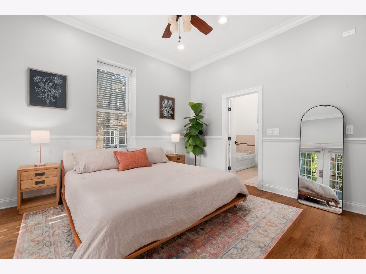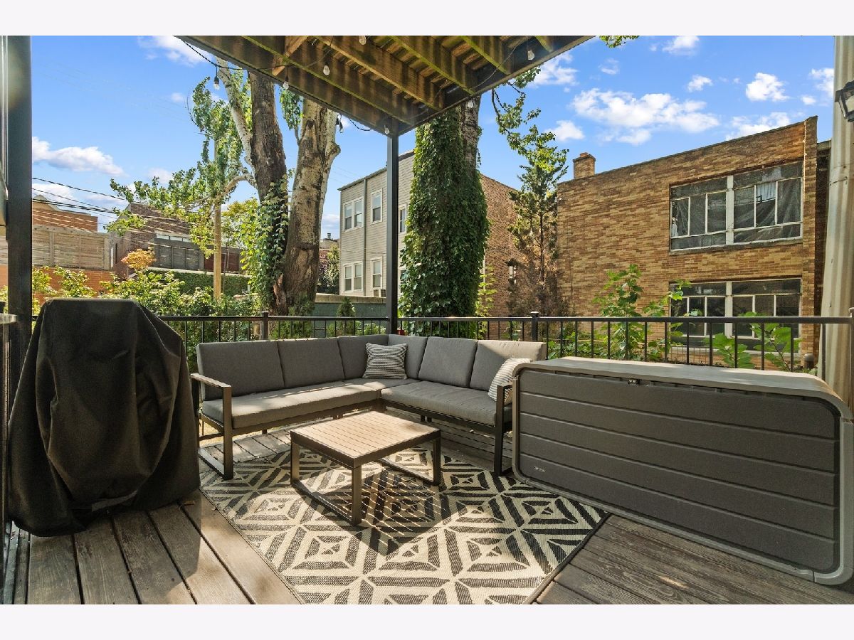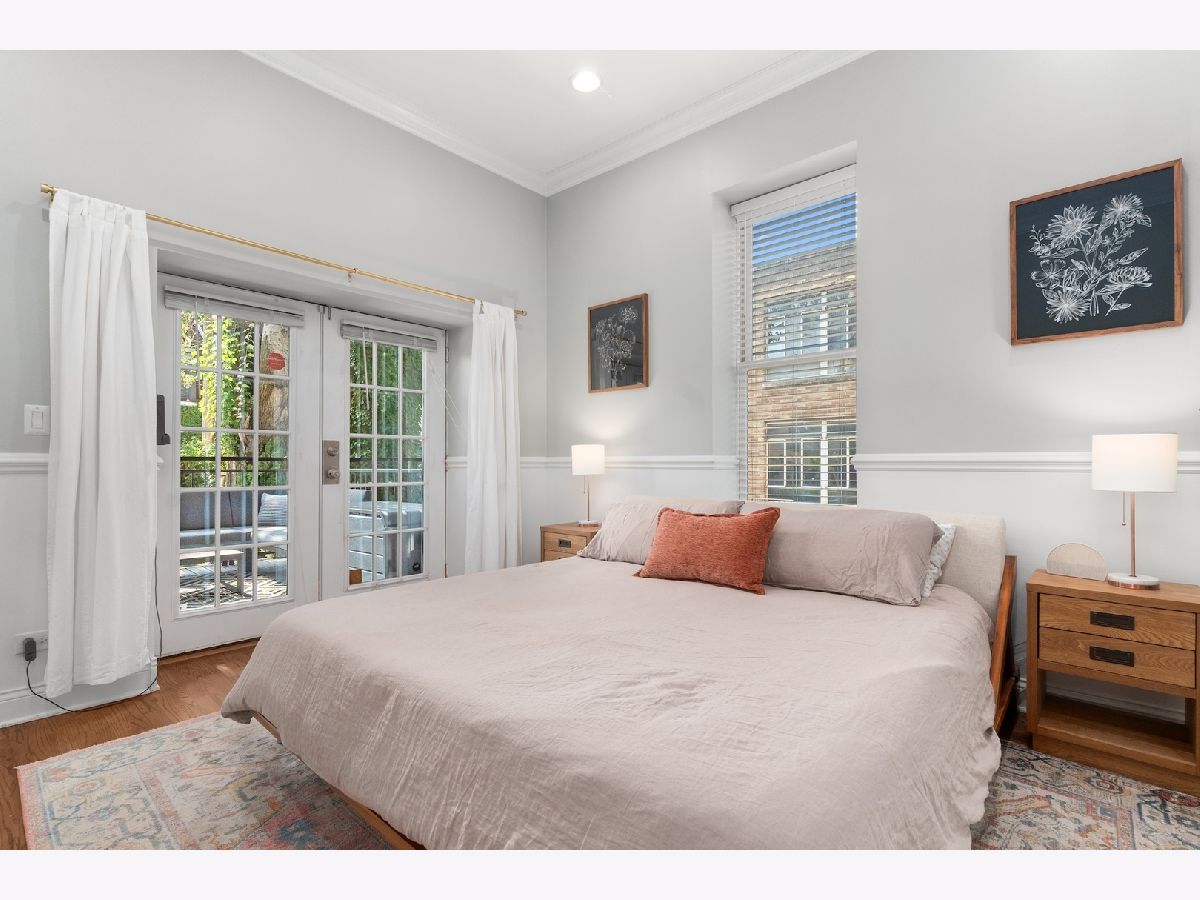 Tucked away on a quiet, tree-lined residential street in Ukrainian Village, this gorgeous 3-bedroom, 2.5-bath duplex-down offers the space and feel of a single-family home with the convenience of condo living. A private street-level entry welcomes you into your own foyer, eliminating shared hallways and setting the tone for a truly private living experience. The main level features soaring 11-foot ceilings, refinished hardwood floors, and an open, airy layout ideal for both everyday living and entertaining. The kitchen is outfitted with stainless steel appliances, ample cabinetry, and a generous island with counter seating, opening seamlessly to a large dining area that comfortably accommodates a table for six to eight. Just off the kitchen is the spacious primary suite, easily fitting a king-sized bed and offering a luxurious en-suite bath with dual vanities, a walk-in shower, a soaking tub, and a striking backlit mirror with built-in TV. Also on this level is a sizable second bedroom with excellent closet space and a recently updated powder room, perfectly placed for guests. The lower level is equally impressive, featuring a large family or recreation room with high ceilings and lookout windows that keep the space bright and inviting. The third bedroom is generously sized and versatile, ideal as a guest room, home office, or both, and is adjacent to a beautifully updated full bath with a tub/shower combination, glass enclosure, and modern vanity. This level also includes a laundry and mechanical room with side-by-side washer and dryer, a tankless hot water heater, and additional storage. Outdoor living is a standout feature, with a large private deck accessible from both the primary suite and the main hallway, overlooking a fully fenced and secured grassy backyard. One exterior parking space is included and is conveniently located just outside the fenced yard. The location is unbeatable, just steps from the shops and restaurants along Chicago and Division, Mariano's, Eckhart Park, Dark Matter Coffee, and the Division Blue Line stop, with quick access to I-90/94. Set within a well-maintained building with a strong sense of community, this home truly checks every box and is the one you've been waiting for.