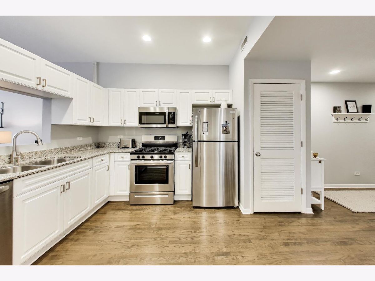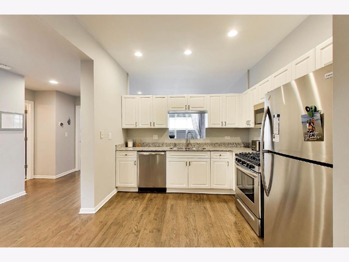 Experience the perfect blend of space and style in the heart of Chicago's vibrant Ravenswood/Lincoln Square neighborhood. Situated in an intimate elevator building, this spacious, renovated one-bedroom condo offers quiet western exposures and soaring extra-tall ceilings. The generous entry foyer, featuring a large guest closet, leads into a bright, open floor plan anchored by gleaming hardwood floors. The oversized kitchen is a chef's delight, boasting 42" white cabinetry with new hardware, granite countertops, and a suite of newer stainless-steel appliances (Refrigerator 2025, Range 2024, Microwave 2022). The living area is bathed in natural light through a wall of windows, offering ample room for a large sectional and a natural flow for entertaining. Retreat to the primary sun-filled bedroom which easily accommodates a king-sized bed and features a wall of closets. The stunning 2025 bathroom renovation includes a deep soaking tub, modern neutral tiling, and an oversized vanity for maximum storage. Enjoy the large private patio located directly off the kitchen/dining area-perfect for morning coffee or evening guests. For your convenience, an in-unit washer/dryer, massive additional storage room, and a parking space in a secured gated area are included. This location is steps from Lincoln Square's iconic dining and shopping, grocery stores, the Brown Line and Metra stations.