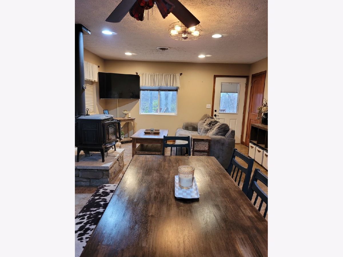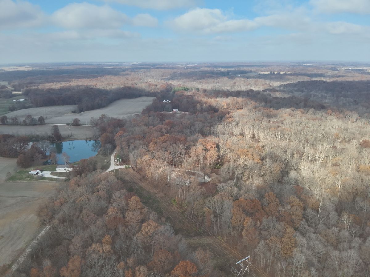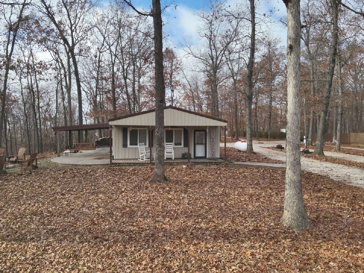 Discover peaceful country living with this unique 2 bed, 2 bath pole-barn style home nestled on 27 wooded acres at the end of a quiet dead-end road. Enjoy morning coffee on the covered porch, relax on the shaded patio, or unwind around the fire pit while taking in the sounds of nature. Inside, the cozy living room features a wood-burning stove, perfect for cool evenings. Outside, you'll appreciate the detached garage complete with a custom-built bar that stays with the property. A 20x8 concrete storm shelter is located behind the garage. Two full RV hookups and plentiful parking offer exceptional convenience for guests or outdoor enthusiasts. With abundant wildlife and room to roam, this property provides the ideal combination of comfort, privacy, and recreation.