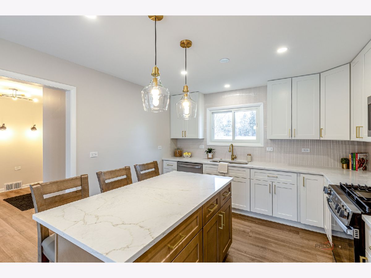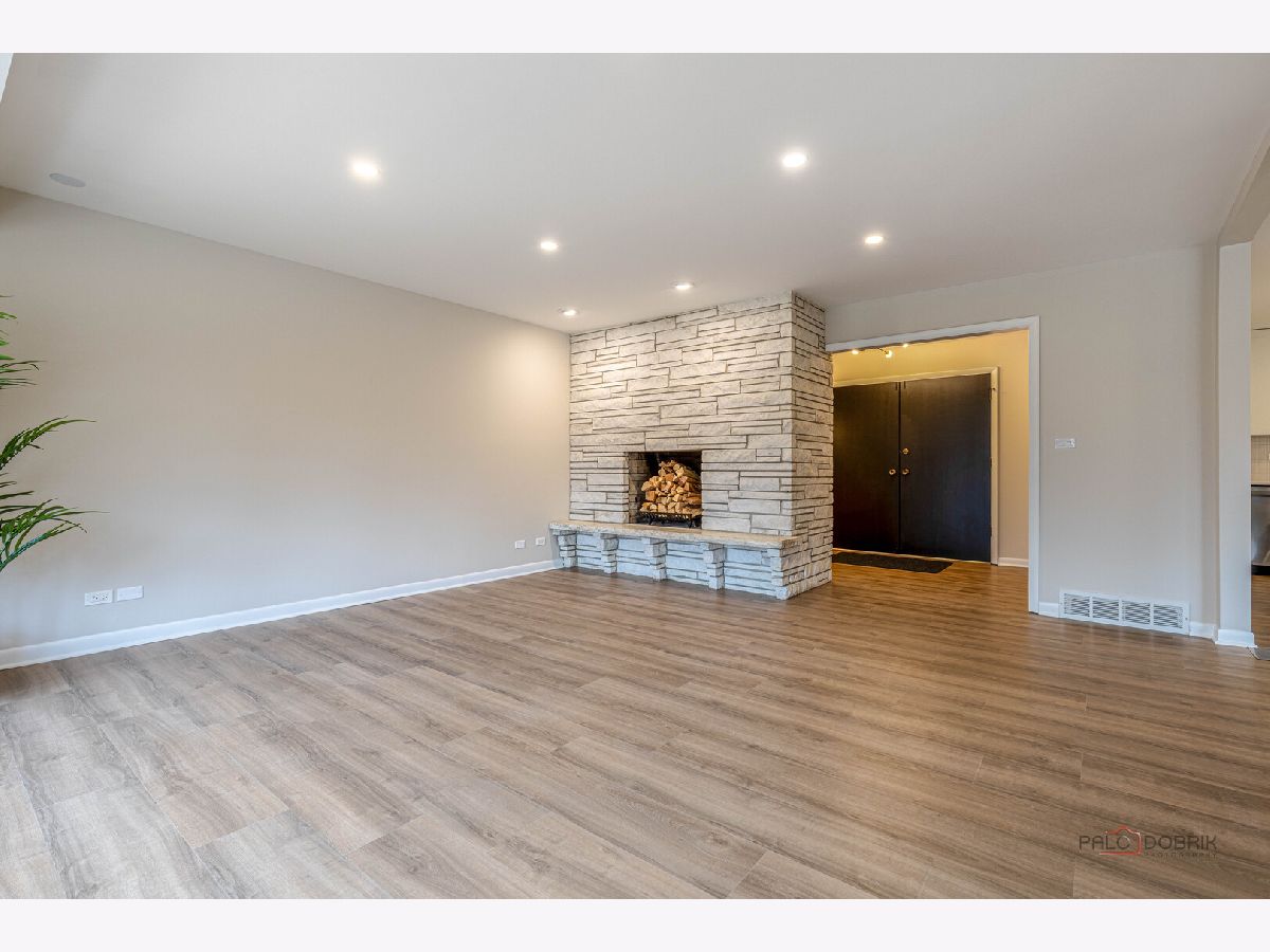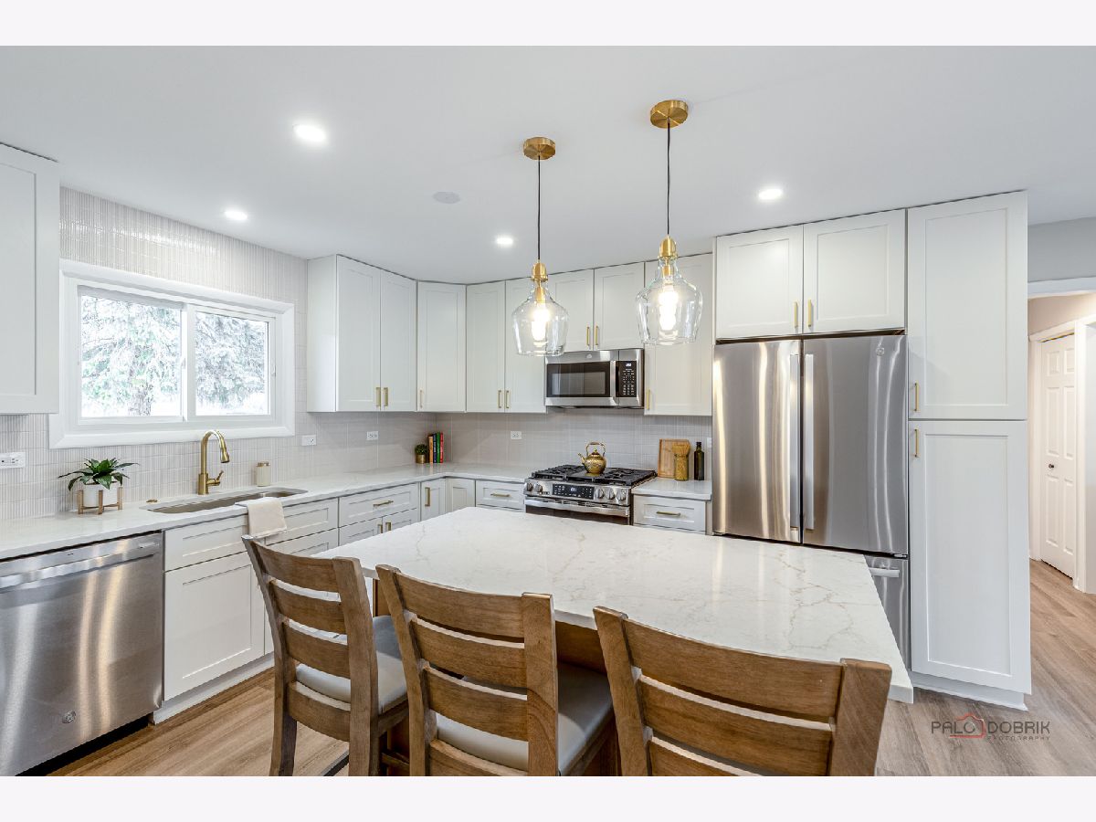 COMPLETELY REMODELED, TURN-KEY RANCH ON A PRIVATE 1.28-ACRE CUL-DE-SAC IN TOP-RATED SCHOOL DISTRICTS! This beautifully reimagined home blends today's most sought-after finishes with a functional layout - all just minutes from Independence Grove, the Metra, I-94, shopping, and dining, and located in the highly acclaimed Oak Grove Elementary and Libertyville High School districts. From the moment you arrive, the fresh limewashed brick exterior creates a crisp, modern first impression, complemented by a NEW roof, NEW windows, NEW A/C, and an inviting NEW screened-in porch (all 3 months new). Inside, brand-new luxury vinyl plank flooring flows seamlessly throughout the home, complemented by fresh paint in today's trending color palette, while new fixtures and thoughtful upgrades enhance every space. Front and center, the sun-drenched living room showcases a large bayed window and a dramatic floor-to-ceiling stone fireplace with raised hearth offering the perfect focal point for everyday living and entertaining. The completely remodeled designer kitchen (2026) is a standout feature, offering gorgeous quartz countertops, a center island with breakfast bar seating, stainless steel KitchenAid appliance package, and ample space for a dining table. A sliding door leads to the screened-in porch, creating seamless indoor-outdoor living where you can enjoy meals while taking in sweeping views of your expansive backyard all while being comfortably sheltered from the elements. When it's time to unwind, the primary suite offers a cozy desk nook, barn door entry to a large walk-in closet with custom shelving, and a beautifully updated private bath featuring a dual-sink vanity and tiled shower. Two additional bedrooms, two additional fully remodeled baths, and a convenient laundry area with new washer and dryer complete the main level. The finished basement offers incredible bonus living space, featuring white brick walls, modern ceiling, luxury vinyl floors, a spacious rec room with a wood-burning fireplace, wet bar, half bath, and flexible areas ready for your home gym, office, or hangout space. Additional highlights include an attached 2-car garage, an extra-long paver driveway with side apron providing abundant parking, and brand new electrical panel. Move-in ready, extensively updated, and ideally located; this is the one that checks every box.
