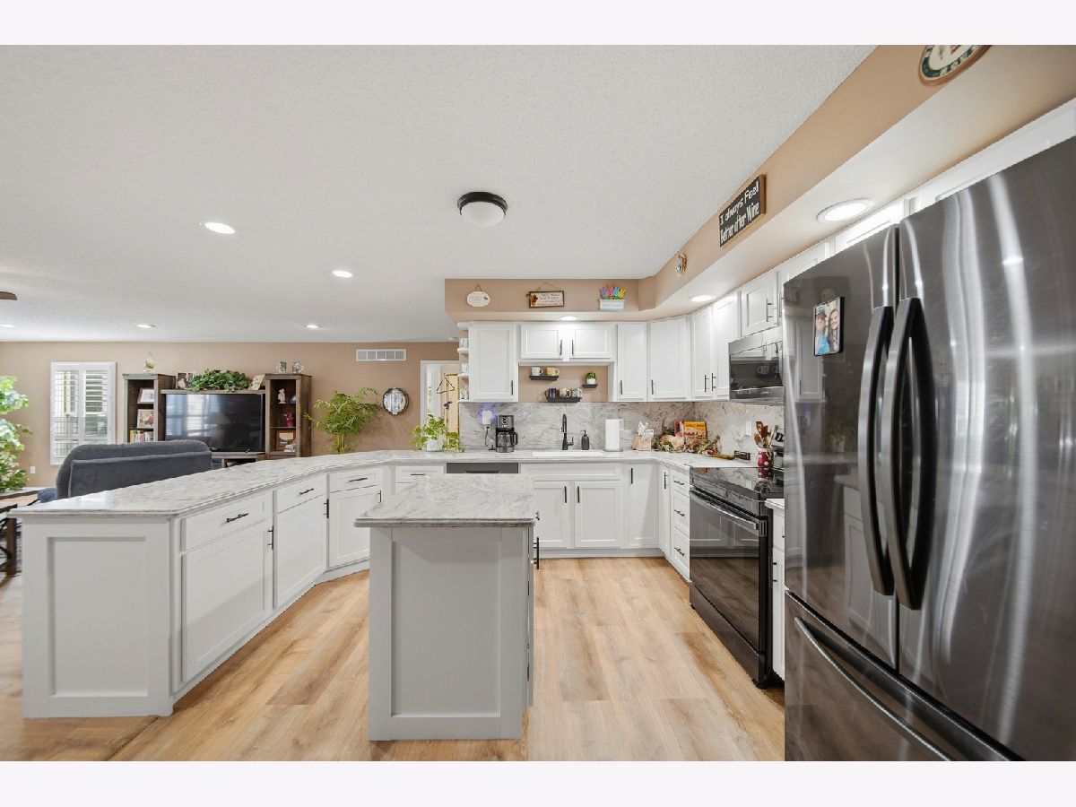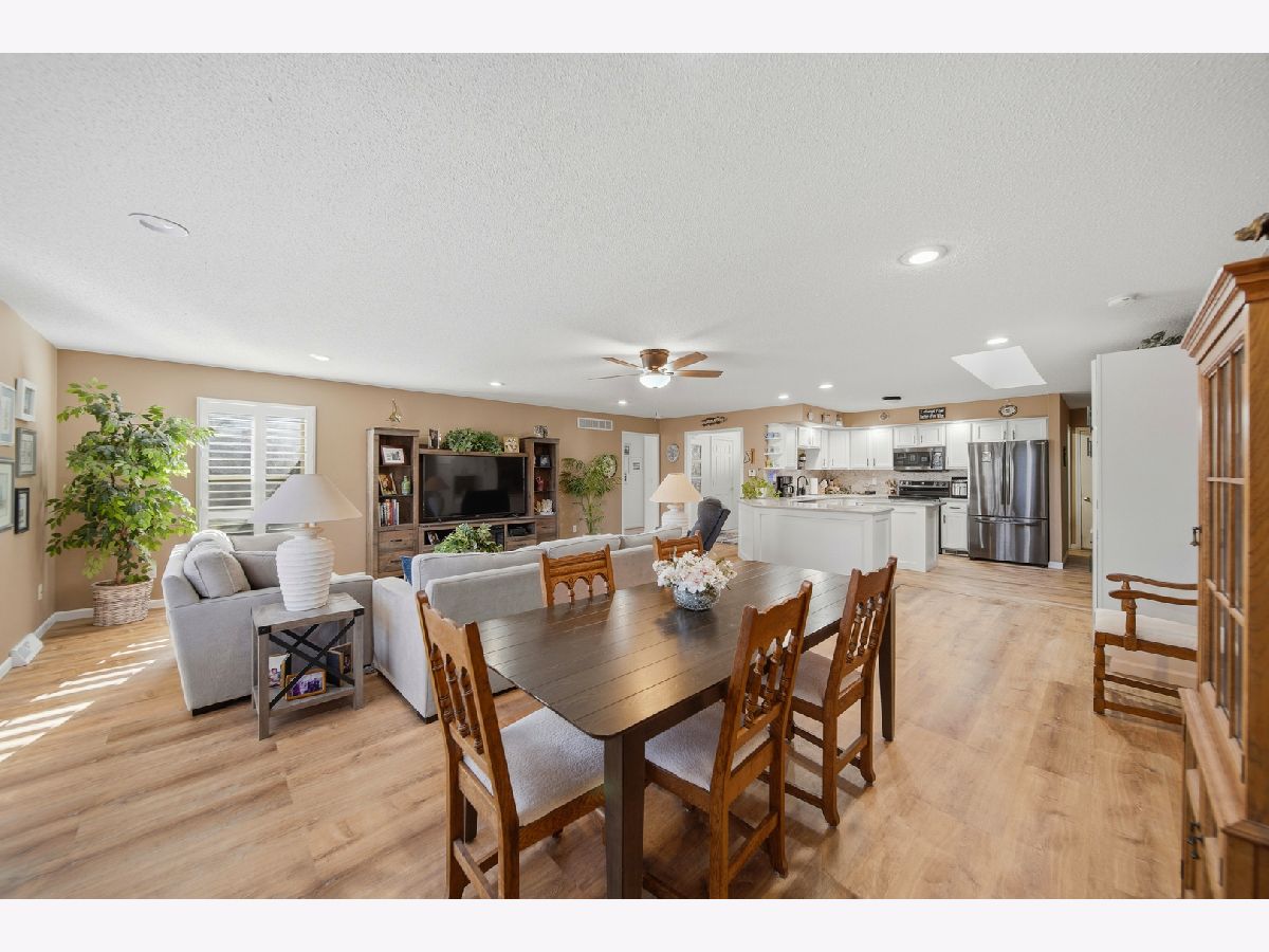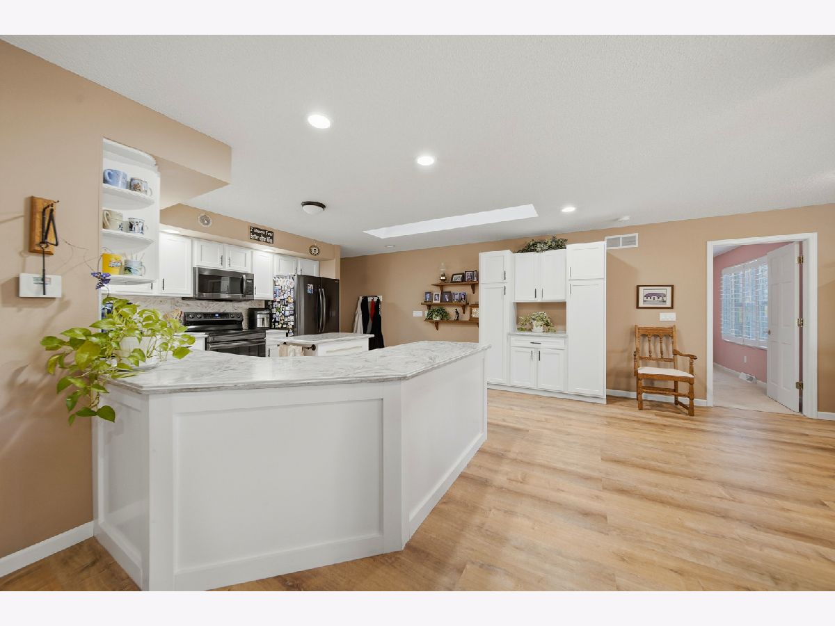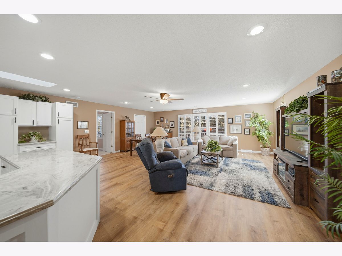 Nicely updated 3-bedroom home located on a quiet street in the heart of town. Step through the new front door into a welcoming foyer featuring new LVP flooring, which flows seamlessly into the open living room, kitchen, and dining area-perfect for everyday living and entertaining. The spacious kitchen offers new solid-surface countertops, refaced cabinets with updated hardware, a skylight, breakfast bar, and new appliances including refrigerator, dishwasher, stove, and microwave (2022). The primary bedroom is conveniently located on the main level and features a walk-in closet and a remodeled private bathroom with double vanity, tub, and walk-in shower. Two additional bedrooms and a full bathroom with updated vanity are located on the opposite side of the home. Additional updates include replaced windows and plantation shutters throughout. Main-floor laundry includes washer and dryer. The home features a heated 3-car attached garage and a full unfinished basement with an additional full bathroom-offering excellent storage or future finishing potential. Enjoy the backyard from the recently enlarged deck with pergola, plus a storage shed for yard equipment. Exterior features include alluminum siding, asphalt shingle roof, and gutter guards. Centrally located close to schools, hospital, and grocery stores-this home is move-in ready with space to grow. Call for your private showing today!!