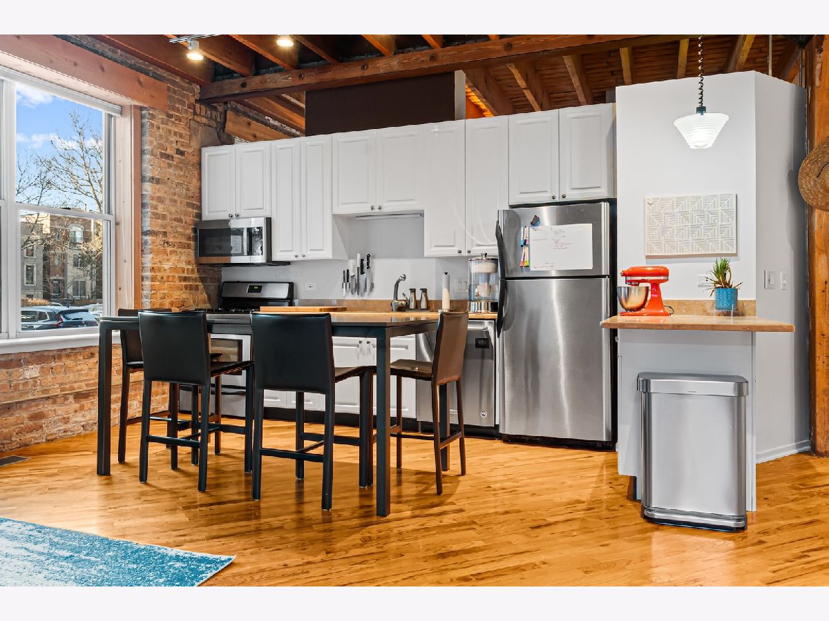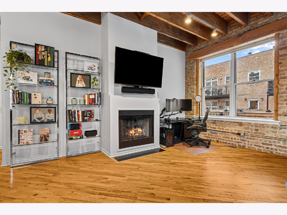 Sought-after corner unit in the beloved Willow Loft Building-where timeless loft character meets the comfort of true home living. Tucked along idyllic, tree-lined Willow Street yet just steps from Damen's vibrant shopping and dining district, the 606 Trail, and Damen Plaza, this spacious one-bedroom, one-and-a-half bath corner home offers an exceptional Bucktown lifestyle. True loft elements shine throughout: soaring timber ceilings, exposed brick, hardwood floors, decorative millwork, and a cozy gas fireplace. Sunlight pours through oversized corner windows in both the living area and bedroom, creating a warm, inviting atmosphere all day long. Rare for city living, the private yard and patio offer an outdoor sanctuary perfect for gardening, grilling, or entertaining-your own retreat right outside the living room door. The kitchen features white cabinetry, stainless steel appliances, and stone countertops. The spacious bedroom includes hardwood flooring, professionally organized closets with a large walk in.. A converted foyer closet now serves as a beautifully designed powder room, adding valuable functionality to this oversized one-bedroom layout. The primary bath includes a quartz-topped vanity and updated fixtures. Recent mechanical and system upgrades include a 50-gallon water heater (2020), washer/dryer (2020), two-stage furnace (2025), and new AC compatible with a heat pump (2025). Parking is conveniently located right outside the unit, and in-unit laundry adds everyday ease. The well-managed building offers a private gym, dedicated oversized storage, and a common rooftop deck with sweeping city views. Pet-friendly and perfectly positioned near the 606, Damen Avenue hotspots, boutiques, cafes, and transit, this home delivers the best of Bucktown loft living with unmatched charm and convenience.