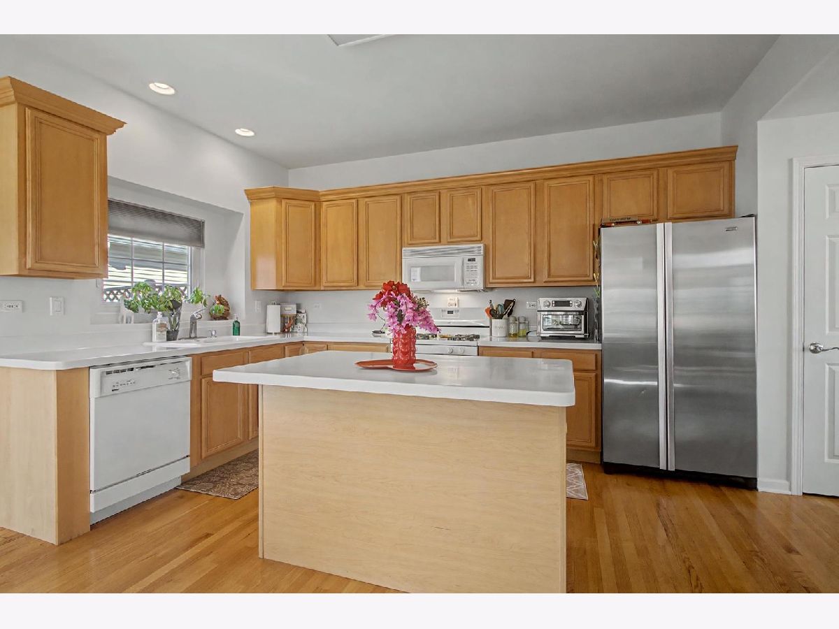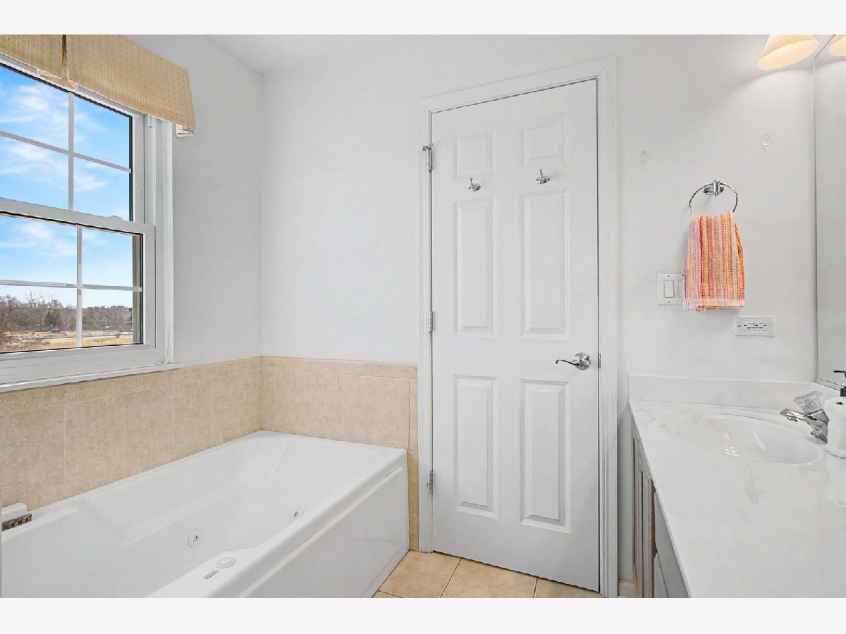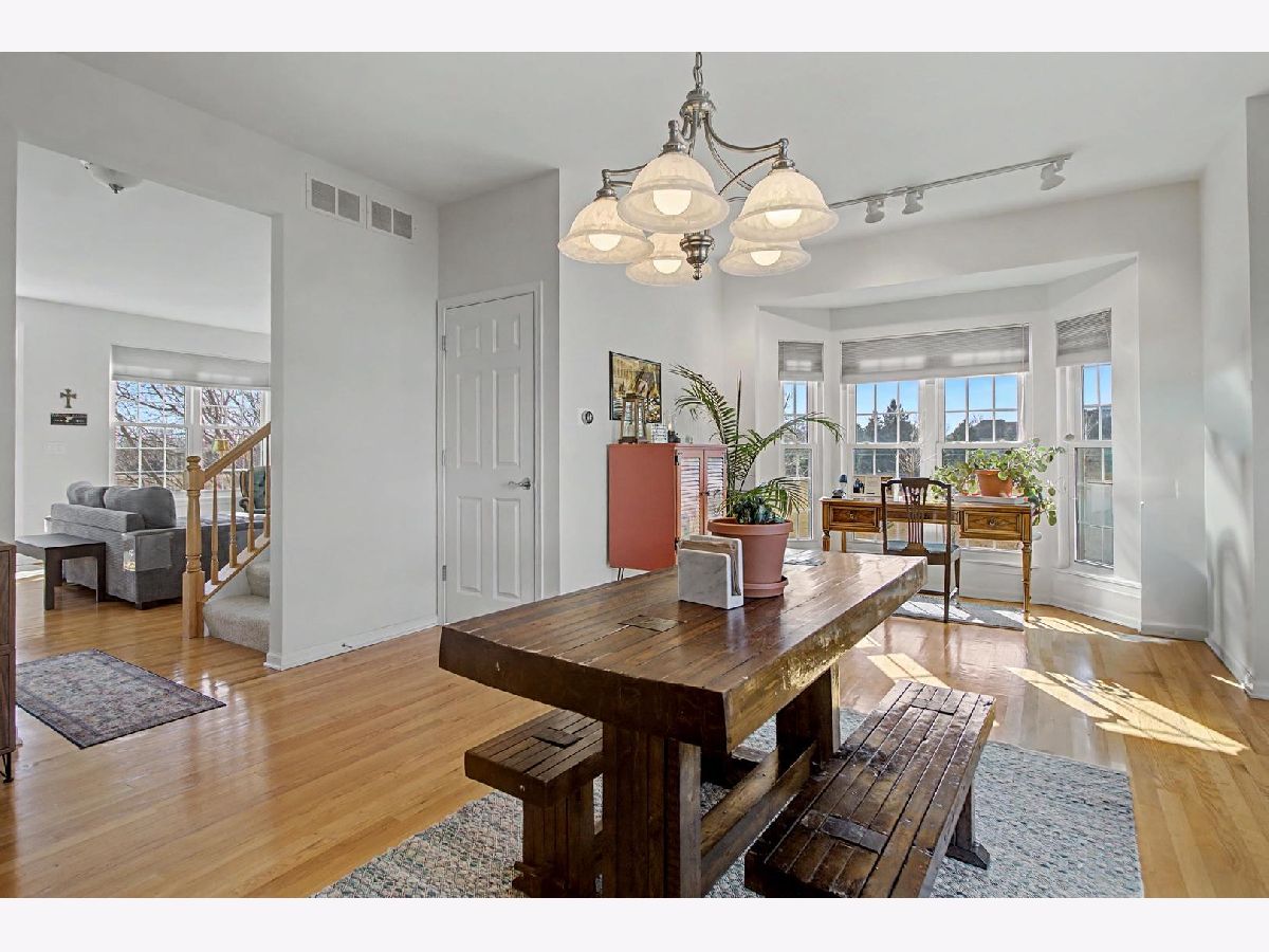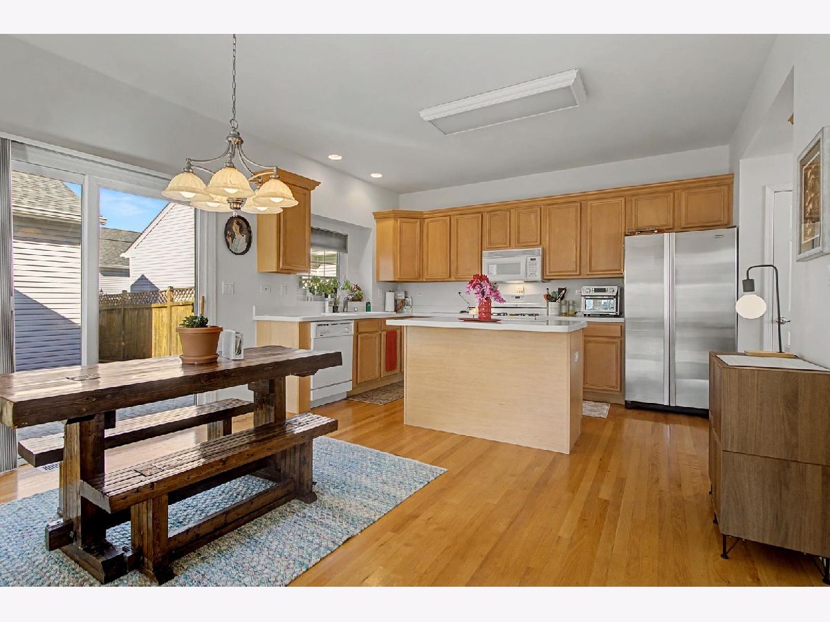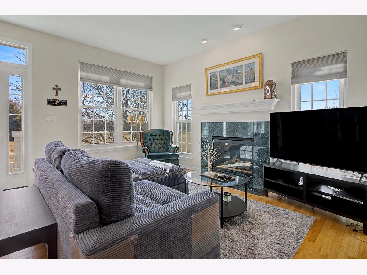 Come see this beautiful former builder's model end unit townhouse in a quiet and comfortable neighborhood located just minutes away from Kirk Road and I-88. The main level features 9 foot ceilings and wood flooring, an inviting marble fireplace for the living room, a formal dining space, ample kitchen cabinetry with center island and butler's pantry, and a lovely breakfast nook with a bay window view of open landscape. A laundry and mud room accesses the garage and is adjacent to a powder room set off the kitchen. The second level boasts an open master suite with vaulted ceiling, including a large walk-in closet and spacious bathroom with his-and-her sinks with a separate Whirlpool tub and shower. Two additional generous bedrooms and second full bathroom are found across the open upstairs area. The full unfinished basement has two large sized windows and a new HVAC system and water softener. Additionally, the basement contains a rough-in to allow for endless opportunities to create a workout space, office, or finished living area. The back patio is paved and fenced in for privacy and entertainment. Recent updates include new windows (2020), new HVAC system (2025), new water softener (2025), new gas water heater (2025), new roof (2019), new garage motor (2025), and new garbage disposal (2023). Come and see this lovely space because it won't last long! Accepting offers now!
