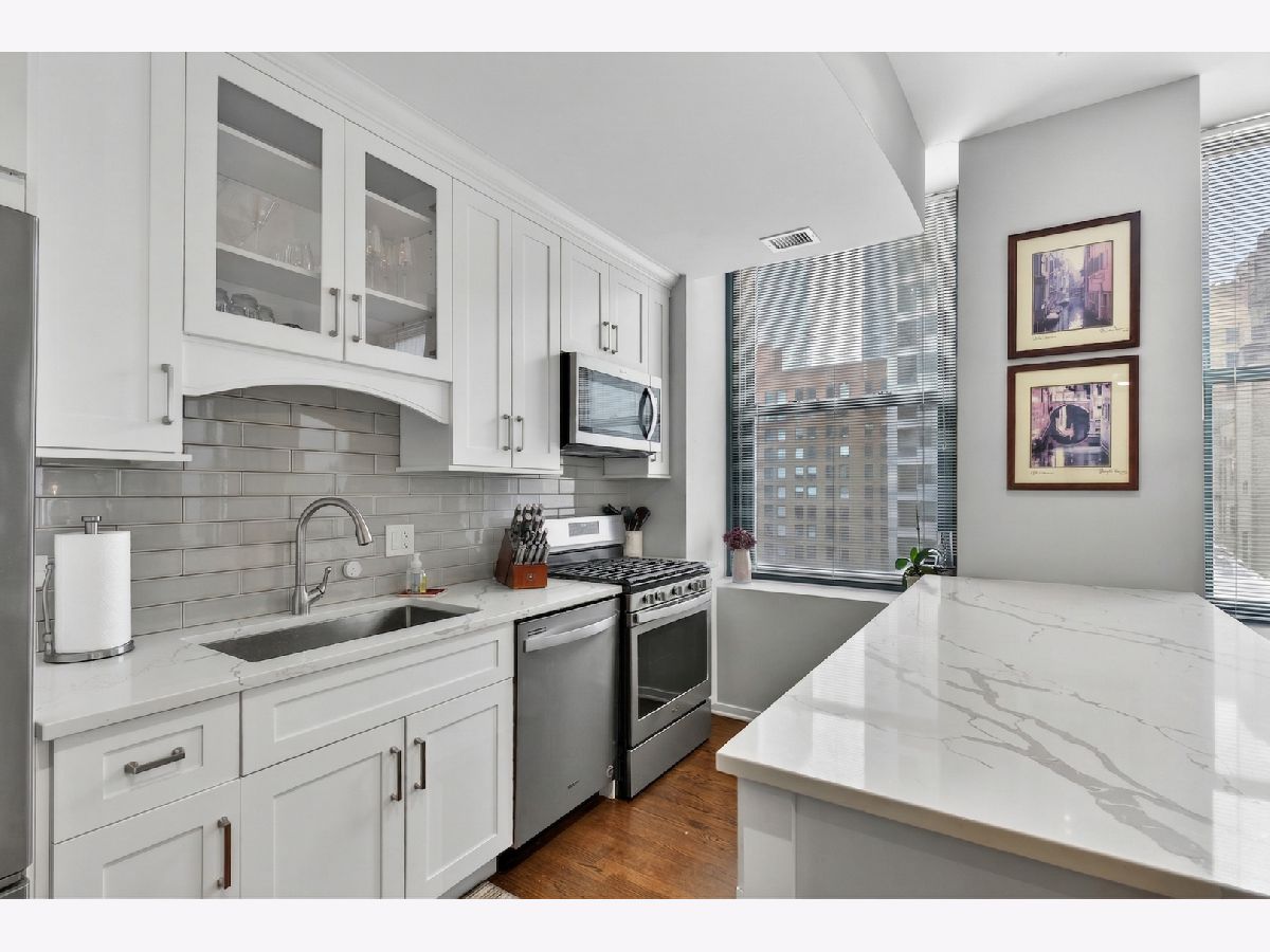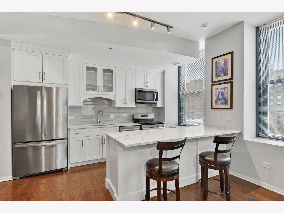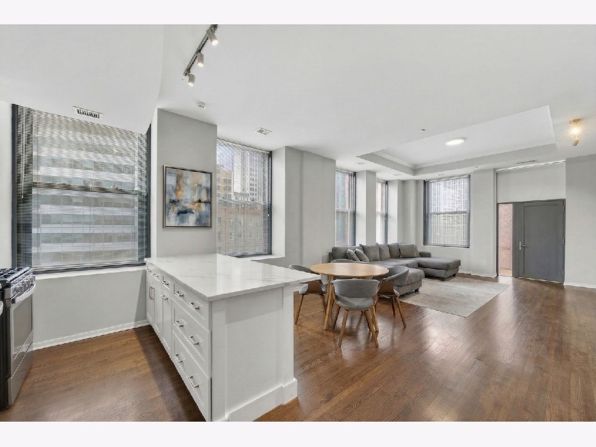 Welcome to this fabulous, sun-drenched 2-bed, 2-bath corner unit at Concord City Centre in the heart of the Loop! Boasting soaring 11-foot ceilings, gleaming hardwood floors, and extra-large windows, the open-concept layout perfectly frames gorgeous city views. Entertain effortlessly in the chef-inspired kitchen featuring new custom cabinetry, stainless steel appliances, and an oversized quartz breakfast bar. The space flows seamlessly into the dining and living area, which is highlighted by a charming tray ceiling, a cozy gas fireplace, and direct access to your private balcony equipped with a gas grill. Retreat to the luxurious primary suite, offering a spa-like en-suite bath with a double-sink quartz vanity, porcelain tiles, and an extra-large walk-in shower. The generous second bedroom features ample closet space and sits adjacent to a beautifully upgraded second full bath. Additional unit highlights include an in-unit washer/dryer, an extra-large hallway closet, a basement storage unit (#B35), and an included indoor heated garage parking space (#323). Enjoy premier, full-amenity living with 24-hour security and maintenance, a fitness center, roof deck, business center, bike room, dry cleaning pickup, and a dog run, all located just a short stroll from the Chicago Riverwalk, Grant Park, world-class dining, shopping, nightlife, and the Financial District!