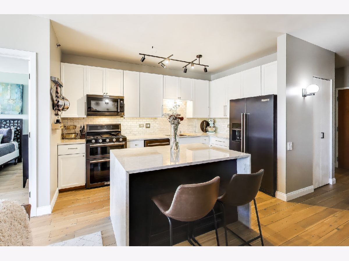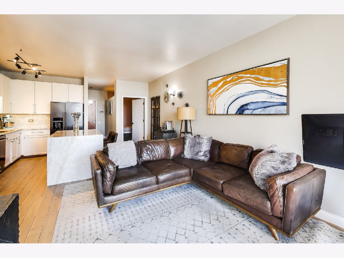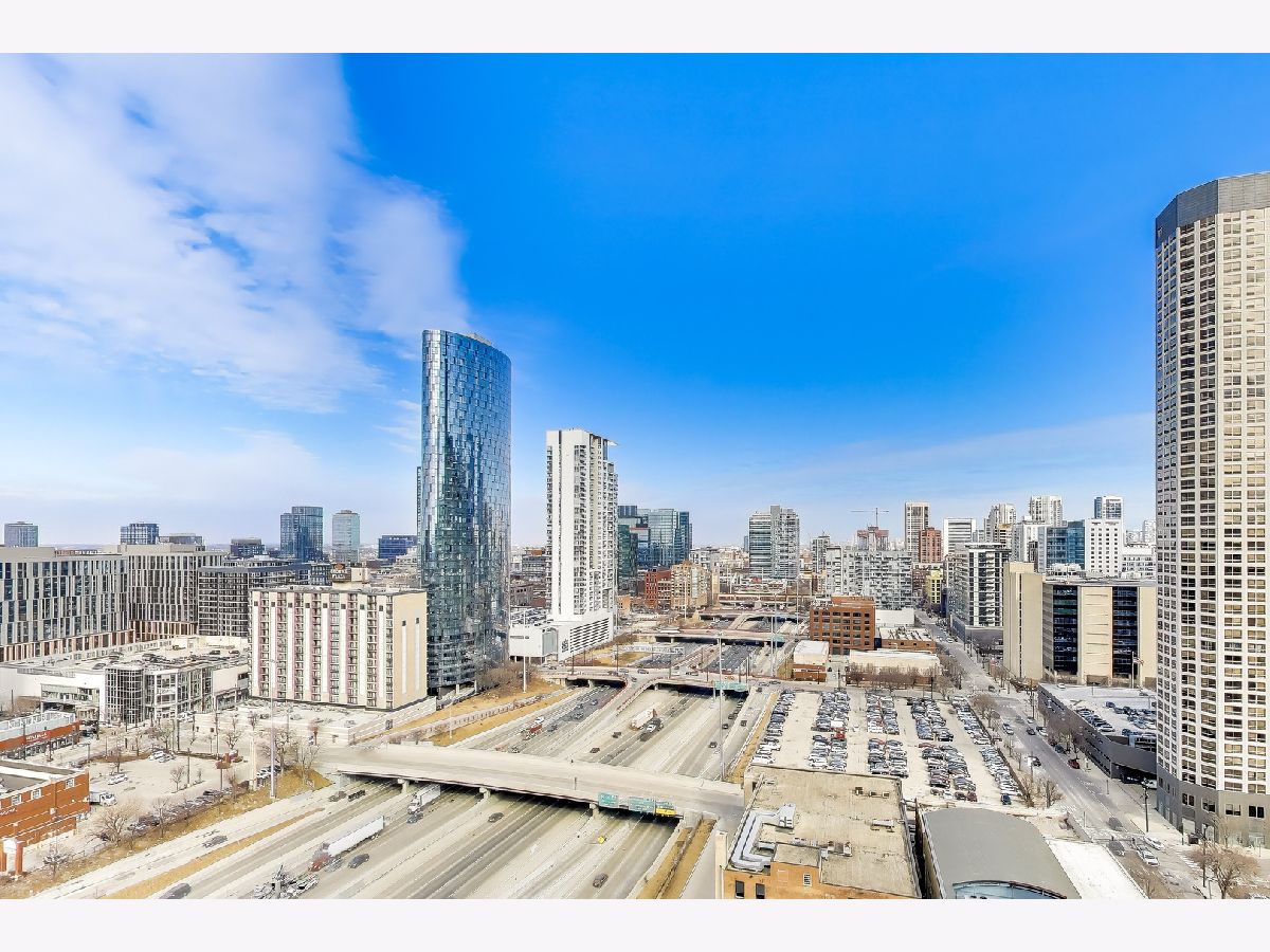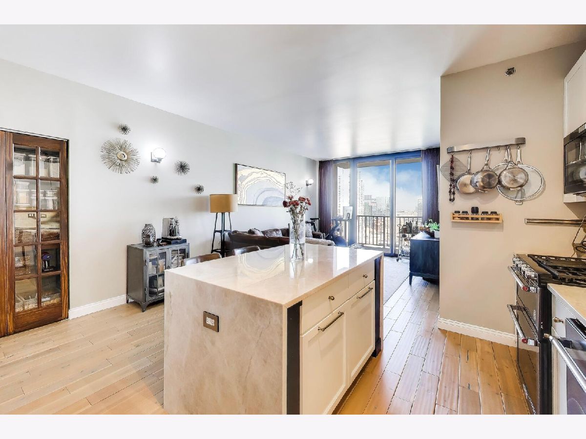 Welcome to this meticulously renovated 2 bed / 2 bath condo in Chicago's premier West Loop neighborhood, showcasing high-end, premium materials and elevated designer finishes far beyond the typical renovation, with sweeping city views and floor-to-ceiling windows. This upper-level residence features wide-plank premium white oak hardwood flooring throughout and a private balcony ideal for entertaining. The designer kitchen showcases a stainless steel appliance suite with double oven and gas range, Taj Mahal quartzite countertops, waterfall island, marble backsplash, pantry, and soft-close cabinetry. Both bathrooms have been elegantly updated. The primary bath offers travertine stone, heated bidet toilet, anti-fog mirror, and new vanity. The secondary bath features striking basalt tile and modern finishes. All with the added convenience of in-unit laundry. Deeded garage parking available for $25,000. Assessments include heat, A/C, and cable - everything except electricity. Full-service building with 24/7 door staff, fitness center, community room, storage, bike room, and dog run. Prime West Loop location near Union Station, Ogilvie, CTA Blue Line, Fulton Market, Restaurant Row, and Mary Bartelme Park.