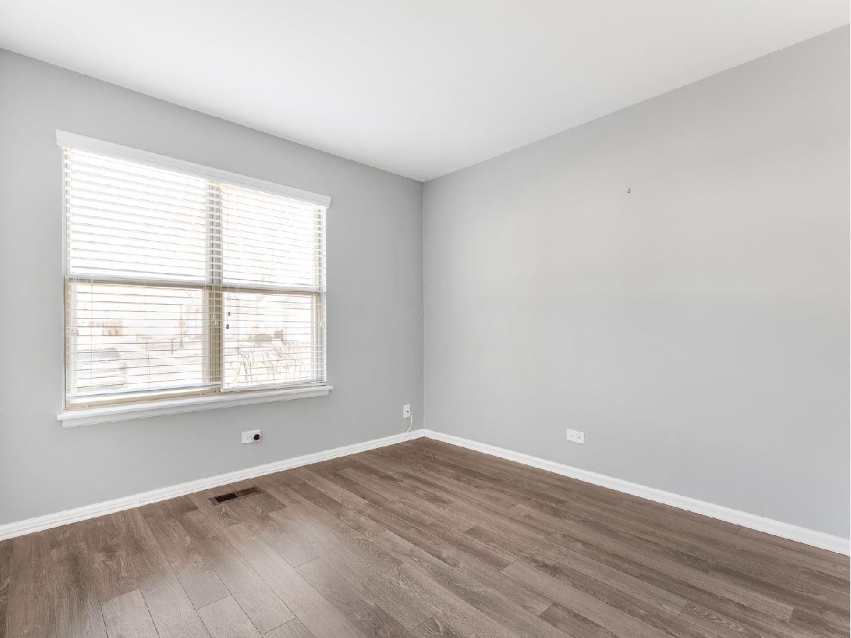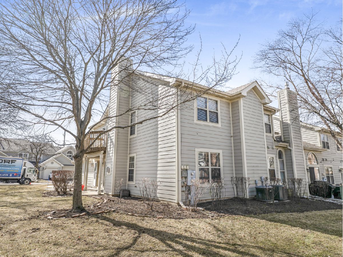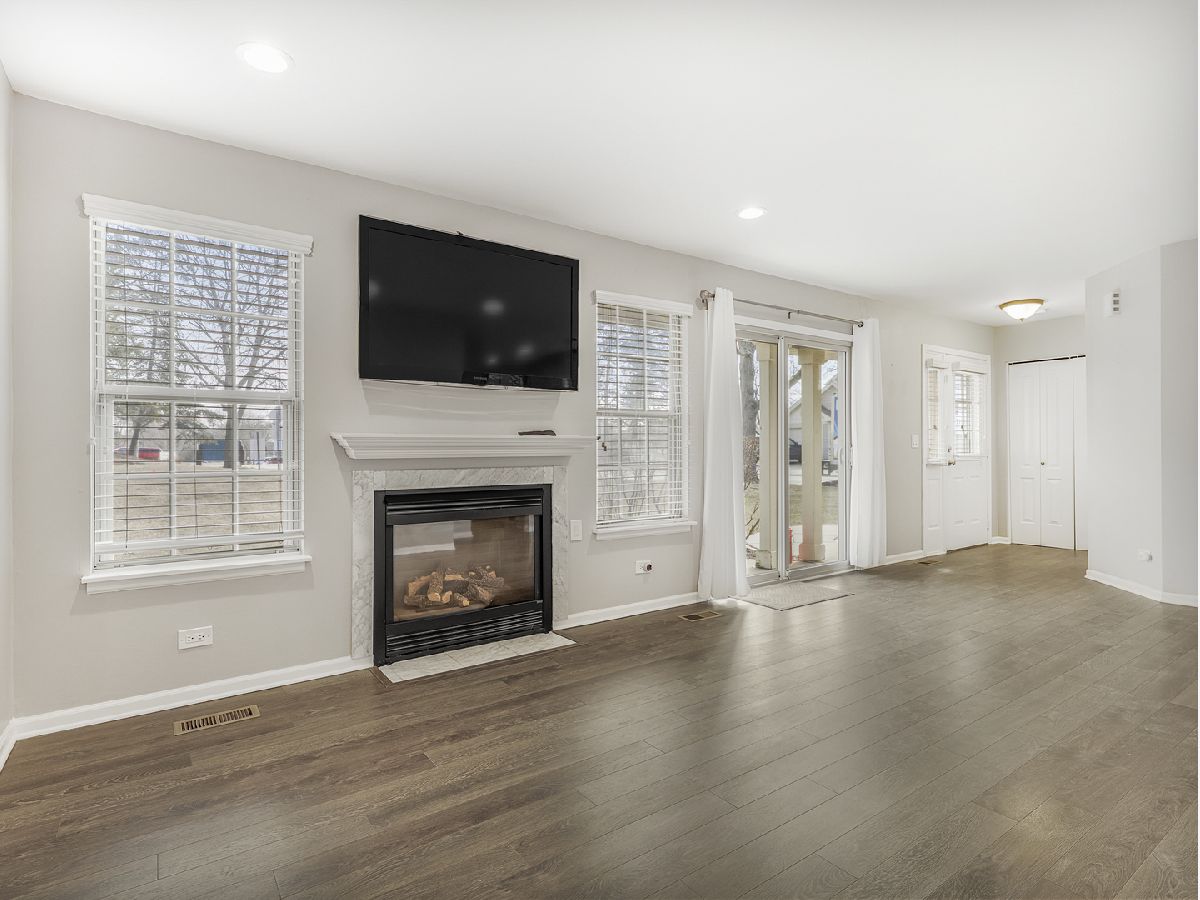 BEST AND HIGHEST MONDAY 3/2. Welcome to this beautiful 1st floor, move in ready, END UNIT. The open concept floor plan has a cozy fireplace in the living room and wood laminate flooring, that flows seamlessly throughout the entire unit. The combined living room/dining room has new track lighting in 2025. The U-shaped kitchen offers ample cabinetry, generous counter space and opens to the LR/DR, perfect for entertaining and everyday living. The luxurious bathroom features stunning ceramic tile floor as well as a spacious dual sink & vanity with a quartz countertop. Enjoy entertaining guests on the private patio which opens to a lovely open grassy area. The in-unit laundry/utility room has a full-sized washer & dryer and a new furnace in 2023. This home offers access to the Palatine Bike Trail.