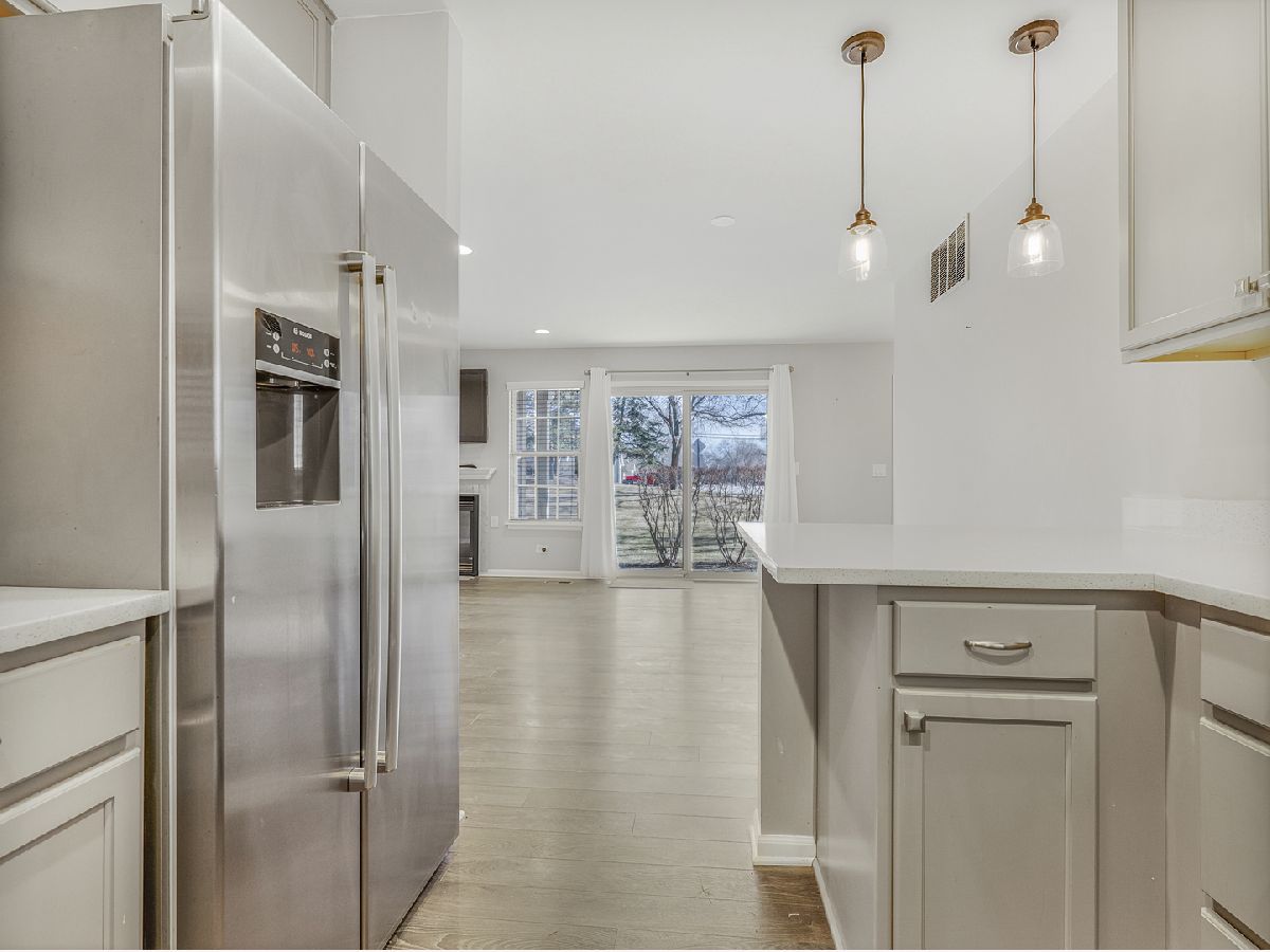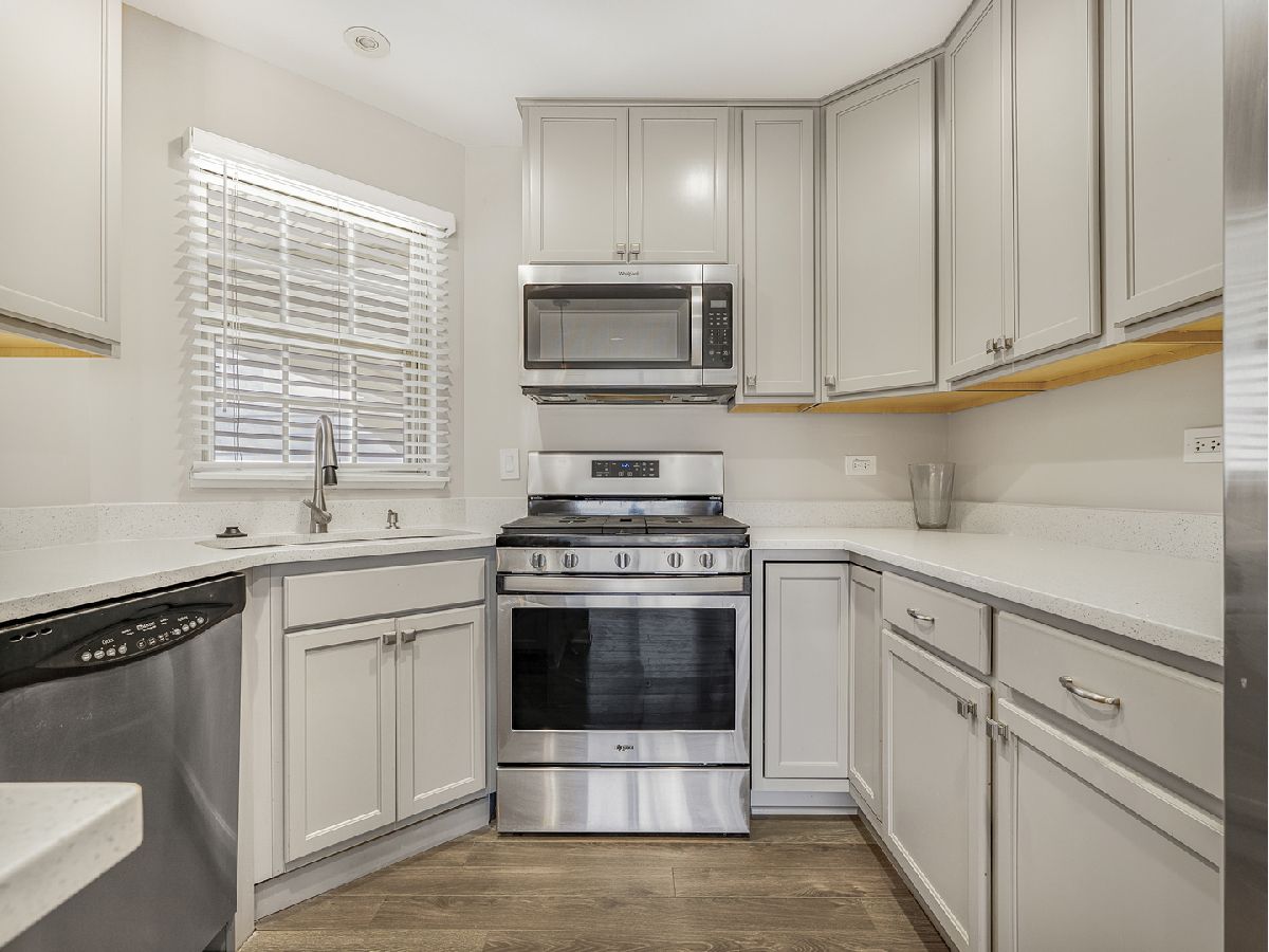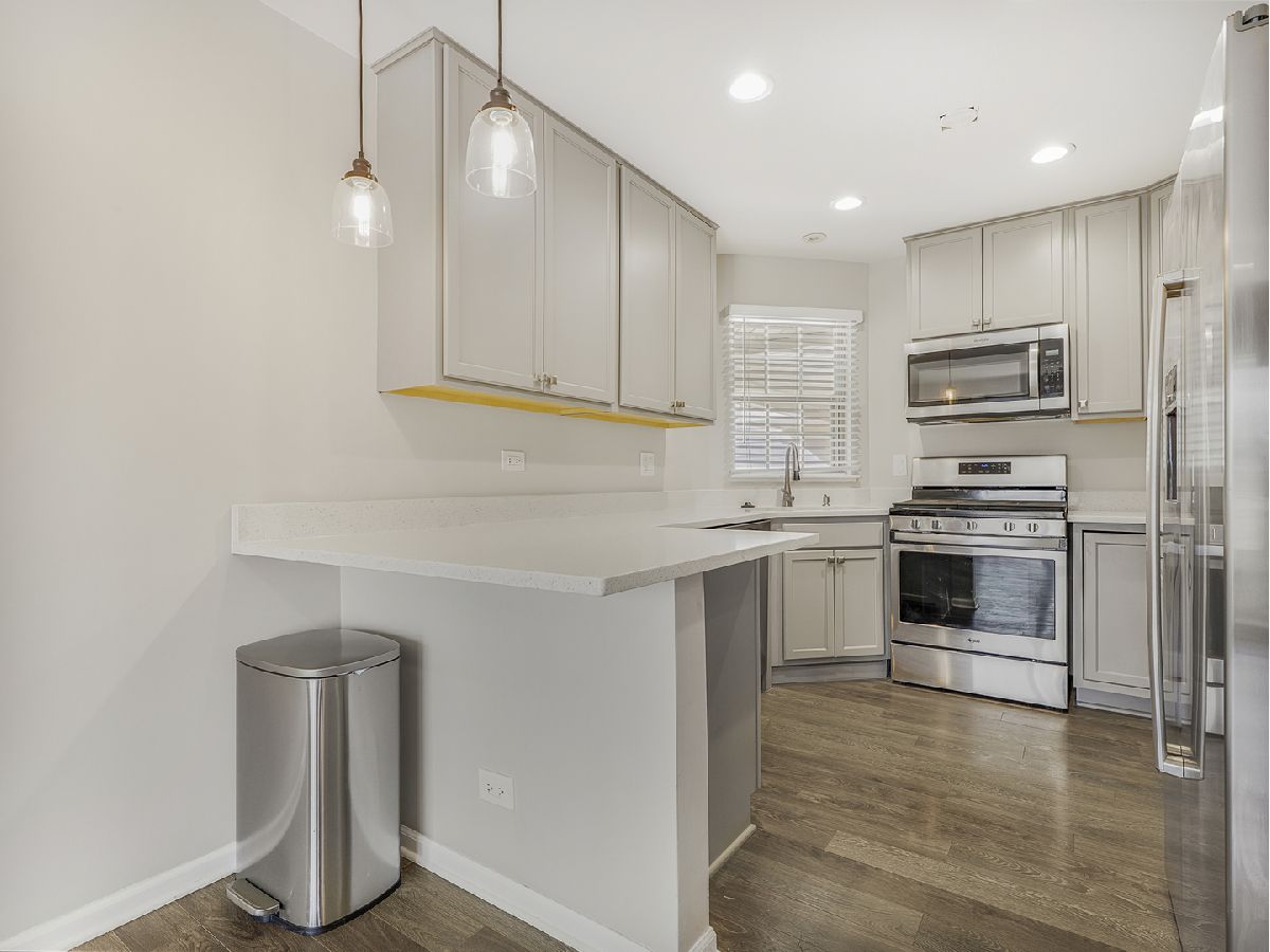 BEST AND HIGHEST MONDAY 3/2. Welcome to this beautiful 1st floor, move in ready, END UNIT. The open concept floor plan has a cozy fireplace in the living room and wood laminate flooring, that flows seamlessly throughout the entire unit. The combined living room/dining room has new track lighting in 2025. The U-shaped kitchen offers ample cabinetry, generous counter space and opens to the LR/DR, perfect for entertaining and everyday living. The luxurious bathroom features stunning ceramic tile floor as well as a spacious dual sink & vanity with a quartz countertop. Enjoy entertaining guests on the private patio which opens to a lovely open grassy area. The in-unit laundry/utility room has a full-sized washer & dryer and a new furnace in 2023. This home offers access to the Palatine Bike Trail.