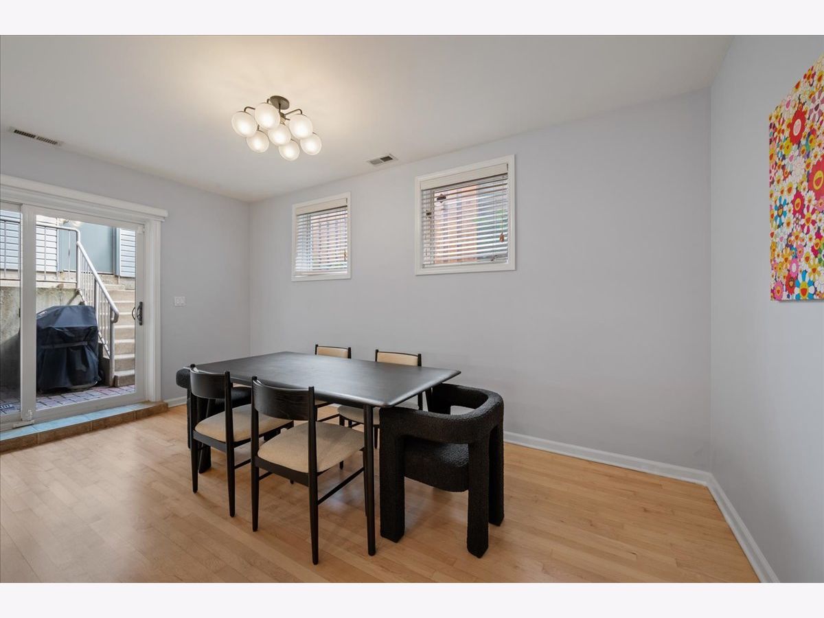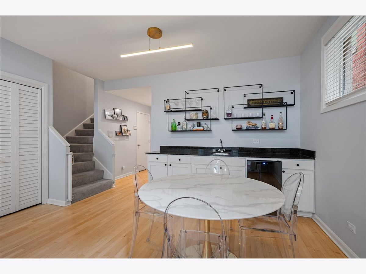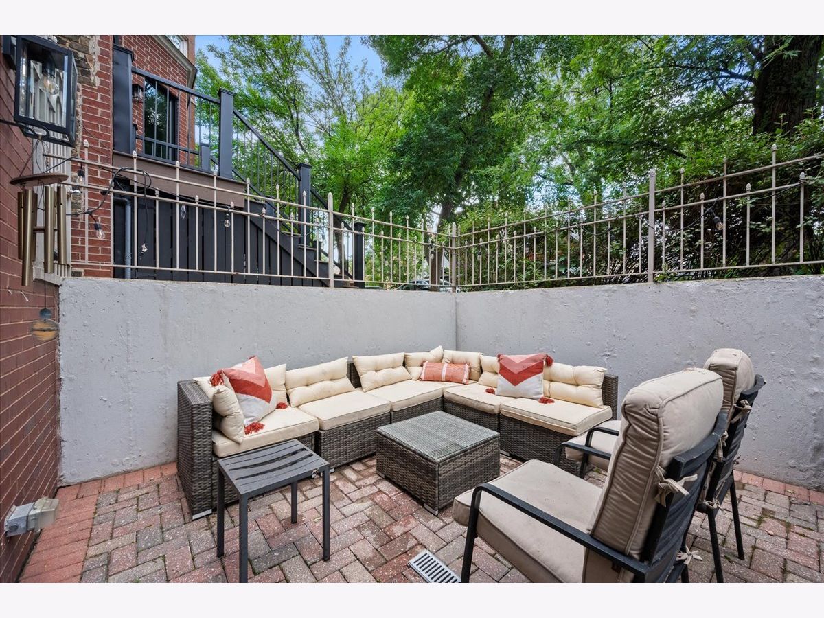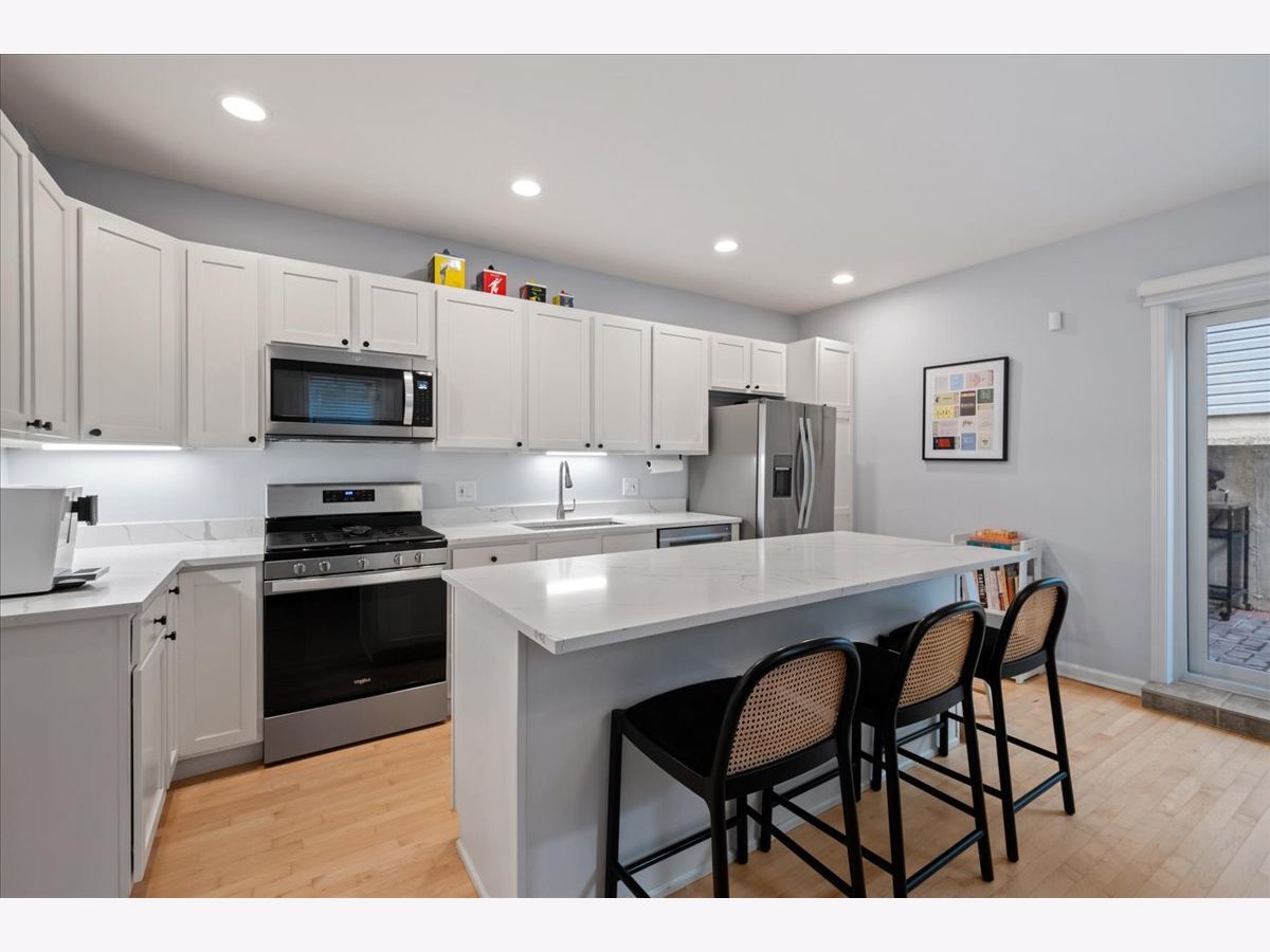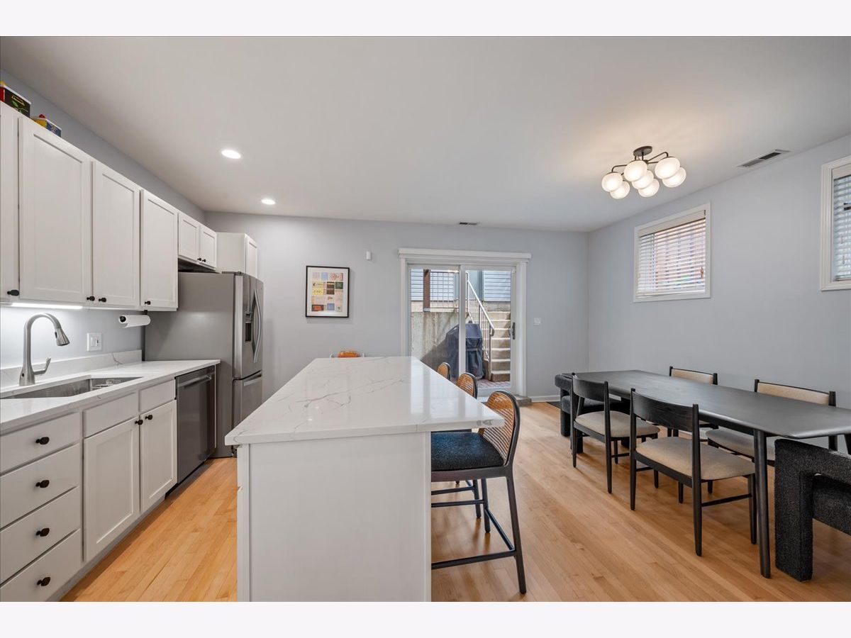 Bright and sunny south-facing 3 bed, 3 bath duplex down on a tree-lined street in the heart of Wicker Park! With soaring 20'+ ceilings and freshly refinished floors throughout (2026 - dark wood stain not shown in photos), this home welcomes you in immediately with an impressive living area. New LED recessed lighting, custom window treatments, built-in wet bar, gas fireplace, and dramatic windows flood the space with natural light. There's room for both a dining table and a work-from-home nook, plus access to a private terrace. The updated kitchen and large eat-in dining area open to a patio perfect for grilling, showcasing new quartz countertops, crisp white cabinetry, newer stainless steel appliances, and a spacious island with barstool seating. The primary suite offers a serene retreat with a recently renovated en-suite bath featuring quartz counters, modern gray cabinetry, new tile, mirrors, vanity, toilet, and both a soaking tub and walk-in shower with honeycomb tile. The first-floor bathroom has also been fully updated, and the second upstairs bath features a newer toilet (2024). Additional highlights include new carpet (2022), freshly painted walls and baseboards, updated light fixtures throughout, new patio door and screen door, reconfigured modern banister, and newer furnace and water heater (2023). In-unit washer/dryer (2019). Garage parking included, plus massive common attic storage over the garage. All within steps of Division Street's restaurants, bars, shops, parks, the 606 Trail, and Blue Line stops. Turnkey home in a prime Wicker Park location!