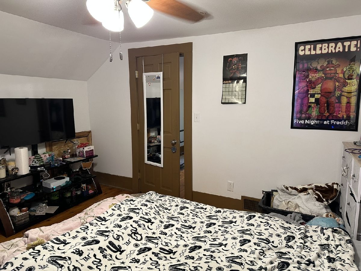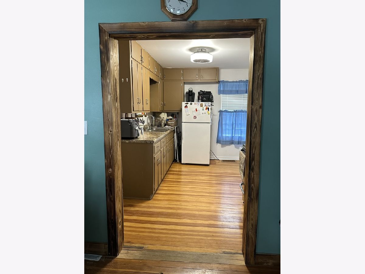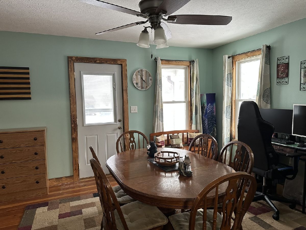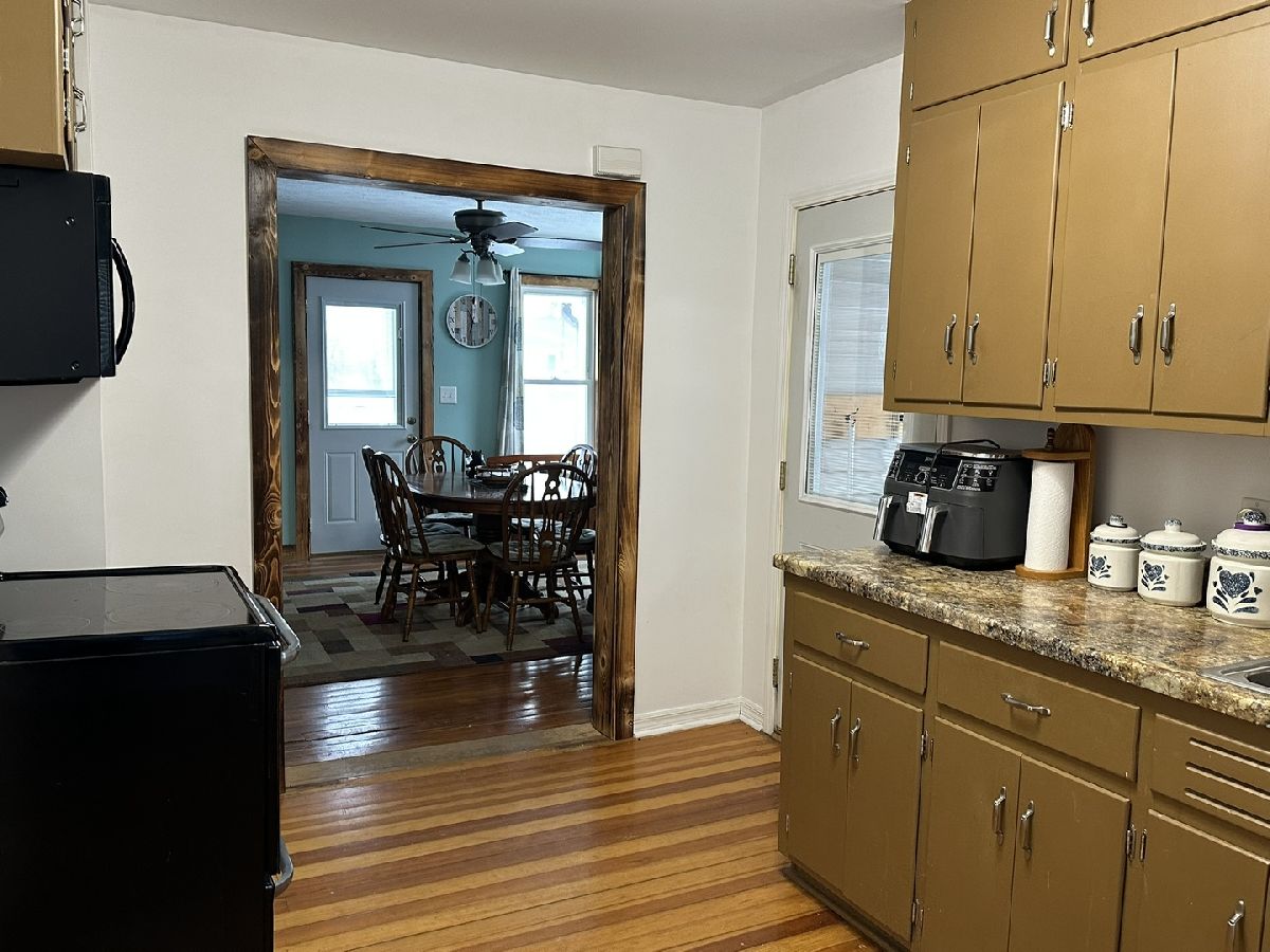 Covered front porch welcomes you into the large dining room, off of there is the living room and room used as primary bedroom. Dining room is open to the kitchen also. The kitchen has access to the enclosed side porch, bathroom, basement. Upstairs are the two other bedrooms, one currently being used as an office. Garage off of the alley, plenty of room in the back yard for playing or garden. Garage door opener new in 2025, stairway reconfigured and some new trim 2022.
