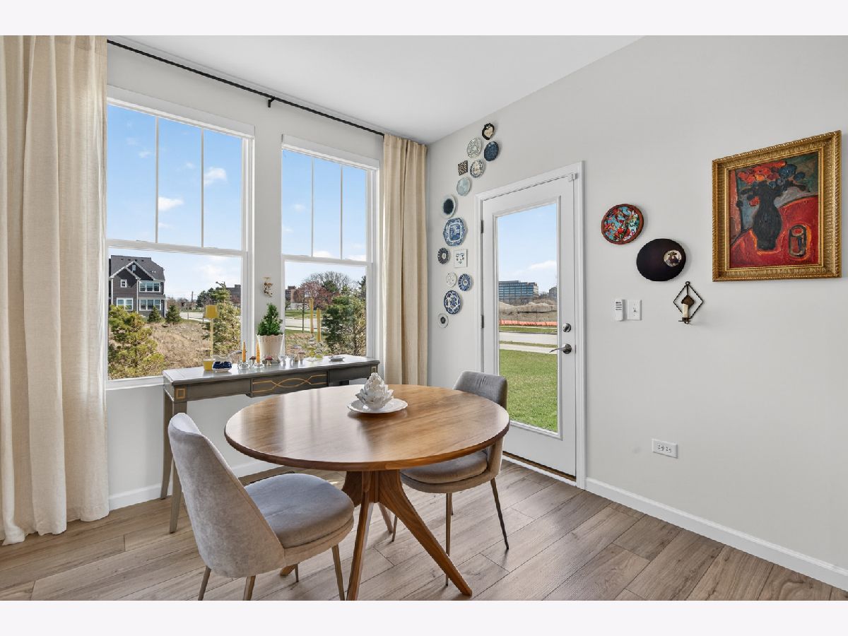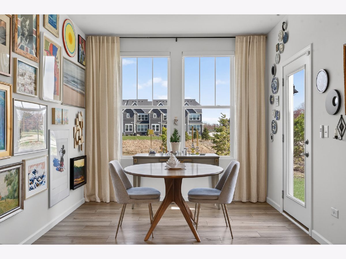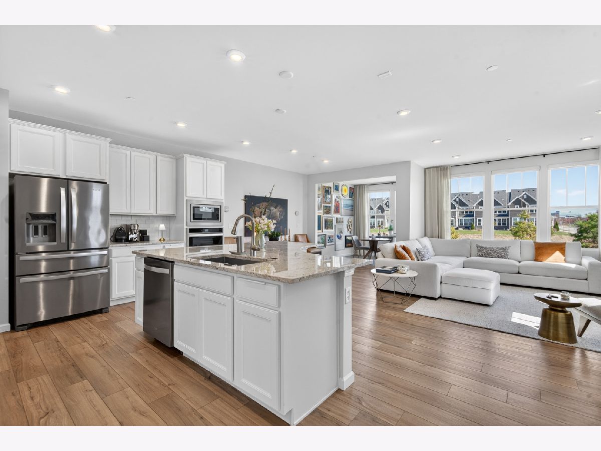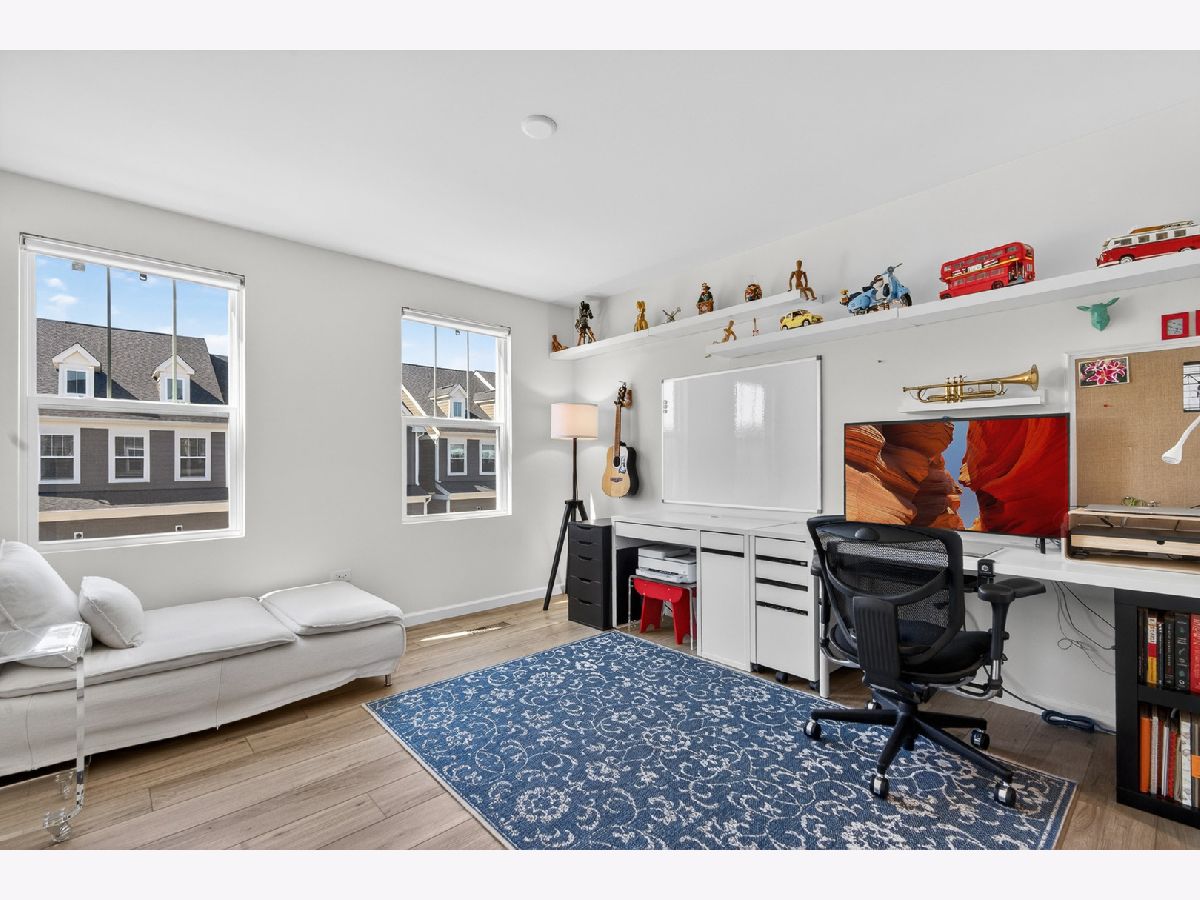 Welcome to Naper Commons, an exceptional community by Pulte Homes, ideally located within the highly acclaimed Naperville Community Unit School District 203. This stunning end-unit home makes a memorable first impression with its charming wraparound front porch and desirable east-west exposure, filling the space with abundant natural light throughout the day. Boasting 2,566 square feet across three thoughtfully designed levels, plus a full basement, this residence offers both space and versatility. With three generously sized bedrooms and 2.5 baths, it is perfectly suited for comfortable living and effortless entertaining. The main level showcases a beautifully appointed gourmet kitchen featuring granite countertops, 9-foot ceilings, recessed lighting, 42-inch cabinetry, a five-burner cooktop with a professional hood, stainless steel appliances, and a bright sunroom. Wood laminate flooring flows seamlessly throughout the home, including the second floor. Upstairs, the spacious primary suite offers a private retreat with a luxurious bath, complete with a soaking tub and a large walk-in closet with custom organizers. All bedrooms include walk-in closets, and the convenience of second-floor laundry enhances everyday living. The third level presents a versatile and expansive loft or game room, complemented by a private rooftop terrace-ideal for relaxation or entertaining. A full basement provides ample storage or the perfect opportunity for a home gym. Additional features include custom electric blinds and blackout shades in select rooms. Built in 2023, the home also includes a transferable builder warranty for added peace of mind. Perfectly positioned just minutes from Downtown Naperville, with easy access to I-88, Arrowhead Golf Club, and the scenic Danada Forest Preserve, this home offers the ideal blend of convenience and tranquility.