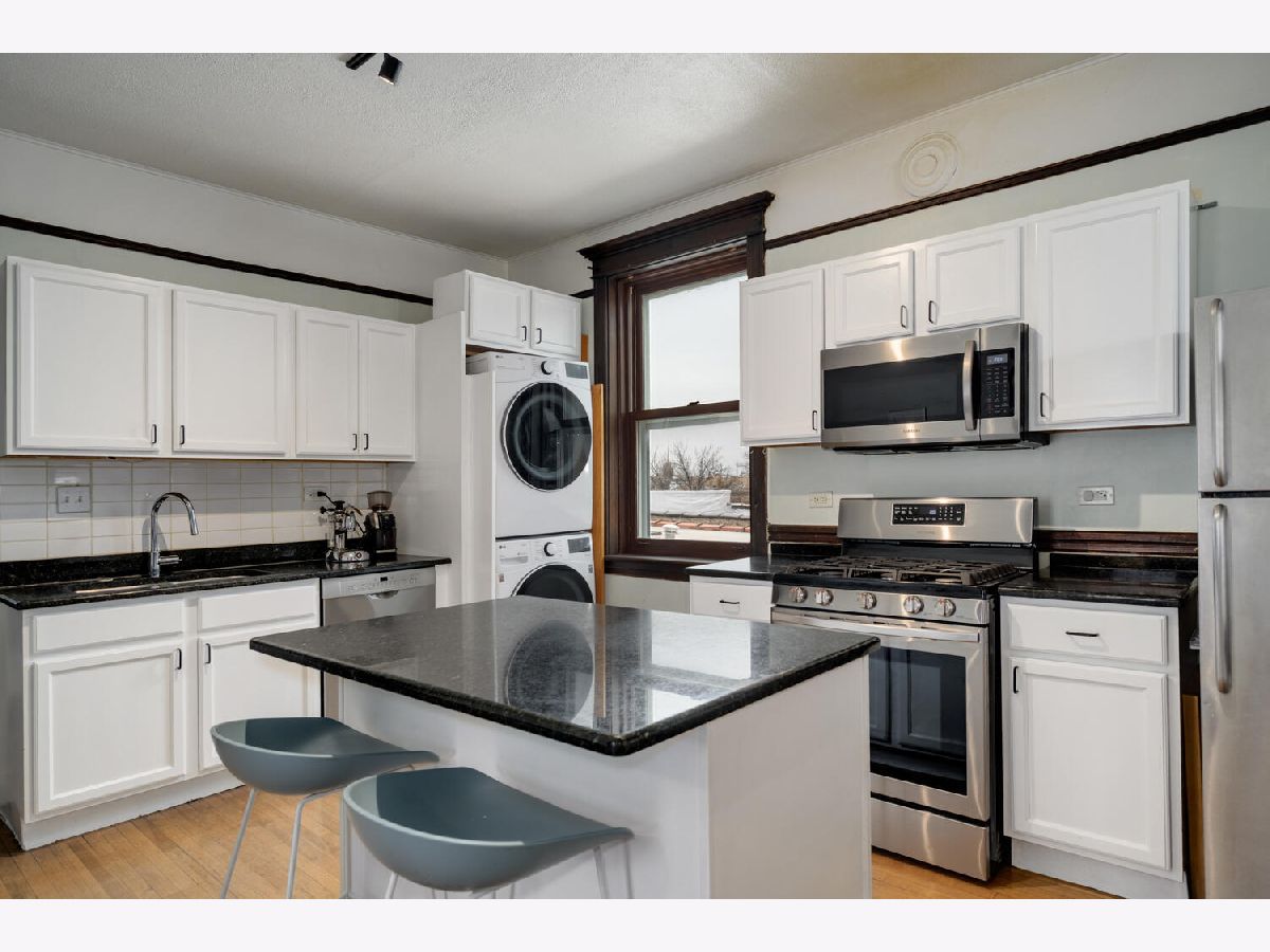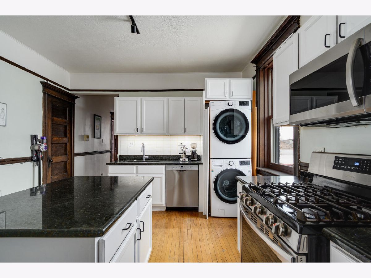 Wonderful sunny, extra-wide, top floor, 3 bedroom/2 bath condo in Ukrainian Village with the original vintage details intact including a beautiful built-in hutch in the formal dining room, a stunning pier glass mirror in the living room, ornate carved columns separating the living and dining rooms, high ceilings, original wood floors, hardware, doors and door/window trim throughout. Building was completely rehabbed in 2001 and combines modern amenities with vintage charm including central heat and AC and in-unit laundry. The spacious eat-in kitchen has a large island, granite counters, stainless appliances and washer/dryer. Thanks to the wide lot, the three spacious bedrooms all fit a king or queen bed. Two full bathrooms include a walk-in shower and a soaking tub. A large, enclosed porch off the kitchen provides additional living or storage space. Ideal Ukrainian Village location on beautiful, tree-line Cortez. Easy walk to Division St. and Chicago Ave, public transport, dining/night life and shopping and near both I90/94 and I290. Garage parking space included.