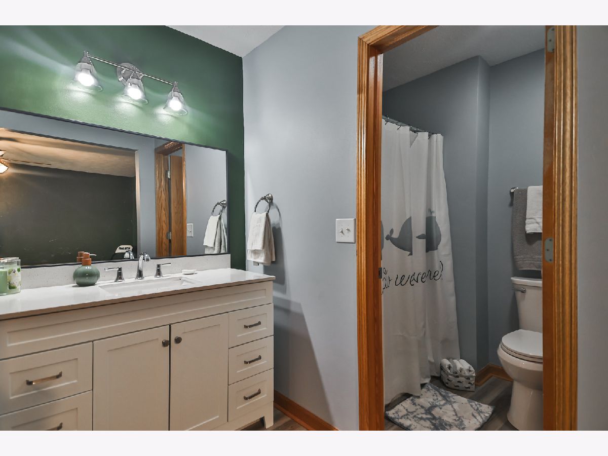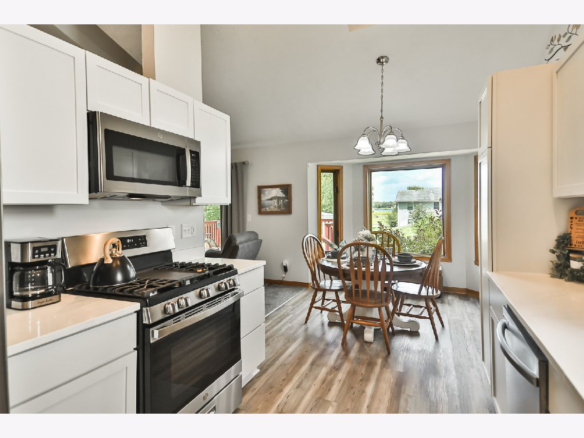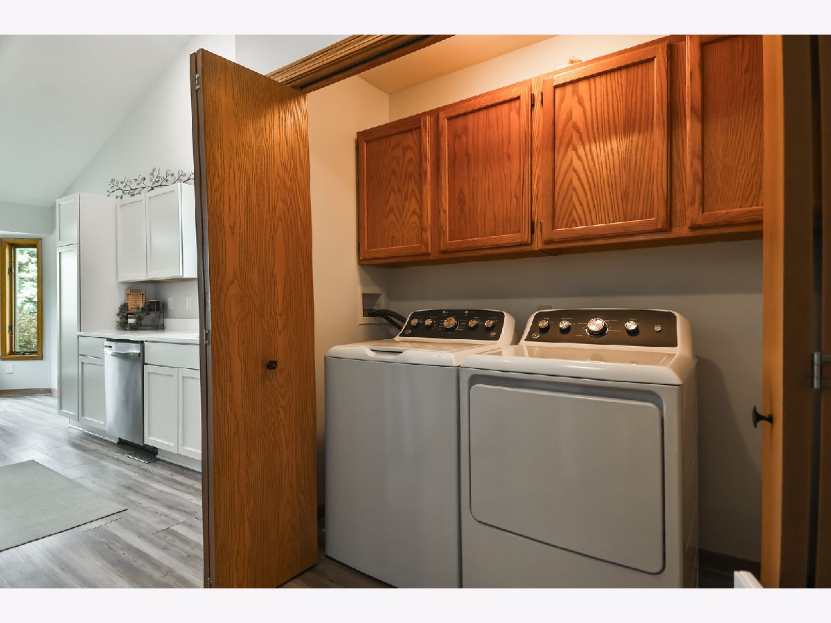 Bright and open ranch home offers new flooring throughout, beautifully updated kitchen with white cabinets and quartz counters. New appliances including brand new washer and dryer located on the main floor. Vaulted great room with fireplace. Ample sized bedrooms including the large primary with walk in closet, hotel style bathroom. Partially finished lower level with office with closet and plenty of room for more. Enjoy lake views from your deck. Shed for additional storage.