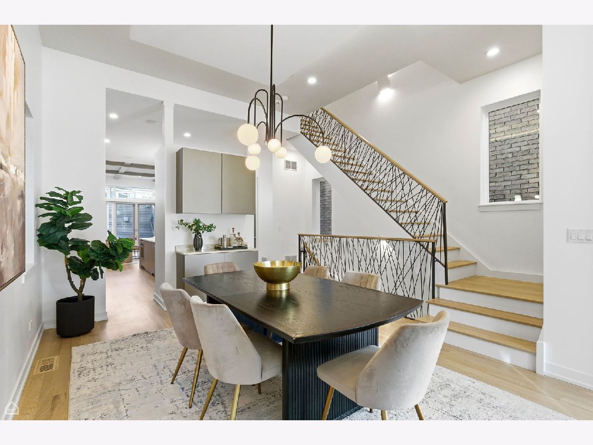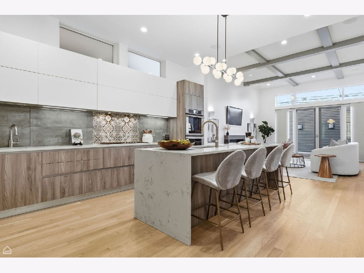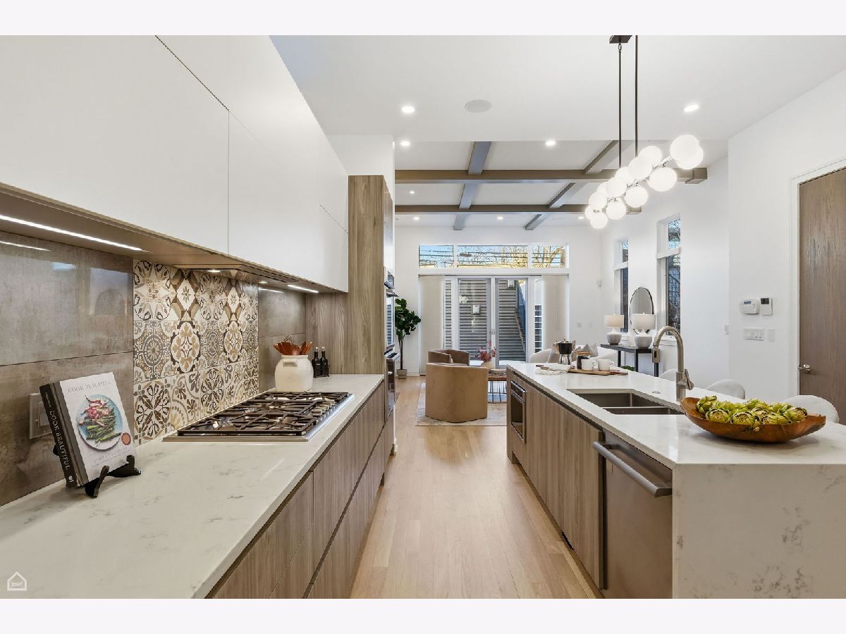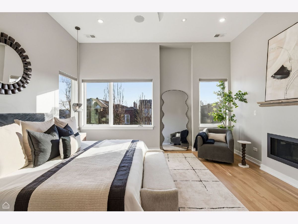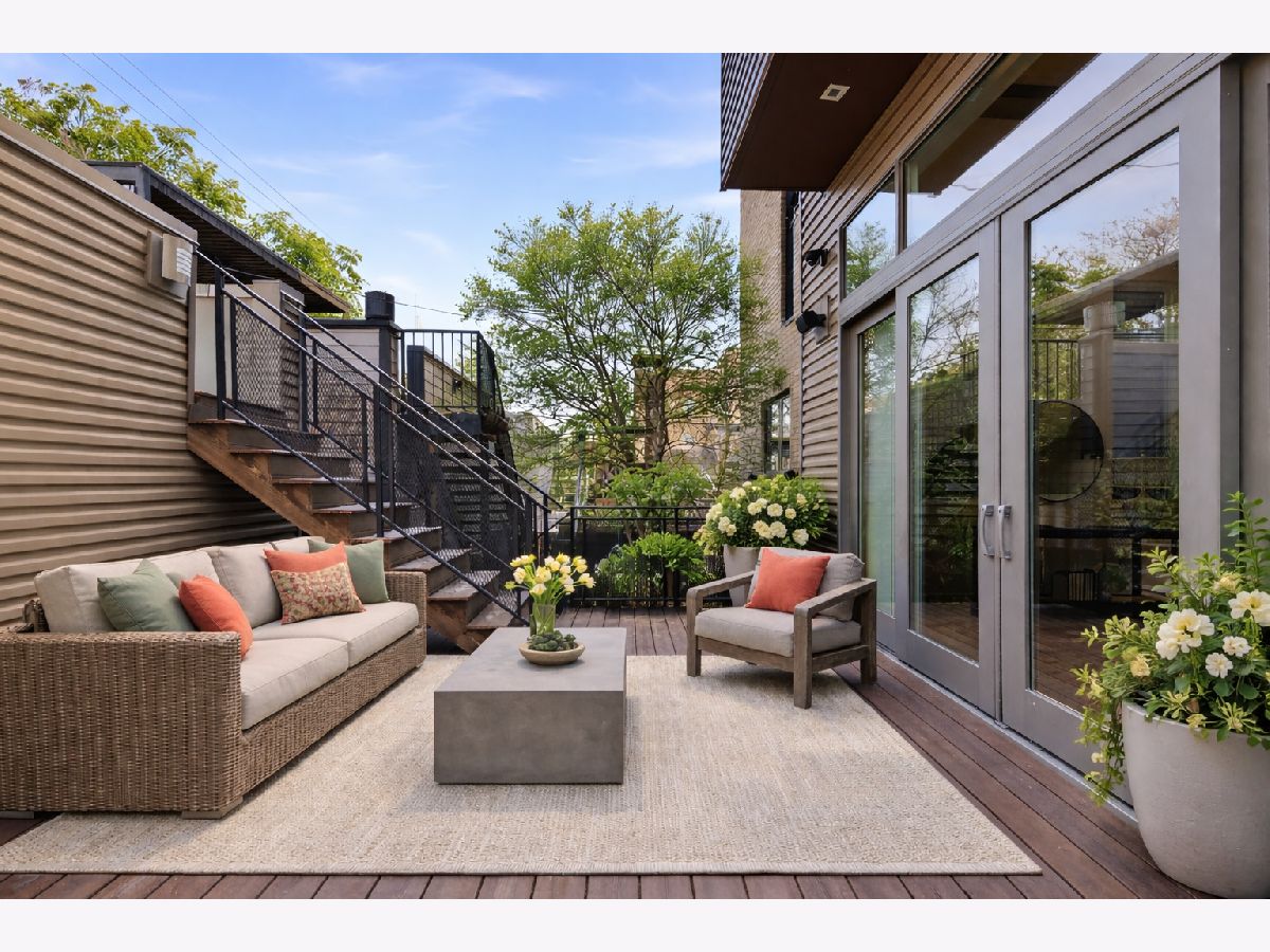 Mitchell School District! Better than new construction, this modern single-family residence offers approximately 4,100 square feet of well-executed living space with 5 bedrooms and 3.1 baths. Thoughtfully designed on 3 levels, the home delivers exceptional indoor-outdoor living, including multiple private outdoor spaces. The interior features an open layout with hardwood floors, oversized windows, dramatic ceiling heights, and custom beamed ceilings. A striking staircase with metal detailing anchors the home and connects each level. The kitchen features quartz countertops, Italian Copatlife cabinets, integrated Thermador appliances, a large island, and a butler's pantry. Open living and dining areas are ideal for everyday living or entertaining. The primary suite offers a true retreat with a spa-inspired bath, including dual vanities with a makeup station, a soaking tub, anoversized steam shower with body sprays, and two custom walk-in closets. The fully finished lower level provides a flexible entertainment space with a wet bar, ice maker, and beverage refrigerator. A top-floor bonus room with an additional wet bar opens directly onto an expansive roof deck with stunning city views. Additional highlights include three fireplaces, two laundry areas (only one has a washer and dryer installed), 400-amp electrical service, central vacuum system, Pella windows, security cameras, on-demand hot water heaters, EV-ready 220-volt wiring, and flush-mounted speakers throughout. This is one of the best blocks in West Town - walk to school, dining, shopping, and transit.