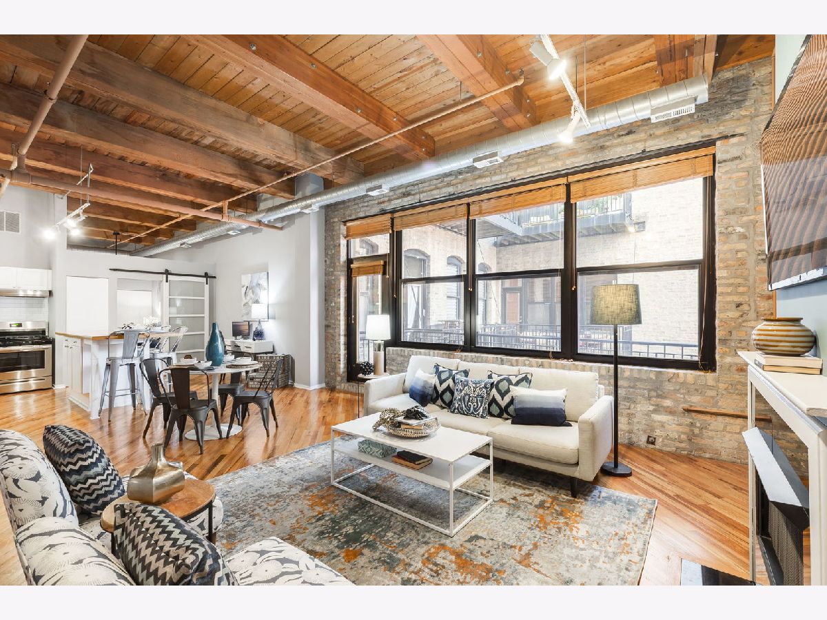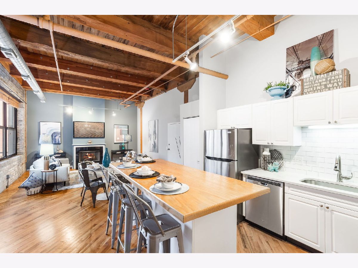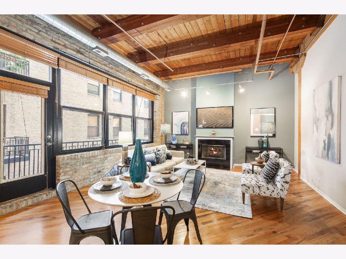 Spacious loft home in the sought after Fulton River District/West Loop neighborhood! This one bedroom/one bath unit has amazing character with exposed brick and timber beams throughout. The open floorplan is perfect for entertaining and huge windows allow for an abundance of natural light. Updated kitchen with white cabinets, quartz countertops, large butcher block island, custom backsplash and stainless steel appliances. Other unit features include hardwood floors throughout, balcony, gas fireplace, in-unit washer/dryer and central heat/air. Primary bedroom has Elfa organized closets along with an en-suite bathroom. Building amenities include exercise room, storage, on-site manager & maintenance. This location is unbeatable, situated in the heart of the Fulton Market, steps from the West Loop and River North. It's conveniently close to the Loop, public transportation options, Metra stations, expressways, expanded Chicago Riverwalk leading east to Lake Michigan, various grocery stores, retail shopping, green parks and the vibrant dining scene along Randolph Street and Fulton Street. One garage space available for additional purchase at 20K, but does not need to be sold with the unit.