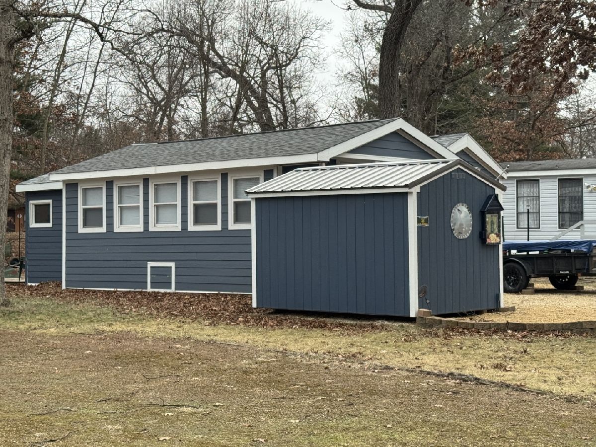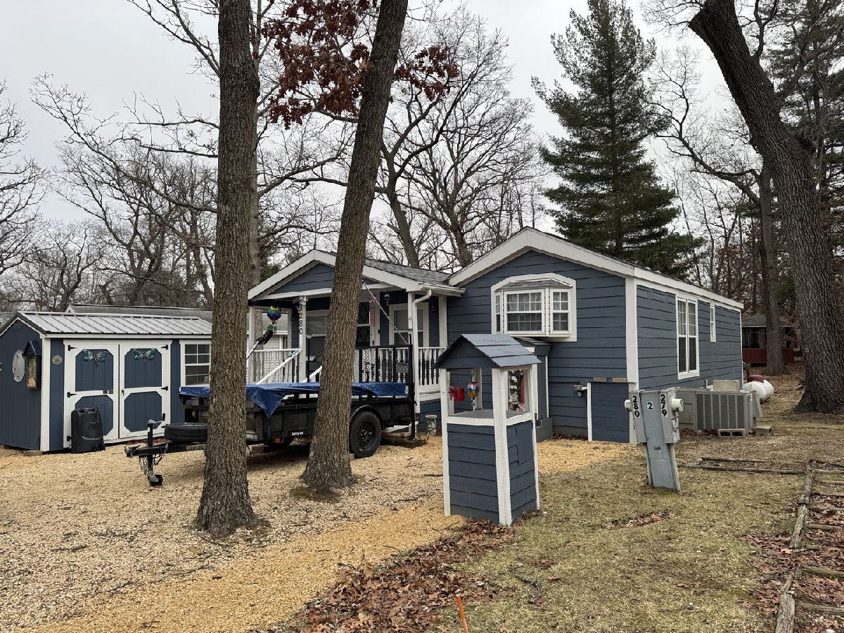 1997 Skylark Park Model featuring two bedrooms-one in the main unit and one in the room addition. The addition also includes a living room, providing extra living space. The unit is equipped with central A/C, electric baseboard heat with LP gas backup, and three thermostats throughout. The sewered, level lot offers a front porch, a flat rear deck with fire pit, and a gravel driveway with parking for up to three vehicles. A shingled roof installed approximately three years ago, skirting, and an 8x12 storage shed with electric add to the value. All appliances stay, including a stove, two microwaves, and refrigerator. Four TVs are included. All furniture remains with the unit; the couch is negotiable. Additional features include an LP tank and a water heater located in the trailer. Call today for a showing! Please note that Woodhaven Lakes is a gated recreational community and cannot be used as a primary residence or homestead. You must be accompanied by a broker to view any properties, YOU CANNOT ACCESS THE CAMPGROUND WITHOUT A PASS. The property owner pays the association fees.
