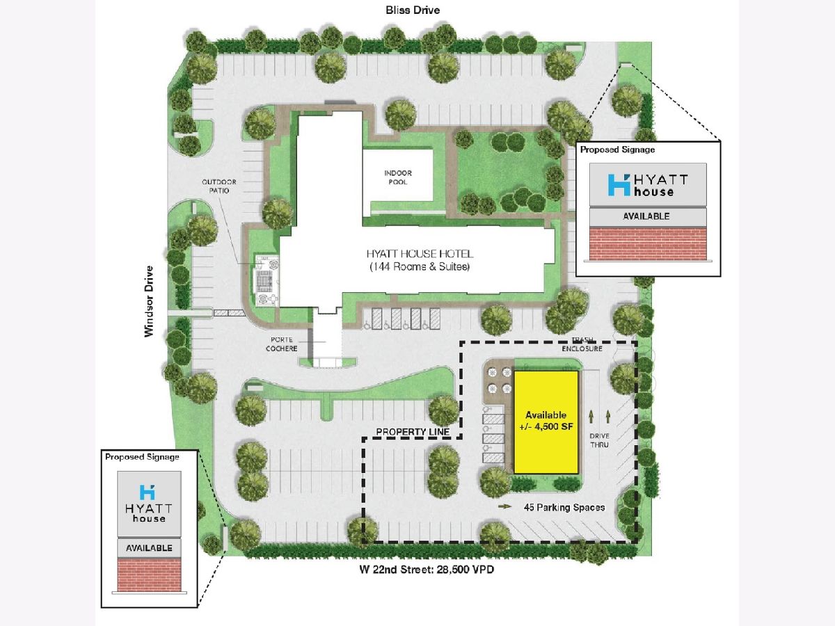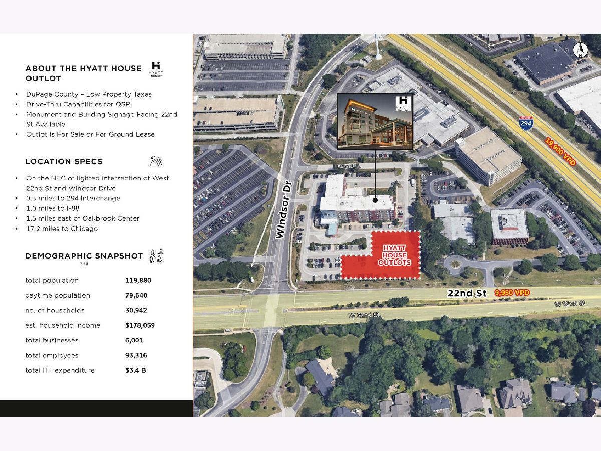 The subject property is an out parcel available for sale or lease on the newly built Hyatt House Hotel in Oakbrook, IL, in the County of DuPage. The property features 45 parking spaces and available monument and building signage facing 22nd Street. The parcel is located 1.5 miles east of Oakbrook Center and is at the entrance to the Windsor Business Park, a 3.7M square foot commercial development. The entrance to the park opens at the subject site. Historically low DuPage County property taxes offer a huge advantage compared to neighboring counties like Cook. Coupled with this high visibility and highly trafficked location, this is an ideal spot for a restaurant, coffee/deli, or retail services.