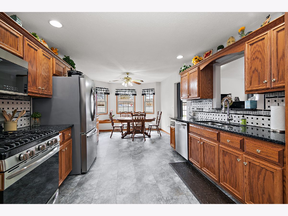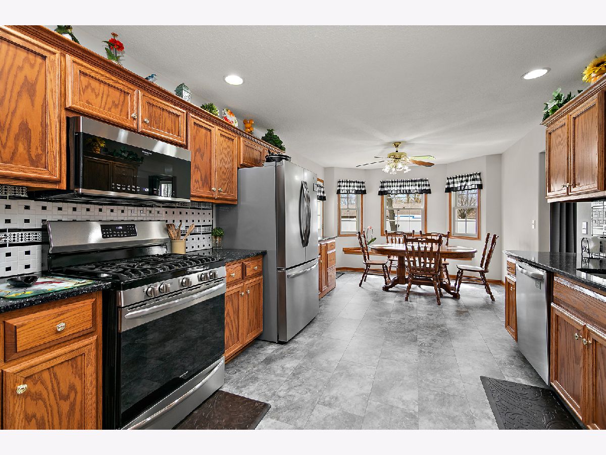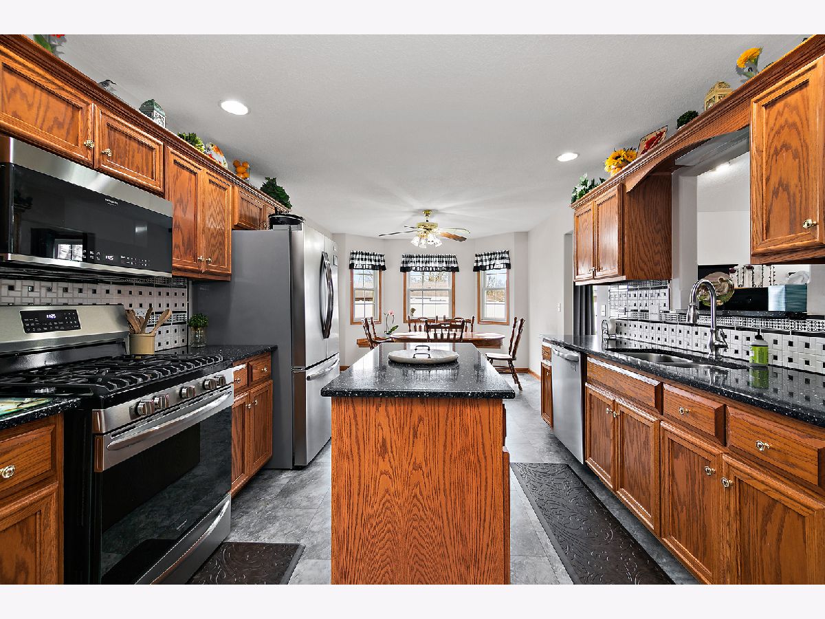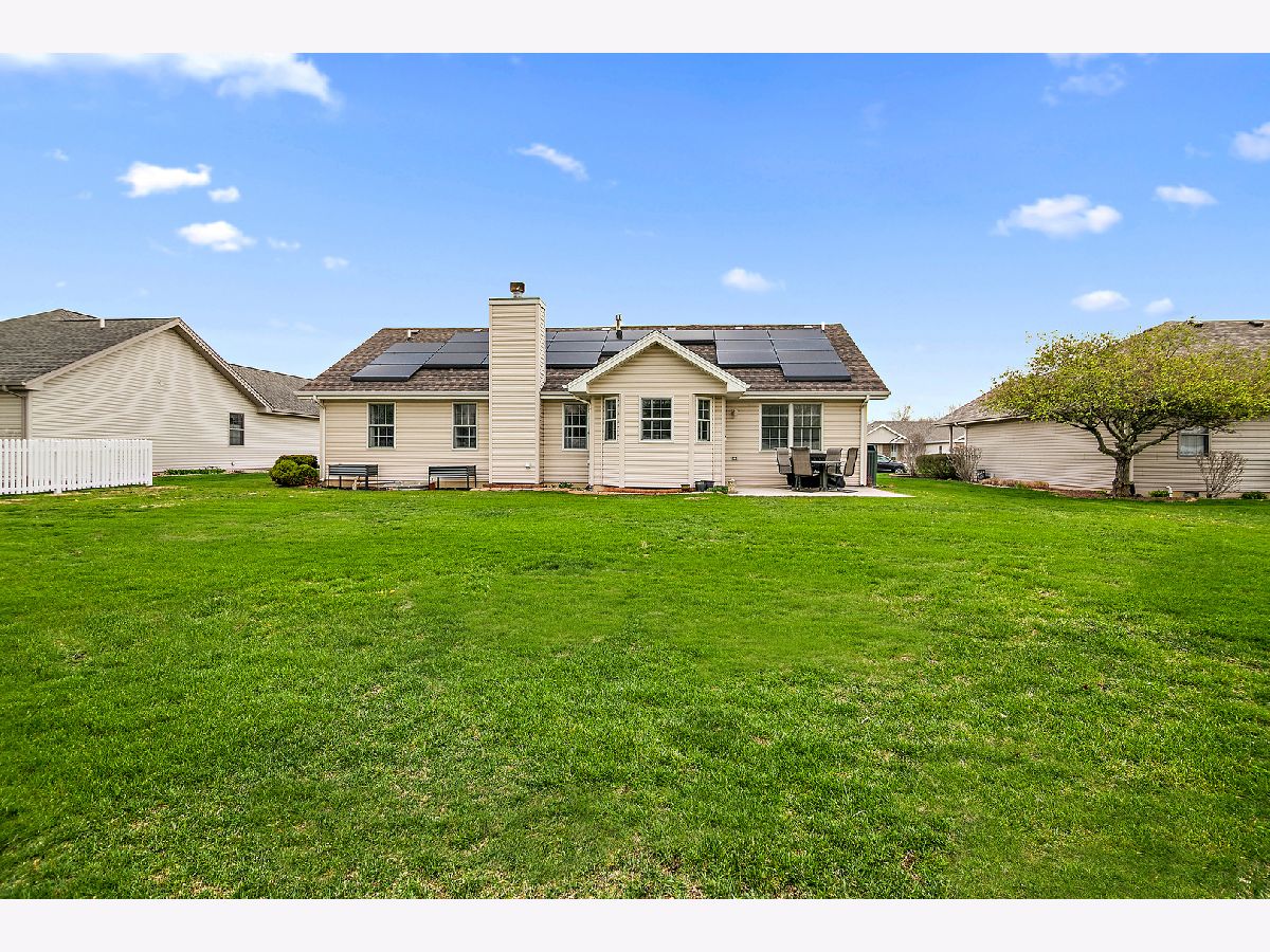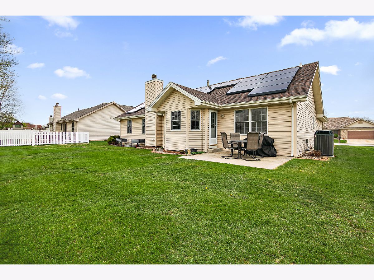 Beautiful ranch home with a desirable split floor plan and thoughtful updates throughout. A vaulted foyer welcomes you into the spacious living room featuring hardwood floors and a cozy gas fireplace. The formal dining room sits at the front of the home and continues the hardwood flooring, offering great natural light and space for entertaining. The eat-in kitchen is both functional and inviting with granite countertops, tile backsplash, stainless steel appliances (2023), a window seat, movable island, and direct access to the patio and backyard. Cabinetry is enhanced with convenient pull-out shelving for added storage and ease. The private primary suite is tucked away on one side of the home and features a tray ceiling, walk-in closet, and an updated en-suite bath with double sinks and a brand new Kohler custom walk-in shower with built-in seat. Two additional bedrooms are located on the opposite side of the home and share a full bath. Additional features include a main-level utility room with front-load washer and dryer, full unfinished basement with bath rough-in offering excellent potential for additional living space, and a sprinkler system for easy lawn maintenance. The garage includes pull-down attic access for extra storage. Major updates provide peace of mind, including roof and front door (2025), HVAC system, whole house humidifier, and tankless water heater (2020), sump pump (2023), and new flooring throughout most of the home (2023). Solar panels add energy efficiency and long-term savings. Meticulously maintained and truly move-in ready-this one checks all the boxes.