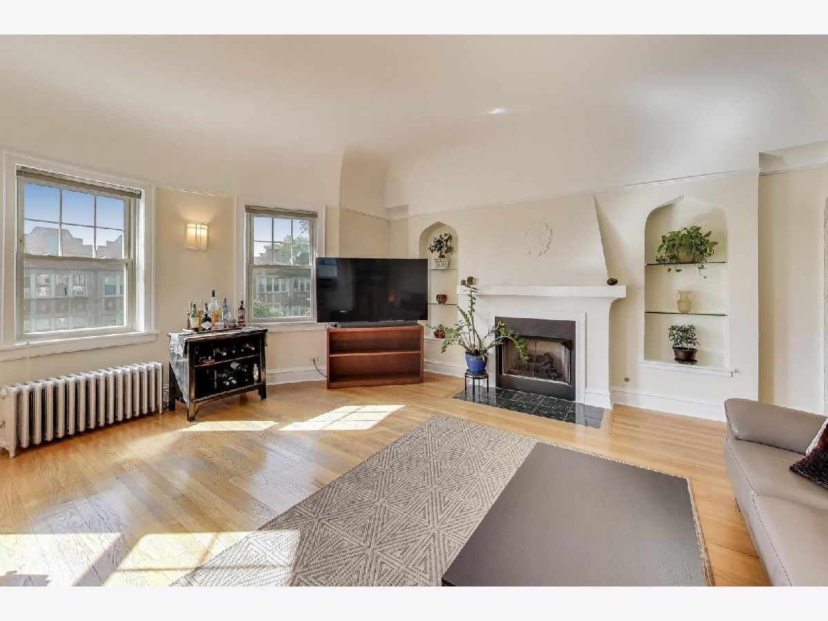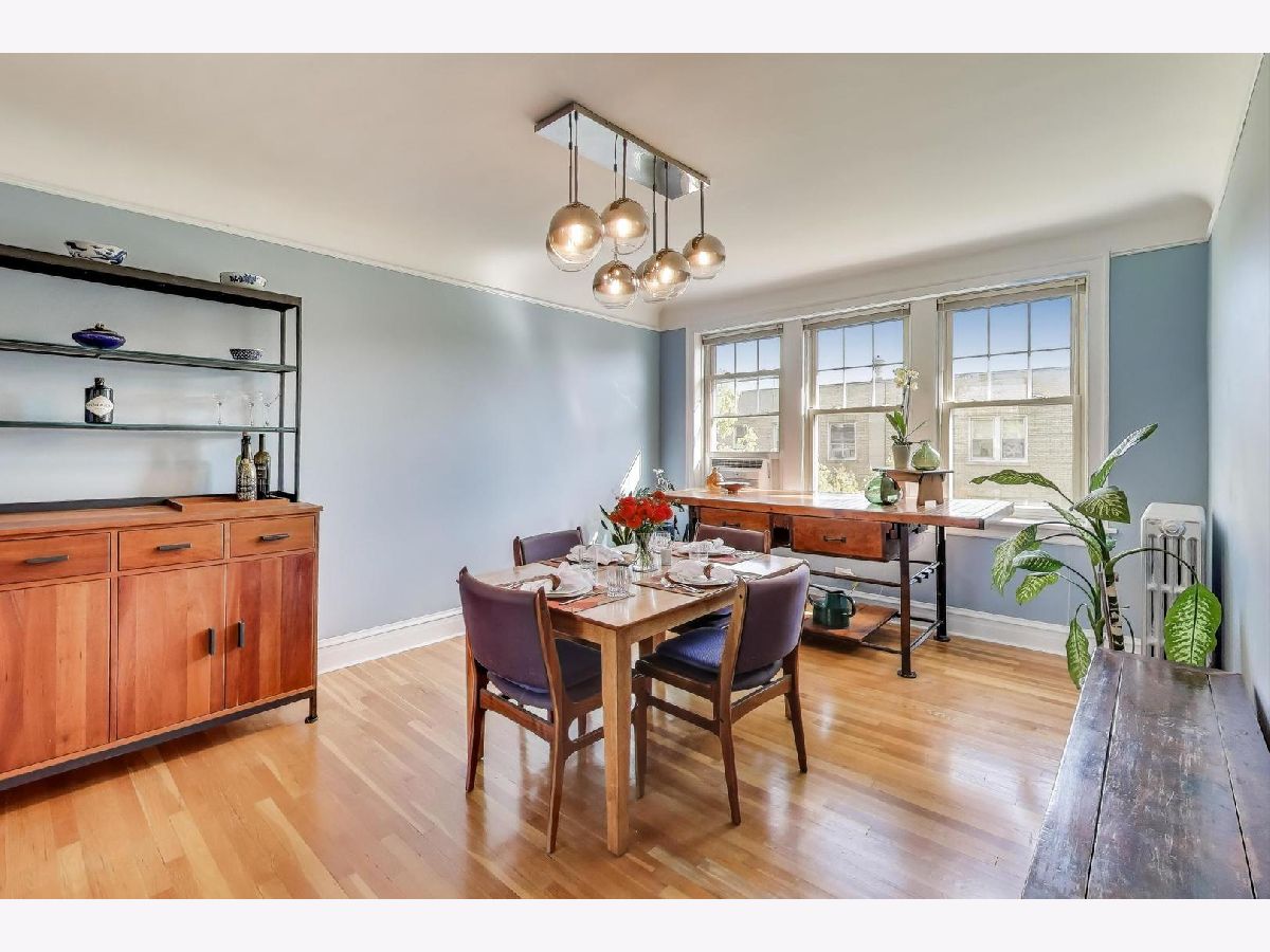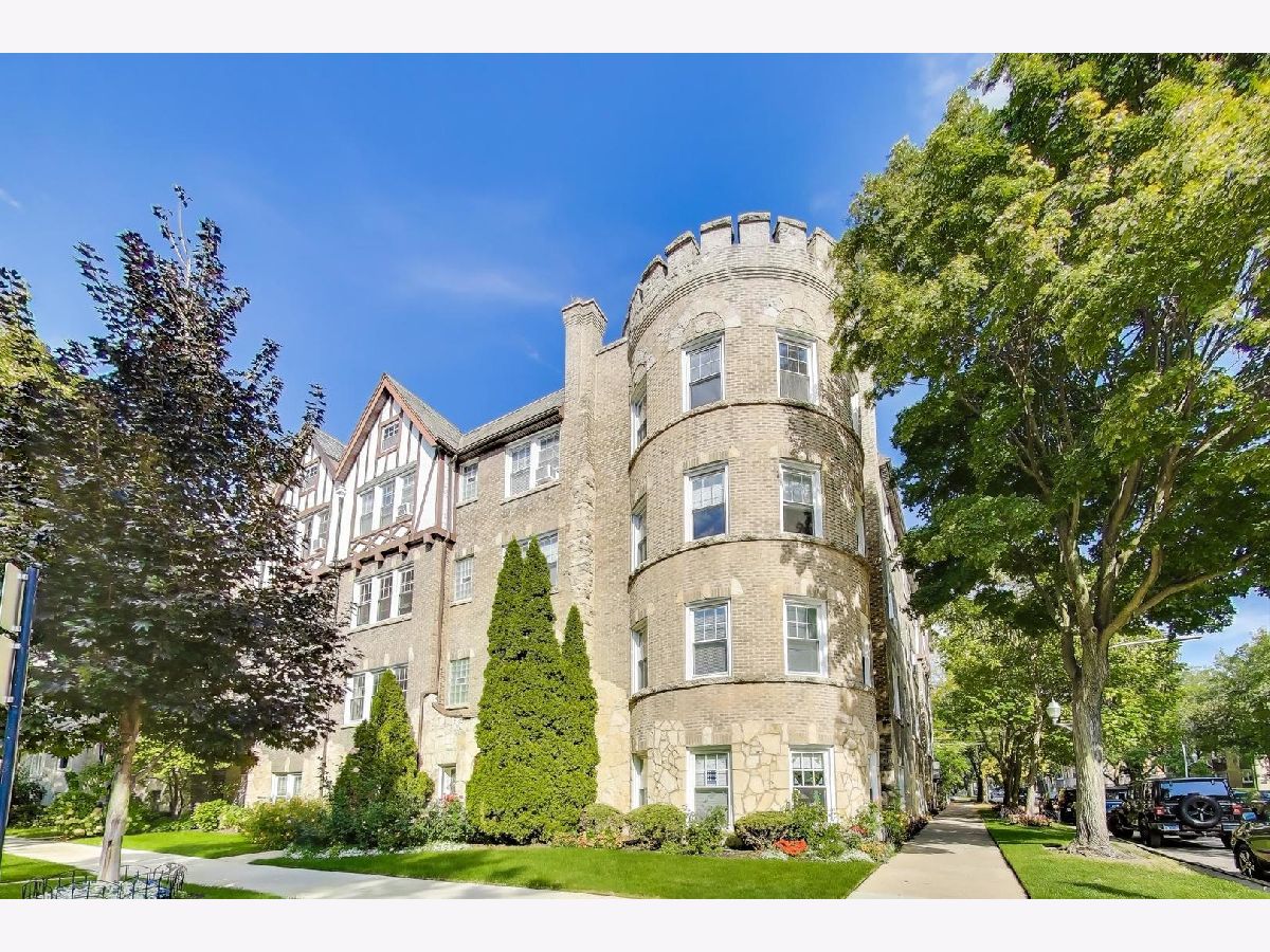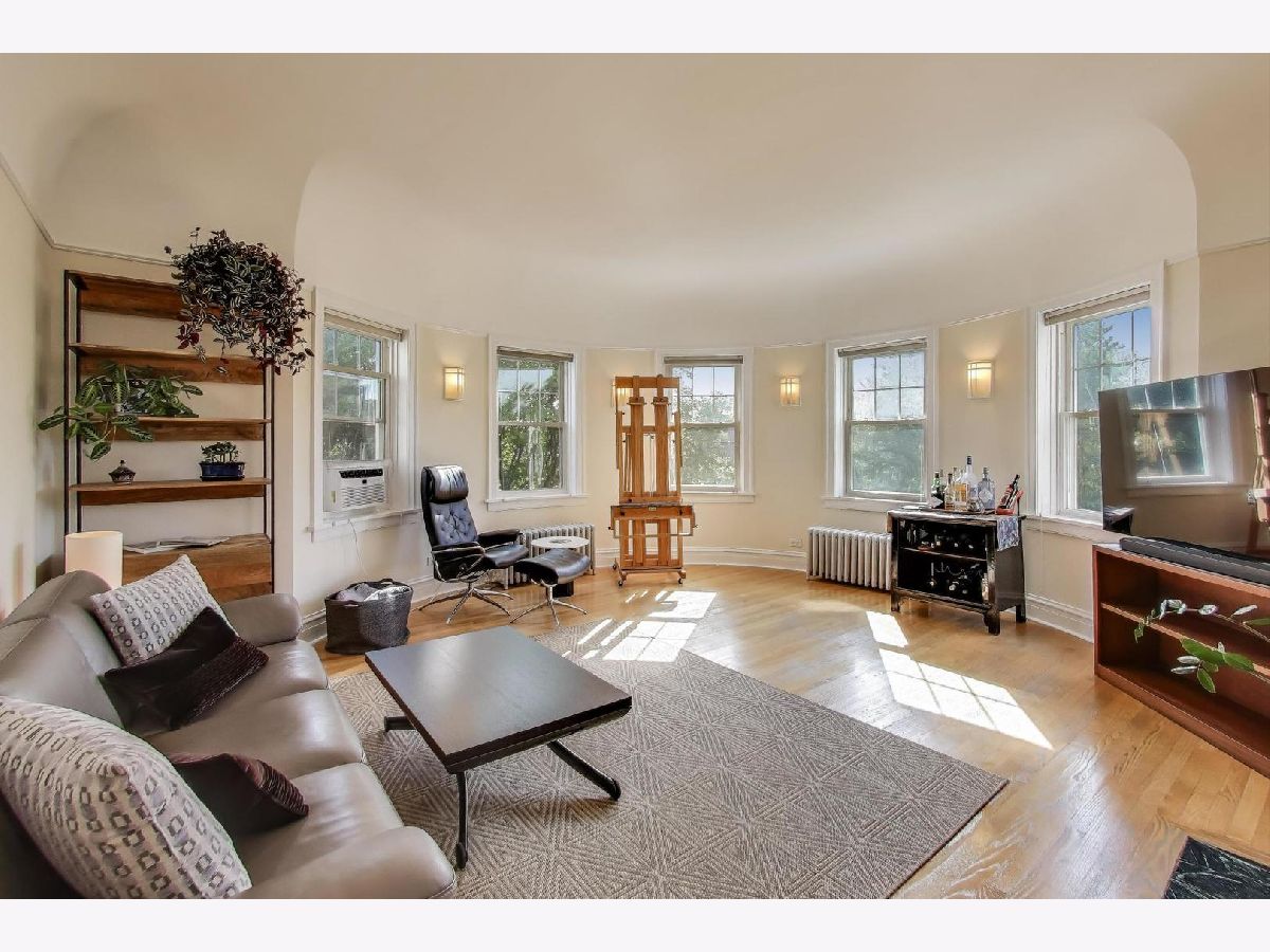 This stunning and dramatic top-floor corner penthouse offers a unique blend of vintage 1930s art deco style and modern amenities. The home welcomes you with an oversized entry foyer that leads into a spacious, rounded living room. Designed to impress, the living room boasts panoramic views to the East, South, and West, filling the space with natural light throughout the day. The vintage character of this home is highlighted by cathedral ceilings, a classic fireplace, and timeless woodwork. Gleaming hardwood floors run throughout the living areas and both bedrooms, and the unit features the tallest ceilings in the building, even taller than those on lower floors. This distinctive corner home exudes an undeniable air of grandeur, offering generous room sizes that enhance the sense of space and luxury. The primary bedroom is generously sized, providing plenty of room for multiple dressers and a comfortable home office setup. The separate formal dining room is a true showstopper, bathed in sunlight and designed for entertaining and memorable meals. The kitchen features 42-inch maple cabinetry and plenty of workspace, making it both functional and stylish. Enjoy morning coffee or a fabulous meal on the rear deck, perfect for relaxing or entertaining guests. Additional conveniences include a laundry closet with a newer stackable LG washer and dryer, as well as a dedicated storage room in the basement. Located just steps from dining, Warren Park, Indian Boundary Park, CTA Morse train station and Rogers Park METRA station. The monthly assessments include heat, hot and cold water, Gas, common insurance, exterior maintenance, lawn care, scavenger, and snow removal. The penthouse home offers easy access to both city amenities and green spaces. Downtown Evanston is only a 10-minute drive away, making this home ideally situated for both convenience and lifestyle.