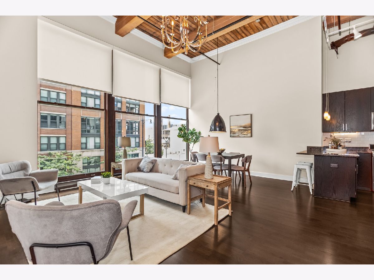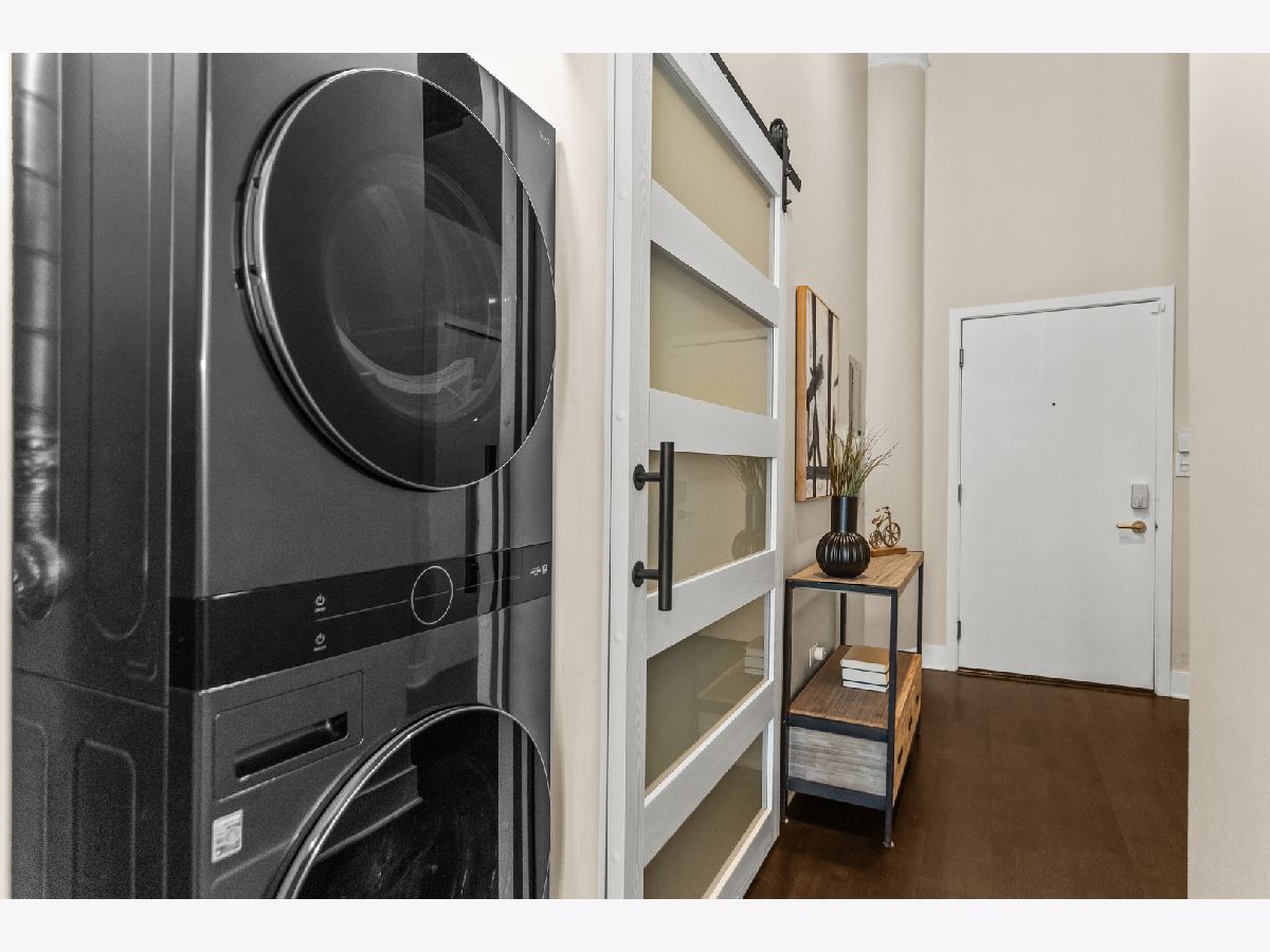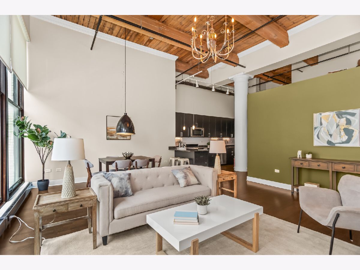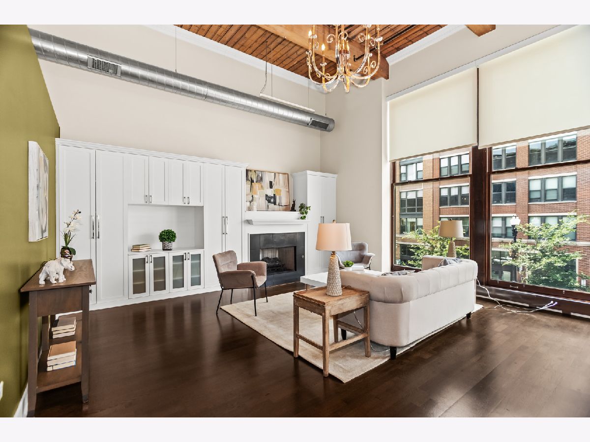 HOT, RARELY AVAILABLE MOTOR ROW LOFTS! Live in style at this standout loft in the original Cadillac building in the South Loop! This two bedroom combines historic charm with smart modern upgrades-featuring soaring 16' timber ceilings and a flexible, open layout. A spacious foyer with generous closet space welcomes you into the unit. The kitchen is equipped with granite countertops, high-end stainless steel appliances (including a premium microwave), bar seating, dark modern cabinetry, and crisp white subway tile. Track lighting was updated in 2020, and the kitchen and den received a fresh refresh in July 2025. The open-concept living/dining area is bathed in natural light from floor-to-ceiling windows, complete with custom battery-powered blinds (installed in 2022). The living room features a cozy fireplace, custom built-ins with bar area, and three 14' functional windows-no screens, for a clean, uninterrupted view. The spacious primary bedroom includes a large walk-in closet and a full wall of built-ins. The bathroom offers glass shower doors and a tub/shower combo. The second bedroom is perfect for a home office or guest space. Additional upgrades include: Brand new In-Unit front-loading washer & dryer (2025), tucked behind a charming sliding farmhouse door for style and space-saving. HVAC replaced in December 2023, with a 5-year transferrable warranty. Entire unit painted in 2023 for a fresh, modern look. Enjoy city views from the rooftop deck. Premium first-floor deeded parking space (additional $25,000) in the attached heated garage. You'll also have tall cage storage, access to a bike room, and extra building storage. Investor-friendly and pet-friendly, with no rental restrictions. HOA includes: water, garbage, internet, cable, garage and elevator maintenance. Located just two blocks from the Green Line and minutes from downtown, lakefront paths, coffee shops, breweries, and expressways-this is a rare gem you don't want to miss!