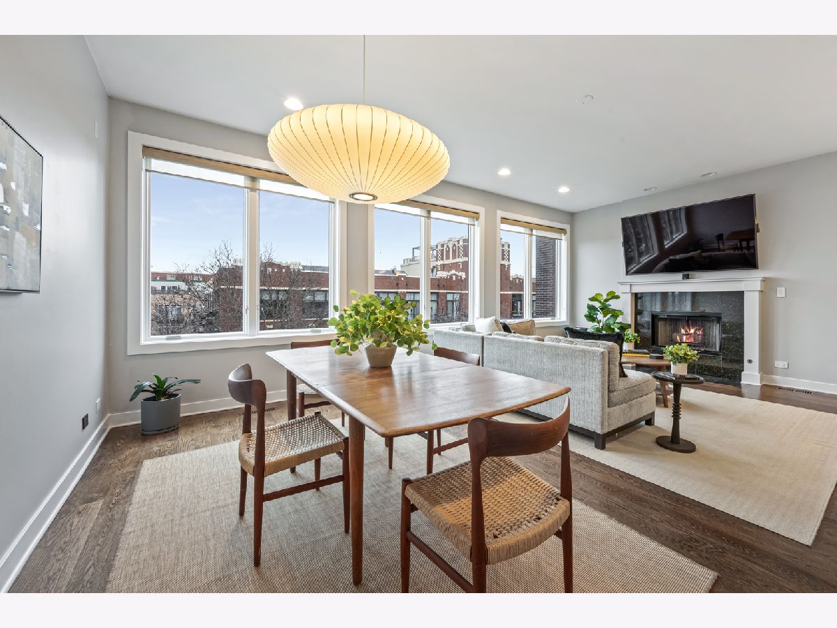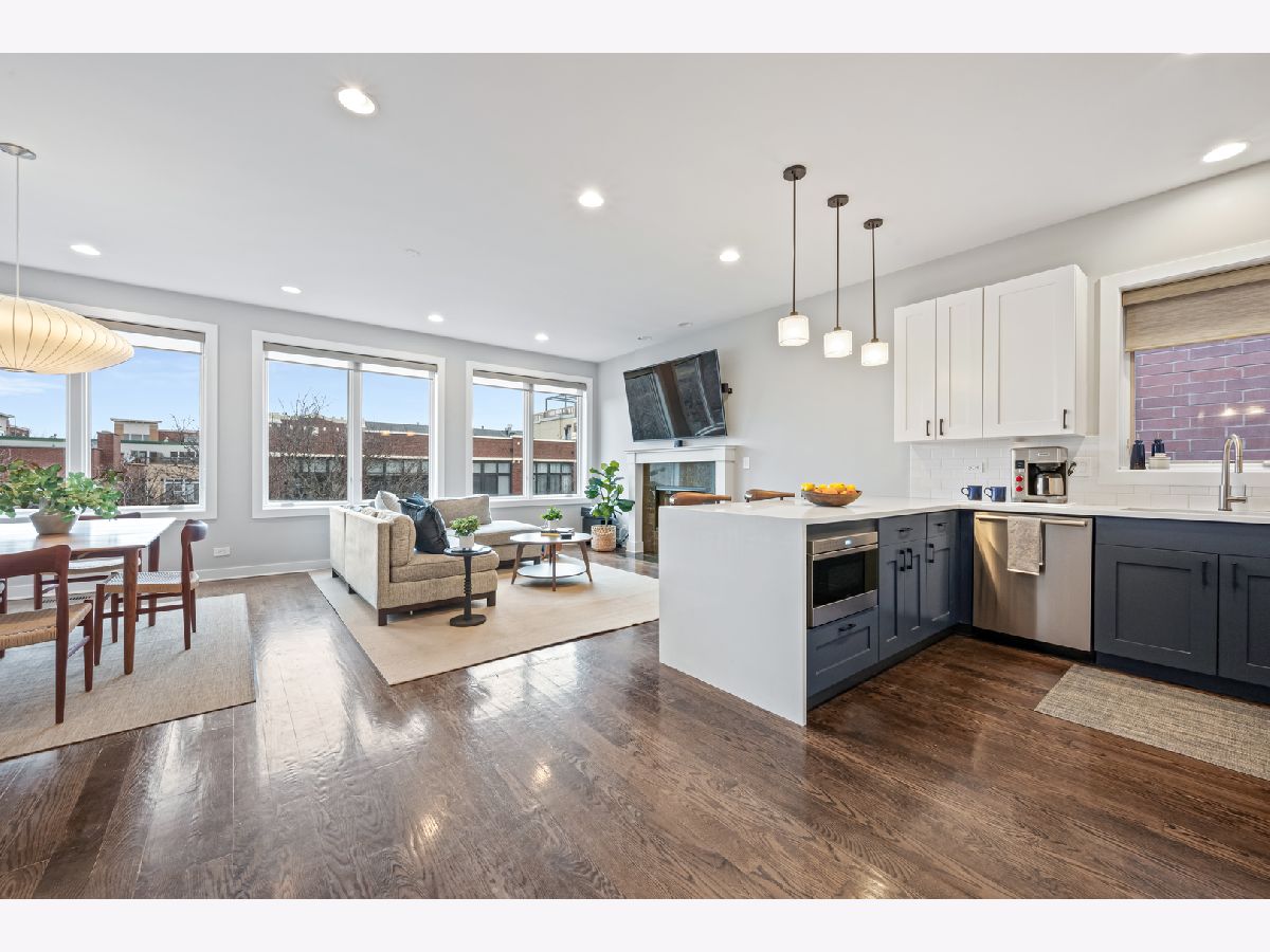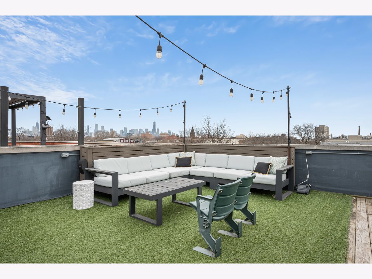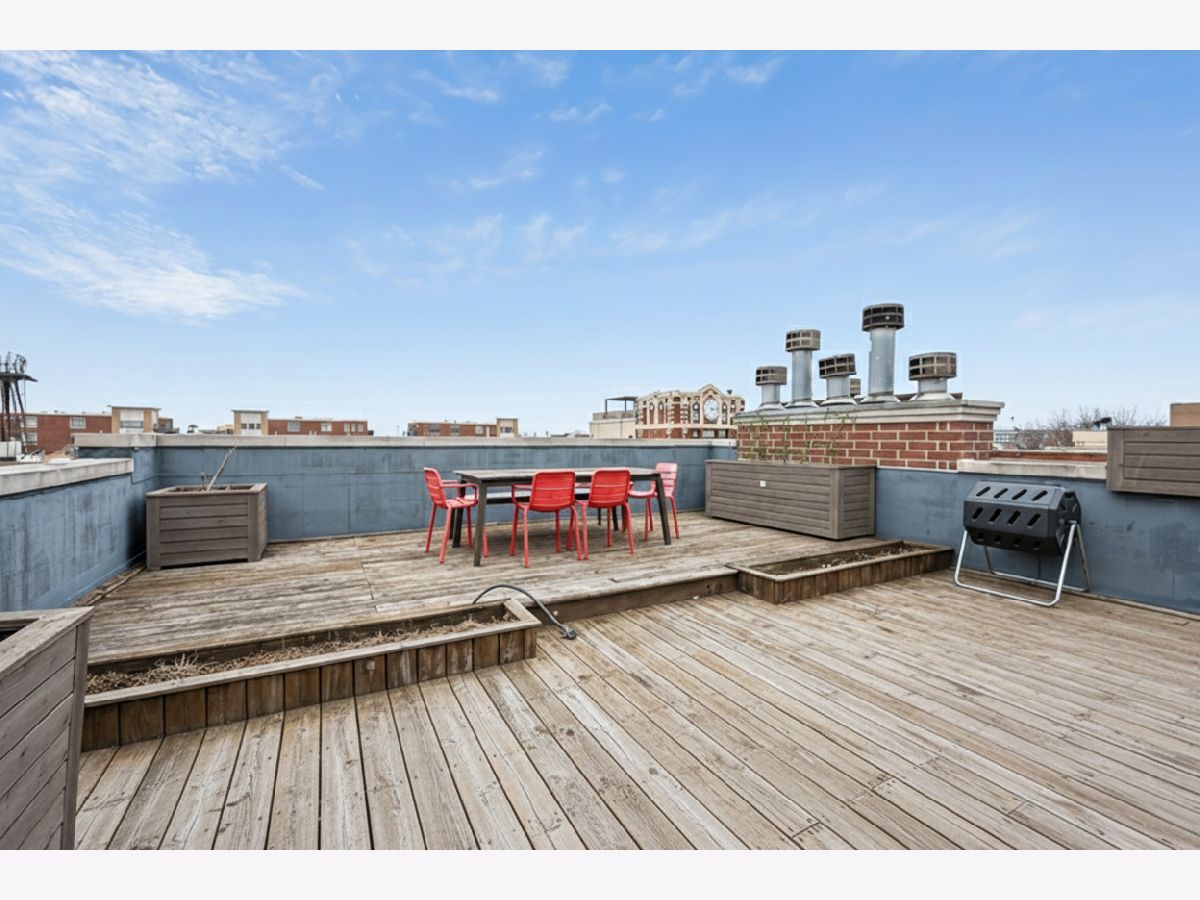 This extra-wide 2-bedroom, 2-bath home combines thoughtful updates with comfortable design in one of Chicago's most sought-after neighborhoods. A wall of windows fills the main living and dining area with natural light, highlighting hardwood floors and a gas fireplace that anchors the space. The updated kitchen blends clean finishes and functionality, featuring two-tone cabinetry, waterfall quartz countertops, a subway-tile backsplash, and premium appliances, including a Wolf range-ideal for everyday living and entertaining alike. The primary suite offers a quiet retreat with a tray ceiling, an organized walk-in closet, a Juliet balcony, and a spacious bath with a double vanity, soaking tub, and walk-in shower. Upstairs, the private rooftop deck expands the living space outdoors. Fully built out and designed for gathering, it includes an outdoor kitchen with a wet bar, built-in planters, multiple lounge areas, and open skyline views - a rare opportunity for city living with room to host, relax, and unwind. Perfectly positioned near the Damen and Milwaukee corridors, this home places you just steps from Bucktown favorites - boutique shopping, chef-driven restaurants, neighborhood coffee shops, and everyday conveniences. Enjoy easy access to the 606 Trail, Holstein Park, and the vibrant energy that defines this highly sought-after pocket of the neighborhood. A covered, assigned parking space with access via a heated driveway is included for added convenience.