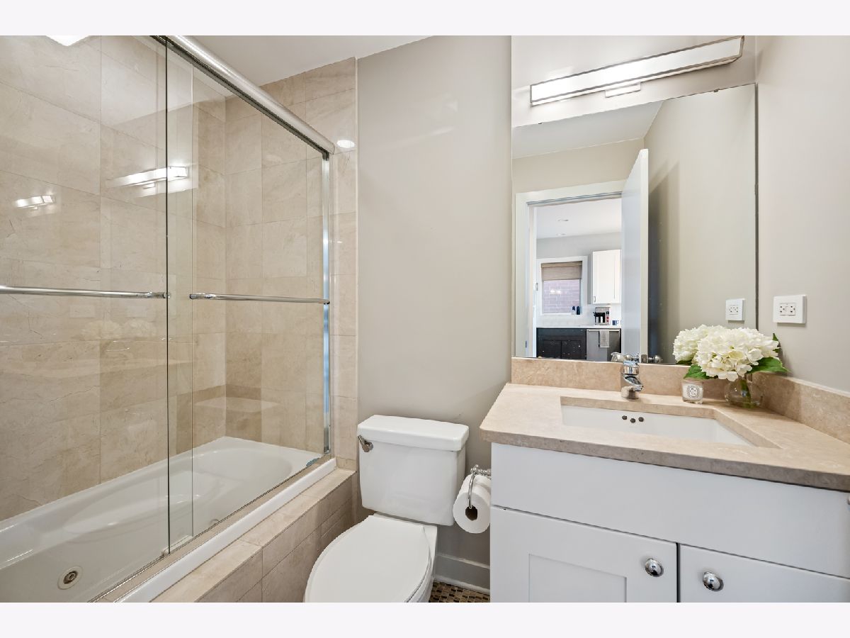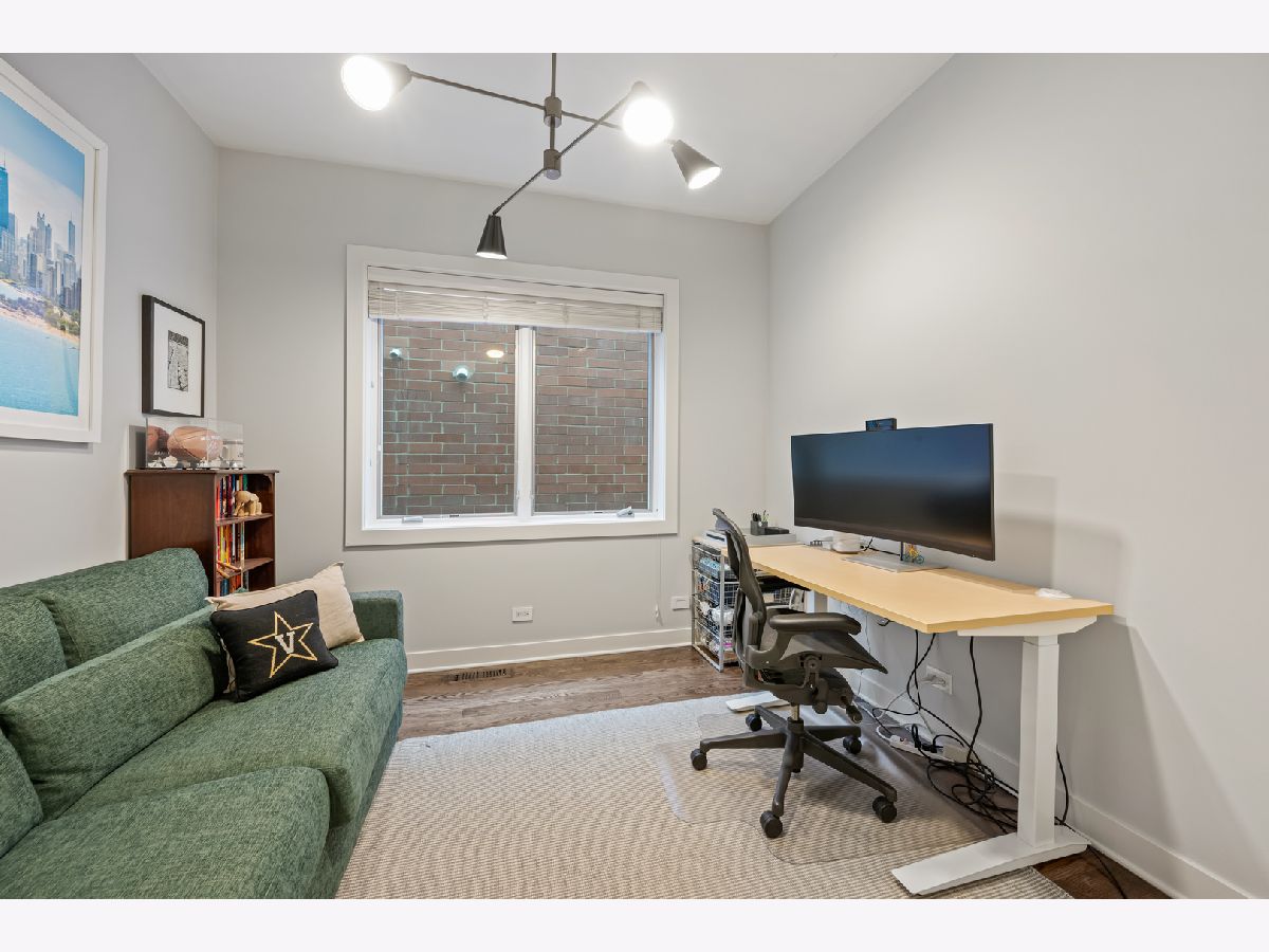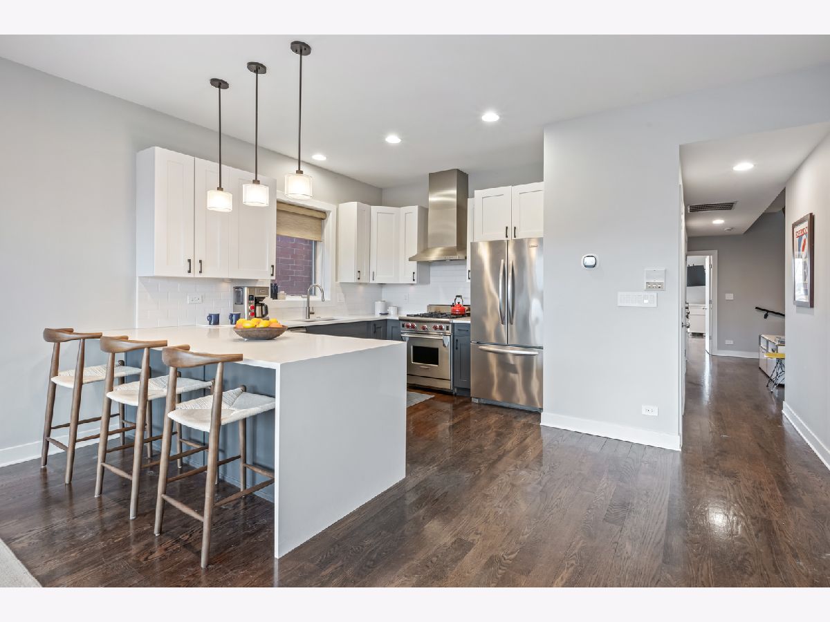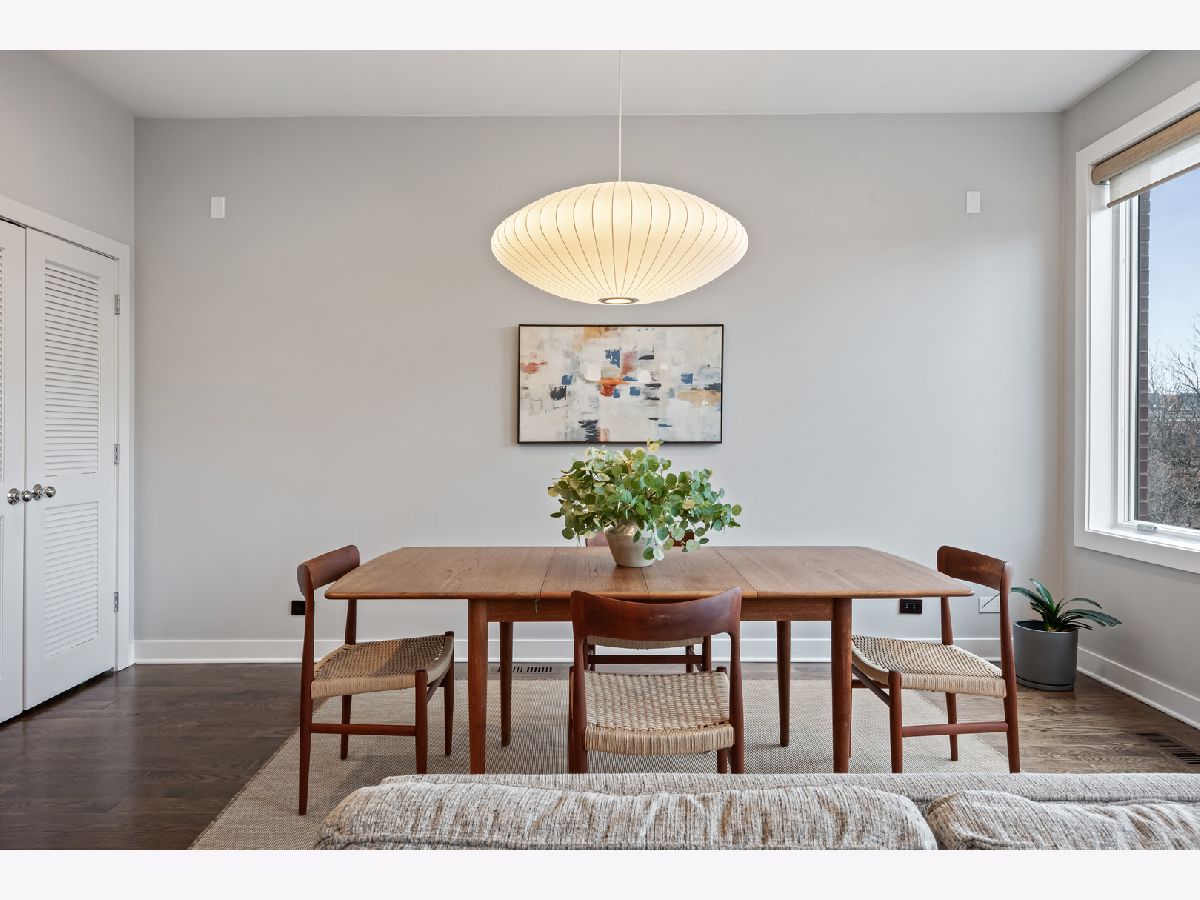 This extra-wide 2-bedroom, 2-bath home combines thoughtful updates with comfortable design in one of Chicago's most sought-after neighborhoods. A wall of windows fills the main living and dining area with natural light, highlighting hardwood floors and a gas fireplace that anchors the space. The updated kitchen blends clean finishes and functionality, featuring two-tone cabinetry, waterfall quartz countertops, a subway-tile backsplash, and premium appliances, including a Wolf range-ideal for everyday living and entertaining alike. The primary suite offers a quiet retreat with a tray ceiling, an organized walk-in closet, a Juliet balcony, and a spacious bath with a double vanity, soaking tub, and walk-in shower. Upstairs, the private rooftop deck expands the living space outdoors. Fully built out and designed for gathering, it includes an outdoor kitchen with a wet bar, built-in planters, multiple lounge areas, and open skyline views - a rare opportunity for city living with room to host, relax, and unwind. Perfectly positioned near the Damen and Milwaukee corridors, this home places you just steps from Bucktown favorites - boutique shopping, chef-driven restaurants, neighborhood coffee shops, and everyday conveniences. Enjoy easy access to the 606 Trail, Holstein Park, and the vibrant energy that defines this highly sought-after pocket of the neighborhood. A covered, assigned parking space with access via a heated driveway is included for added convenience.